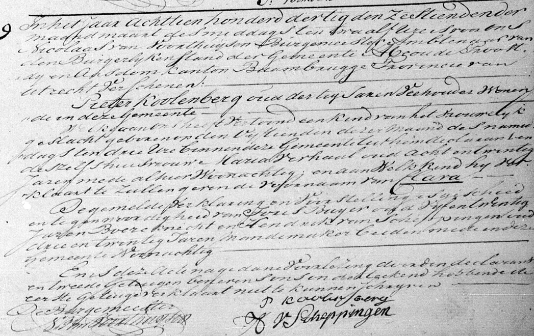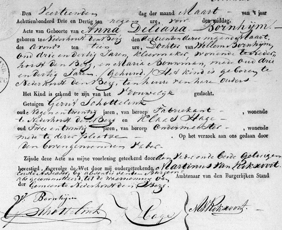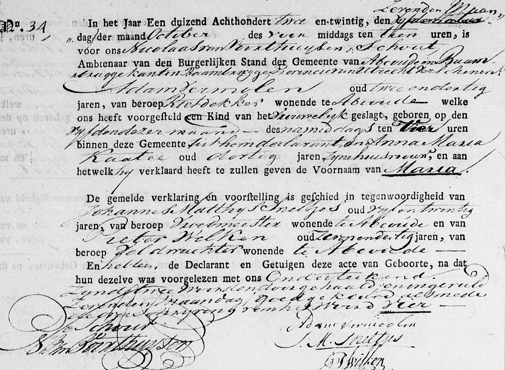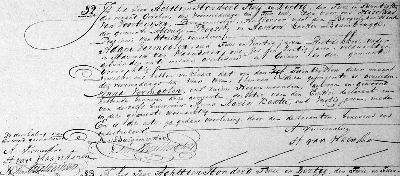 | 9. | v | Johanna (Anna) VERMOOLEN [7493]. Geb. op 26-12-1831 te Abcoude-Proostdij (bron: BS Abcoude-Proostdij). Overl. op 20-10-1832 te Abcoude-Proostdij, 299 dagen oud (bron: BS Abcoude-Proostdij). |