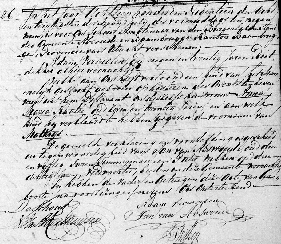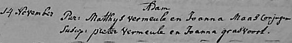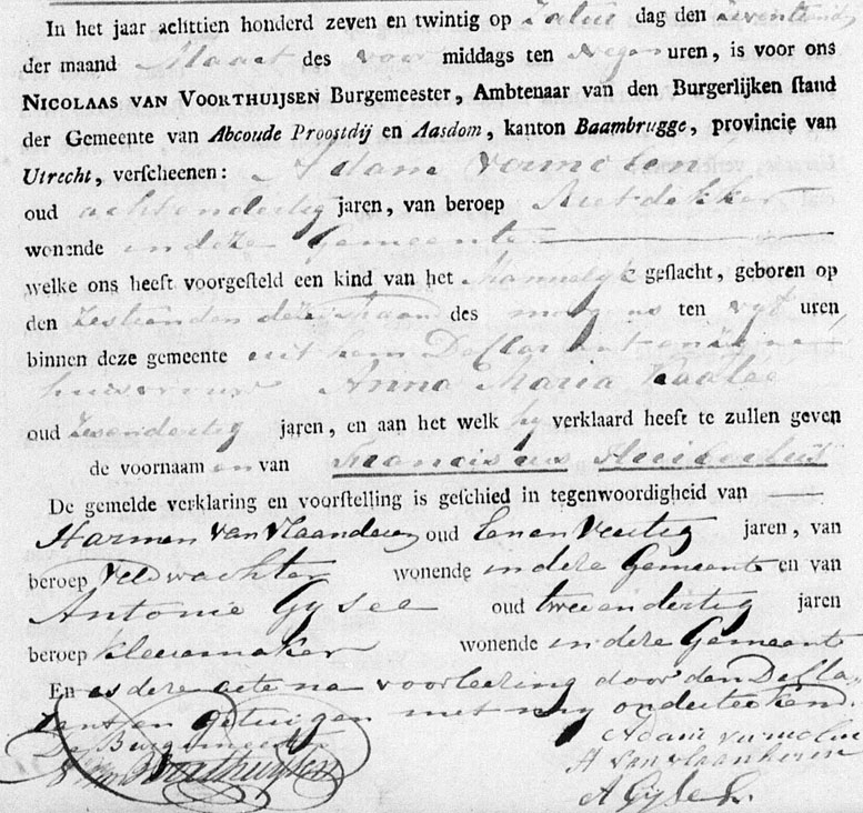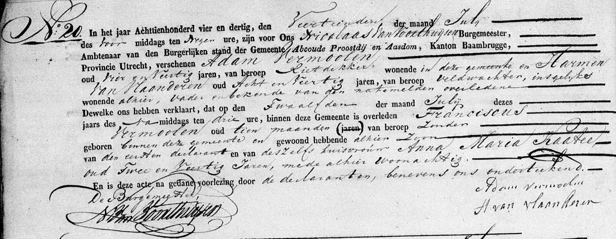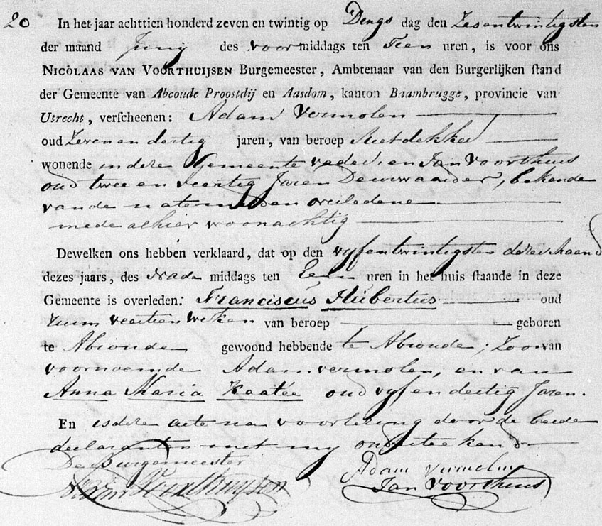 | 7. | m | Franciscus Hubertus (Franciscus Hubertus) VERMOOLEN [7488]. Geb. op 16-03-1827 te Abcoude-Proostdij (bron: BS Abcoude-Proostdij). Overl. op 25-06-1827 te Abcoude-Proostdij, 101 dagen oud (bron: BS Abcoude-Proostdij). |
