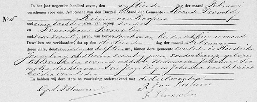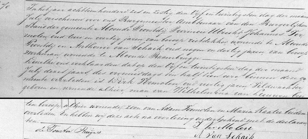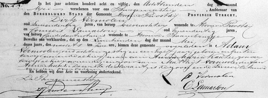 | 6. | m | Dirk (Dirk) VERMOOLEN [7495], veldwachter. Geb. op 06-11-1825 te Abcoude-Proostdij (bron: BS Abcoude-Proostdij). Overl. op 25-07-1866 te Abcoude-Proostdij op 40-jarige leeftijd (bron: BS Abcoude-Proostdij). Otr. [2468] ? te ? Tr. op 28-jarige leeftijd op 13-07-1854 te Leimuiden (bron: BS Leimuiden). Echtgenote is Wilhelmina (Wilhelmina) van LEEUWEN [7496], 20 jaar oud. Geb. op 30-04-1834 te Leimuiden (bron: BS Leimuiden). Overl. op 11-01-1867 te Abcoude-Proostdij op 32-jarige leeftijd (bron: BS Abcoude-Proostdij). Dr. van Christianus (Christianus) van LEEUWEN [7497] en Geertruida (Geertruida) ZWARTENDIJK [7498]. Woonplaatsen na zijn verlaten van het ouderlijkhuis te _: - Op 12-05-1853 Amsterdam - (bron: ?) Woonplaatsen na hun huwelijk: - Op __-__-____ Amsterdam - Op __-12-1855 Nieuwer Amstel - 50, 42 (bron: bevolkingsregister Nieuwer Amstel 1850-1860 inv nr 1) - Op __-__-____ Leimuiden - - Op __-__-18__ Abcoude Proostdij - 85 (bron: bevolkingsregister Abcoude Proostdij 1849-1859 inv nr 585) - Op 31-12-1859 Abcoude Proostdij - Dorpstraat 51a (bron: bevolkingsregister Abcoude Proostdij 1859-1879 inv nr 587) - Op 31-12-1859 Abcoude Proostdij - Achterdijk (bron: bevolkingsregister Abcoude Proostdij 1859-1879 inv nr 587) |