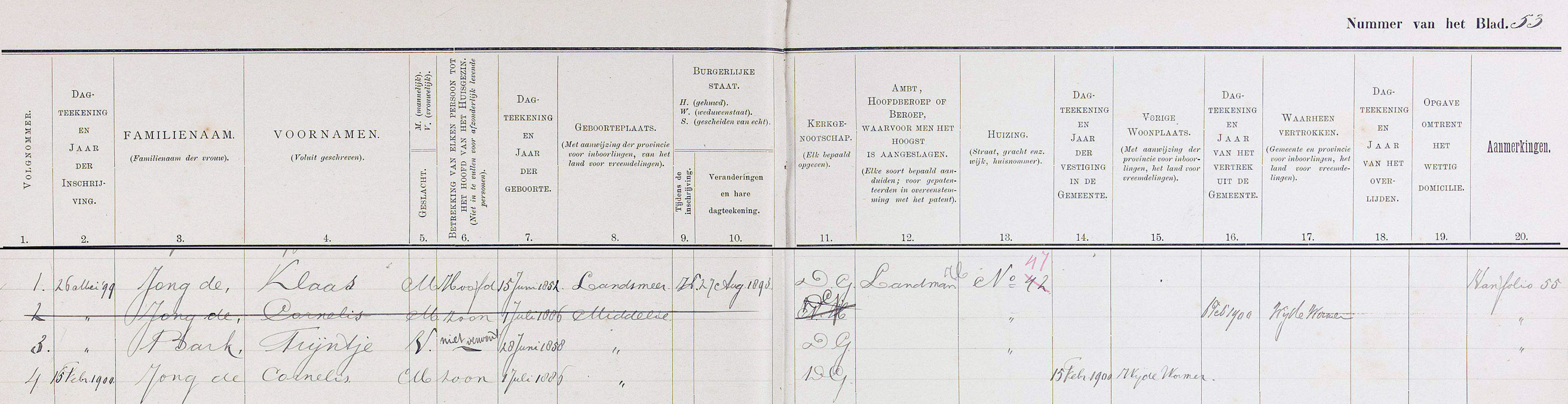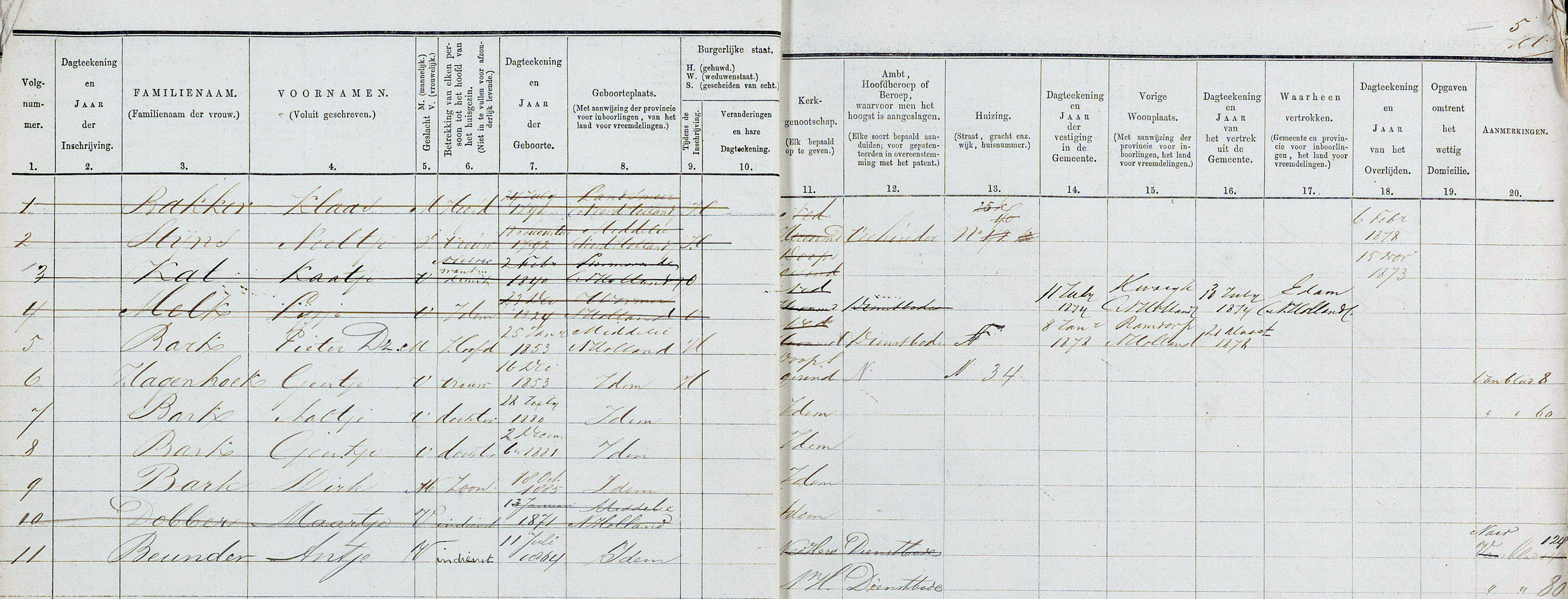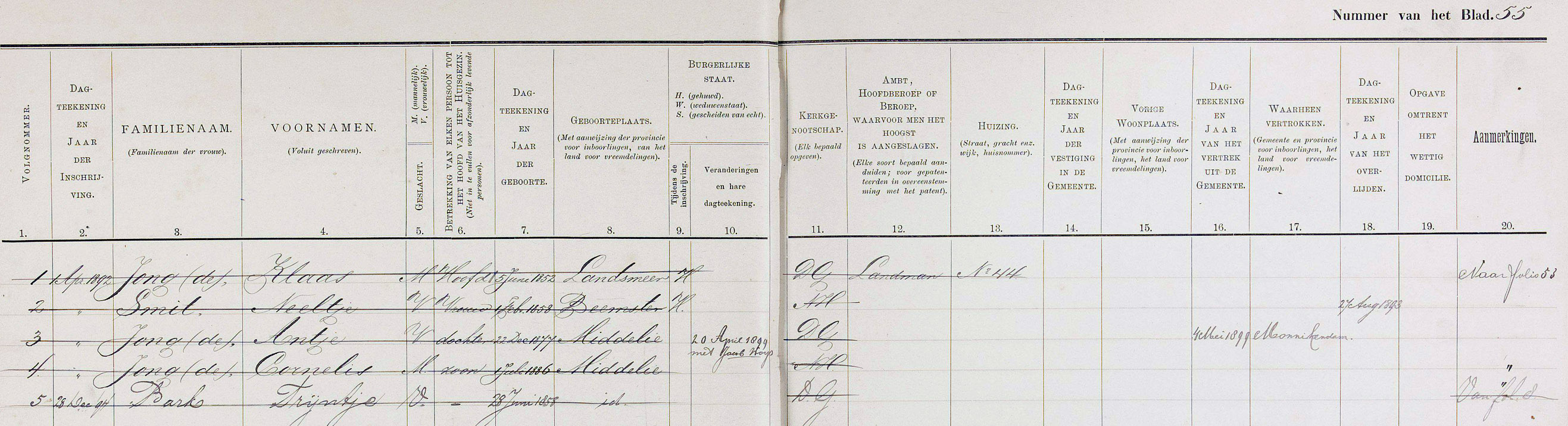 | 6. | v | Trijntje (Trijntje) BARK [1601]. Geb. op 28-06-1858 te Middelie (bron: BS Middelie). Overl. op 18-02-1918 te Middelie op 59-jarige leeftijd (bron: BS Middelie). Woonplaats na haar verlaten van het ouderlijkshuis te Middelie: - Op __-__-____ Middelie - 7, 9 (bij haar zus Wolmoet) (bron: bevolkingsregister Middelie 1862-1892 inv nr 2 + 1892-1900 inv nr 3) - Op 28-12-1897 Middelie - 44 (bron: bevolkingsregister Middelie 1892-1900 inv nr 3) - Op 26-05-1899 Middelie - 42, 47, 50 (bron: bevolkingsregister Middelie 1892-1900 inv nr 3 1900-1920 inv nr 4) |
