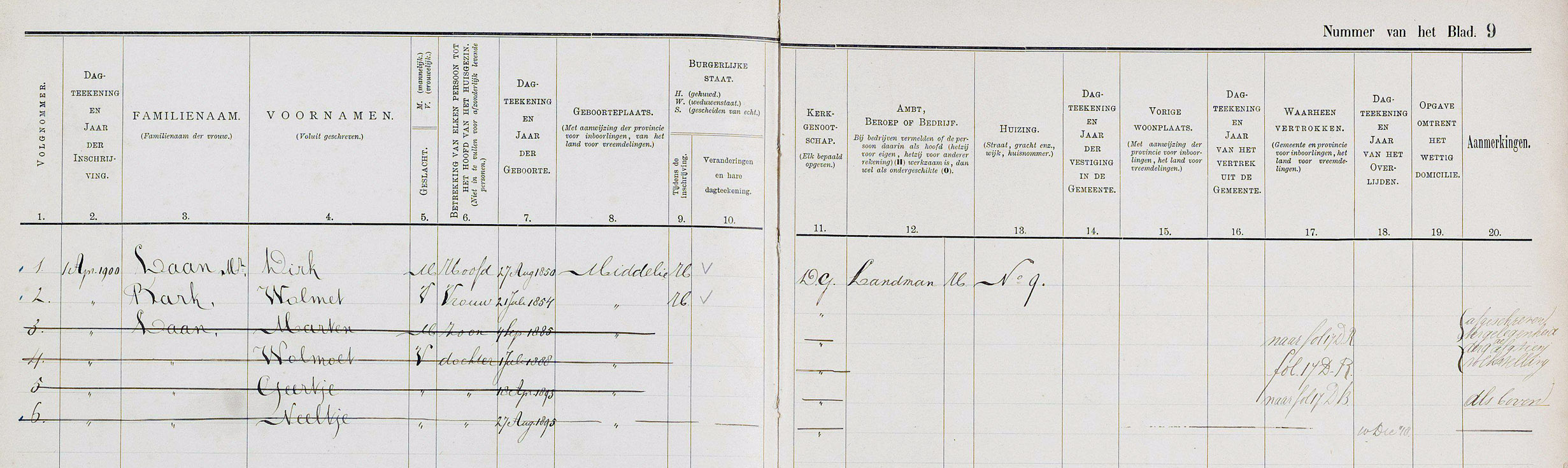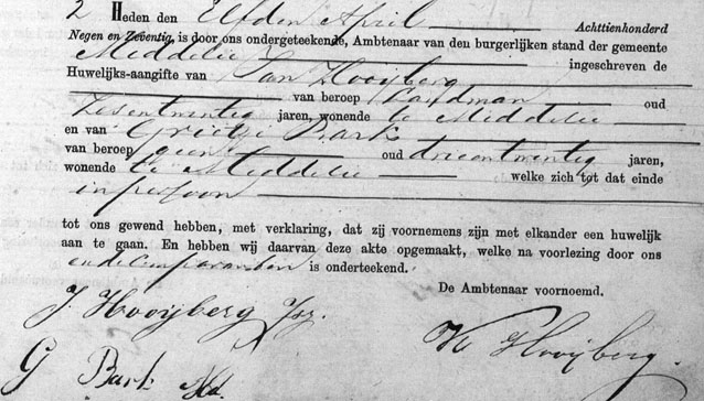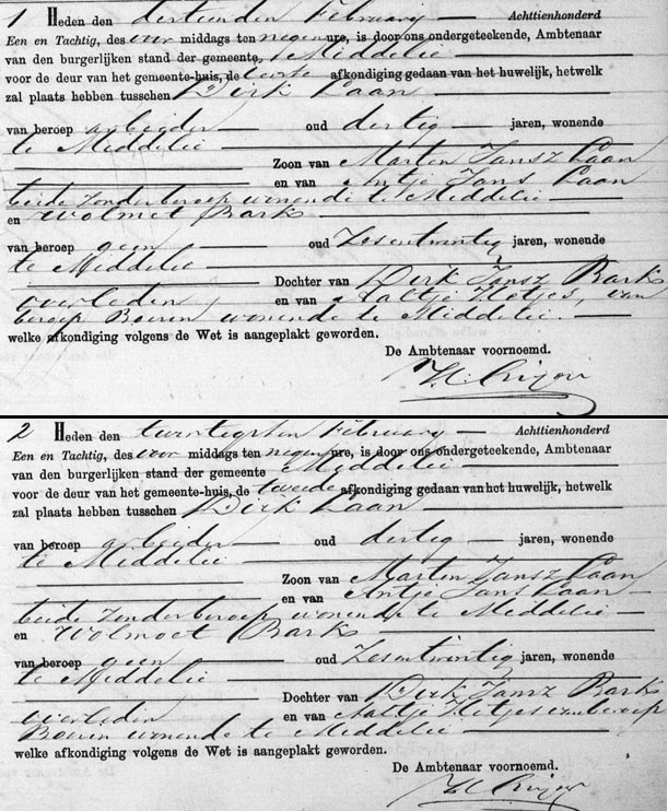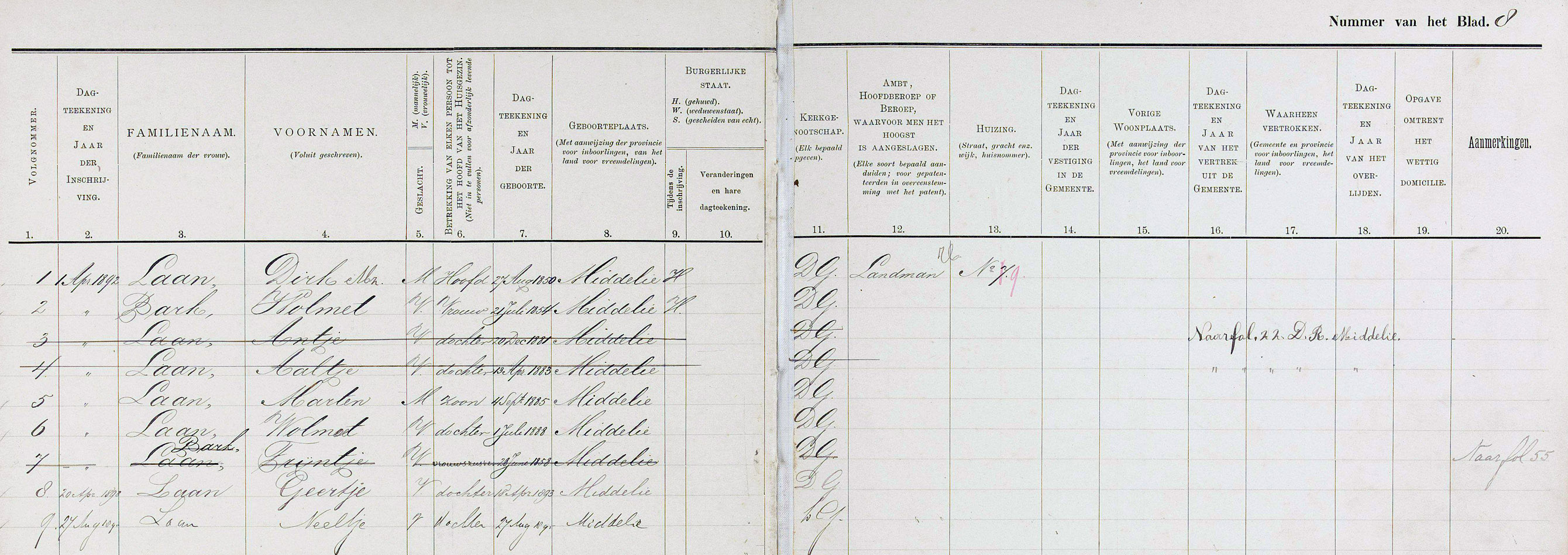| 4. | v | Wolmet (Wolmet) BARK [1600], boerin. Geb. op 21-07-1854 te Middelie (bron: BS Middelie). Overl. op 18-02-1933 te Middelie op 78-jarige leeftijd (bron: BS Middelie). Otr. [4819] op 11-02-1881 te Middelie (bron: BS Middelie). Echtgenoot is Dirk (Dirk) LAAN [15422], 30 jaar oud, arbeider. Geb. op 27-08-1850 te Middelie (bron: BS Middelie). Overl. op 20-01-1928 te Middelie op 77-jarige leeftijd (bron: BS Middelie). Zn. van Maarten (Maarten) Jansz LAAN [15423] en Antje (Antje) Jans LAAN [15424]. Inschrijving militie register Woonplaats na hun huwelijk: - Op __-__-____ Middelie - 7, 9 (bron: bevolkingsregister Middelie 1862-1892 inv nr 2 + 1892-1900 inv nr 3 + 1900-1920 inv nr 4) |