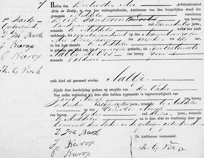 | 7. | v | Aaltje (Aaltje) BARK [1602]. Geb. op 29-06-1863 te Middelie (bron: BS Middelie). Overl. op 12-08-1880 te Middelie op 17-jarige leeftijd (bron: BS Middelie). |