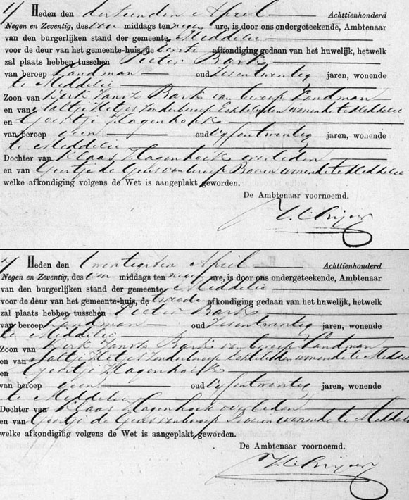 | 3. | m | Pieter (Pieter) BARK [1599], landman. Geb. op 05-01-1853 te Middelie (bron: BS Middelie). Overl. op 25-10-1924 te Middelie op 71-jarige leeftijd (bron: BS Middelie). Inschrijving militie register Otr. [4820] op 11-04-1879 te Middelie (bron: BS Middelie). Echtgenote is Geertje (Geertje) HAGENHOEK [15425], 25 jaar oud. Geb. op 16-12-1853 te Middelie (bron: BS Middelie). Overl. op 15-04-1917 te Middelie op 63-jarige leeftijd (bron: BS Middelie). Dr. van Klaas (Klaas) HAGENHOEK [15426] en Geertje (Geertje) de GEUS [15427]. Woonplaatsen na zijn verlaten van t ouderlijkhuis te Middelie: - Op 10-06-1869 Edam - (bron: bevolkingsregister Edam 1862-1890 inv nr 8) - Op 27-02-1872 Kwadijk - (bron: bevolkingsregister Kwadijk 1862-1892 inv nr 2) - Op 19-08-1872 Wijde Wormer - zuiderweg N29 (bron: bevolkingsregister dienstboden Wijdewormer 1861-1889 inv nr 5) - Op 05/06-02-1873 Edam - (bron: bevolkingsregister Edam 1862-1890 inv nr 8) - Op 12/13-02-1874 Middelie - 3 (ouderlijkhuis) (bron: bevolkingsregister Middelie 1862-1892 inv nr 2) Woonplaatsen na hun huwelijk: - Op __-__-18__ Middelie - 34 (bron: bevolkingsregister Middelie 1862-1892 inv nr 2 + 1892-1900 inv nr 3 + 1900-1920 inv nr 4)) - Op __-__-____ Middelie - 68, 71 (bron: bevolkingsregister Middelie 1900-1920 inv nr 4) |
