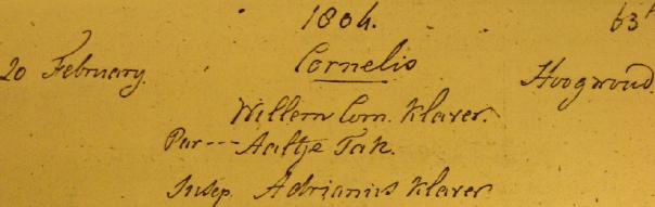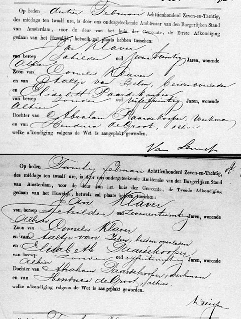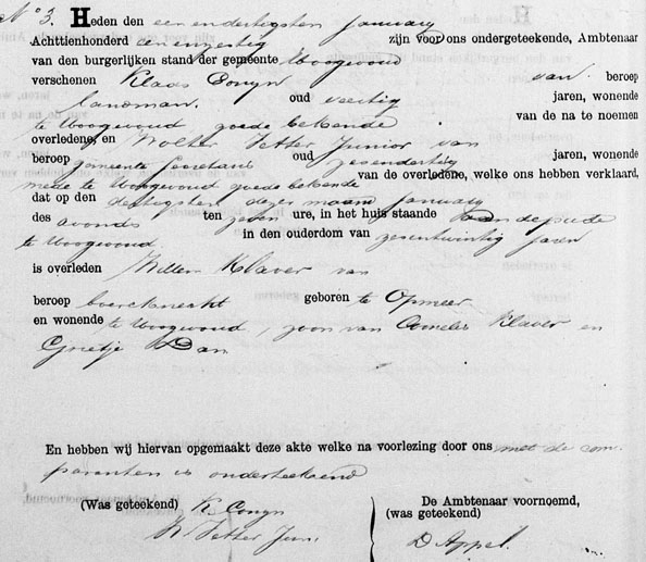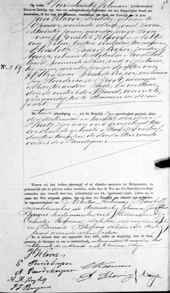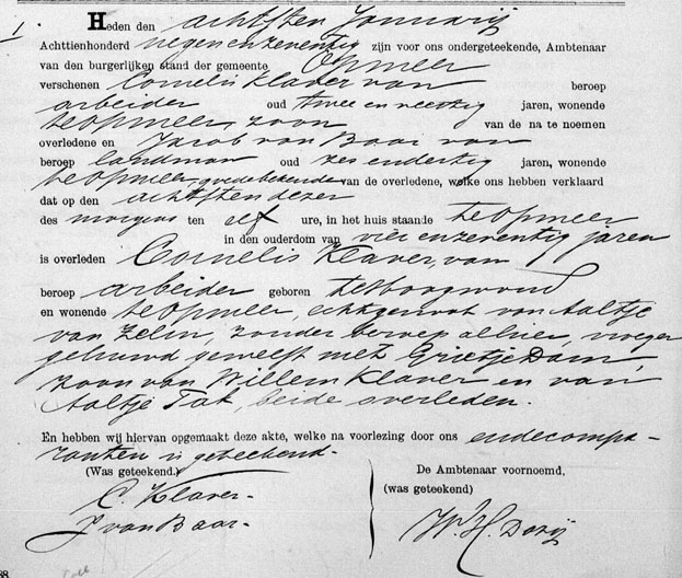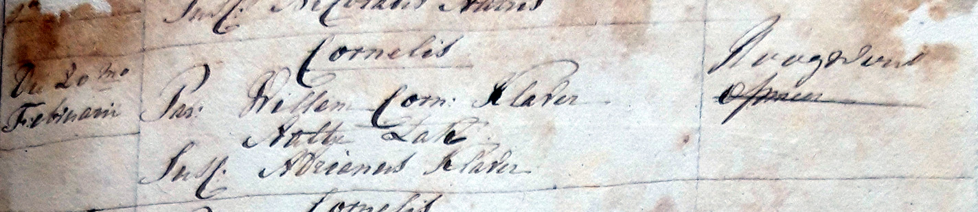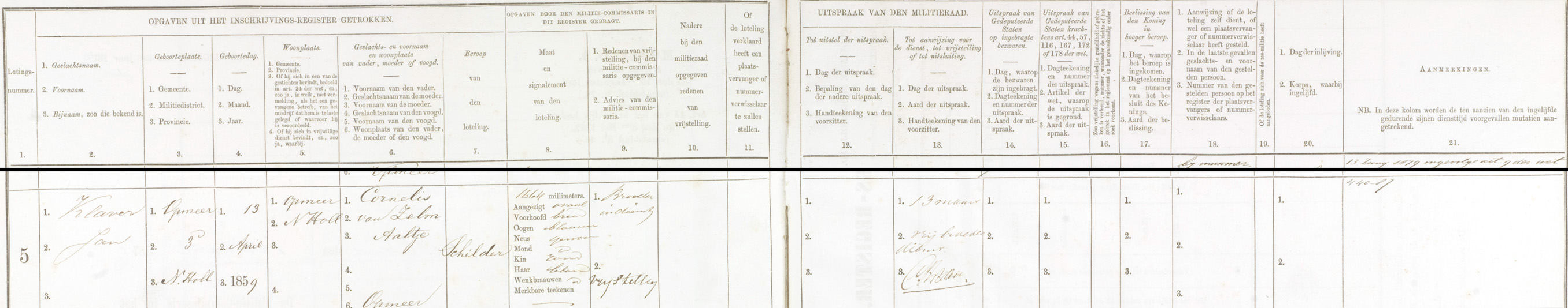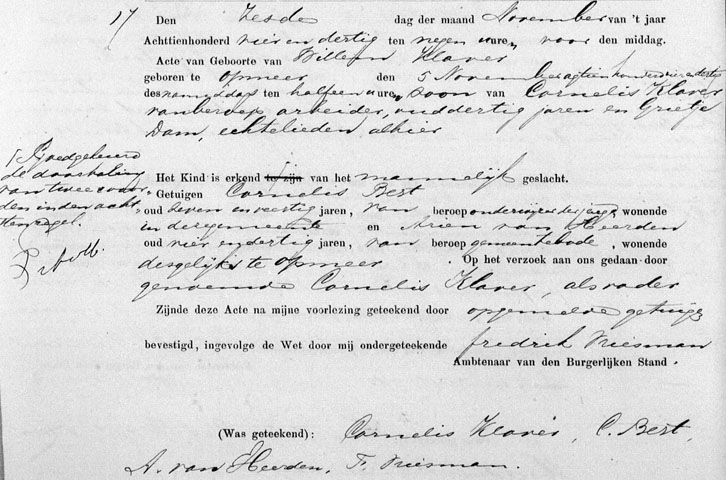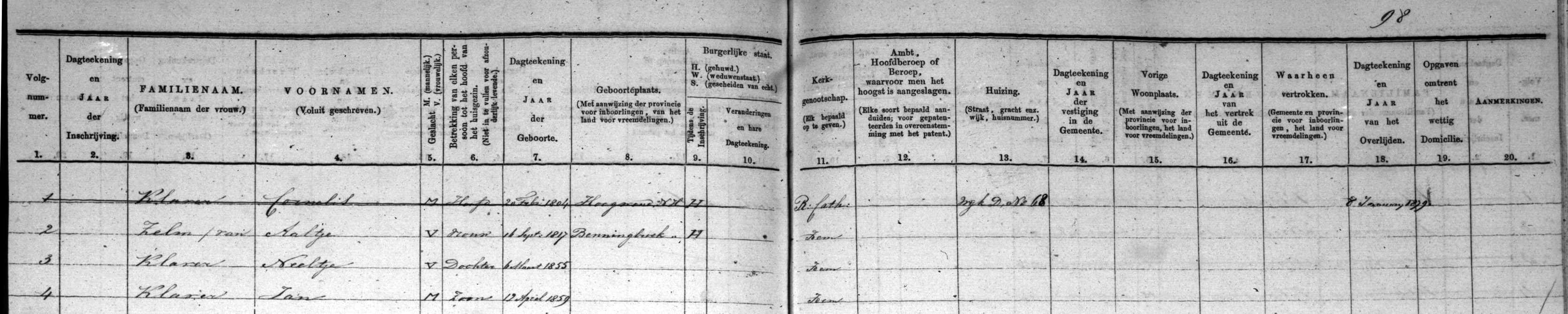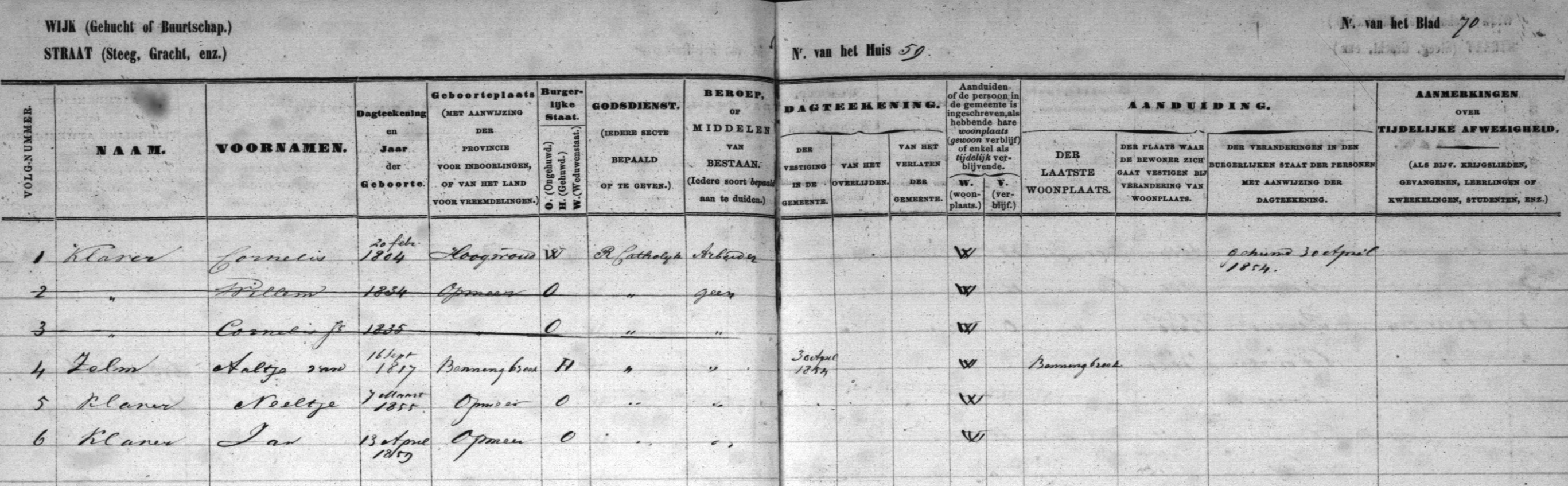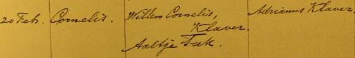 | 1. | m | Willem (Willem) KLAVER [5672]. Geb. op 05-11-1834 te Opmeer (bron: BS Opmeer). Overl. op 30-01-1861 te Hoogwoud op 26-jarige leeftijd (bron: BS Hoogwoud). Woonplaatsen na zijn vertrek uit het huwelijk te _: - Op __-__-____ Opmeer - D 68 (bron: Bevolkingsregister Opmeer 1850-1862 inv nr 4) |