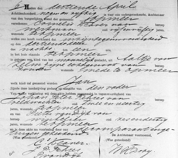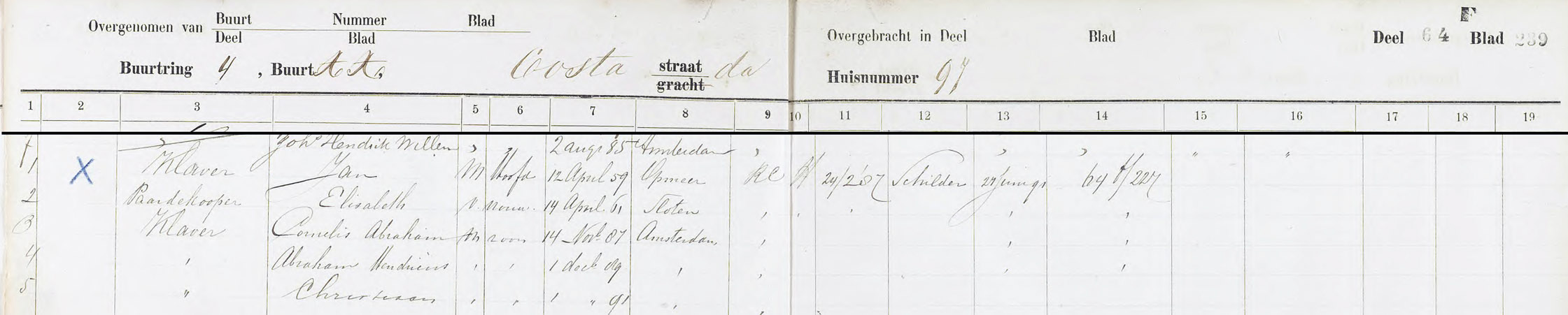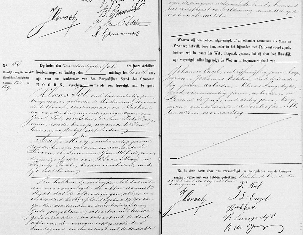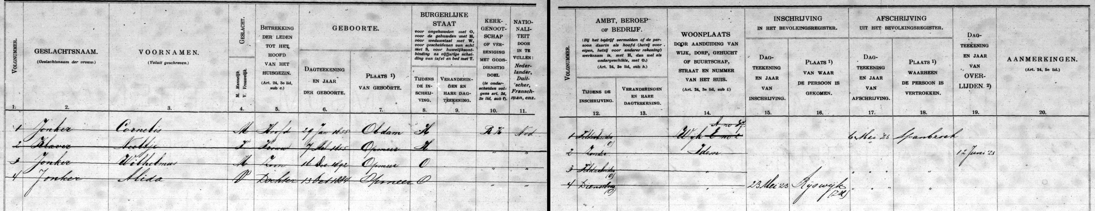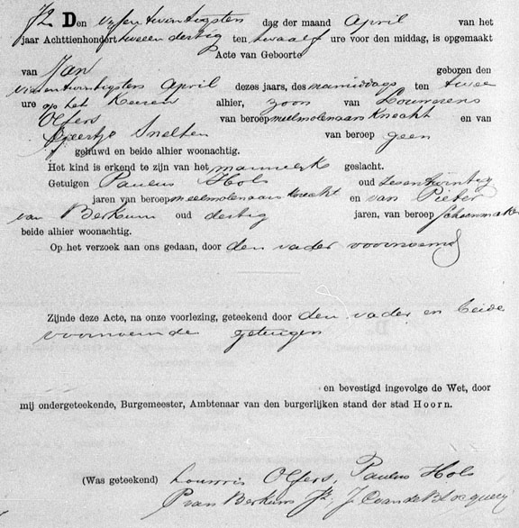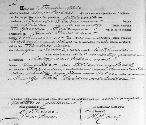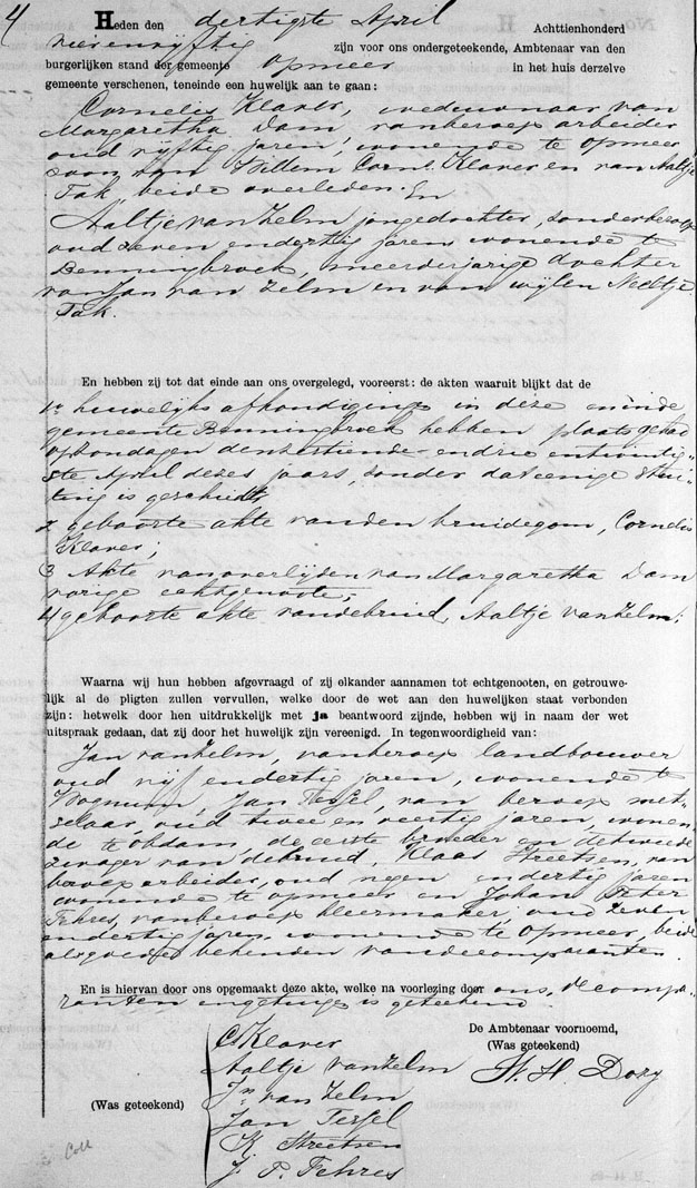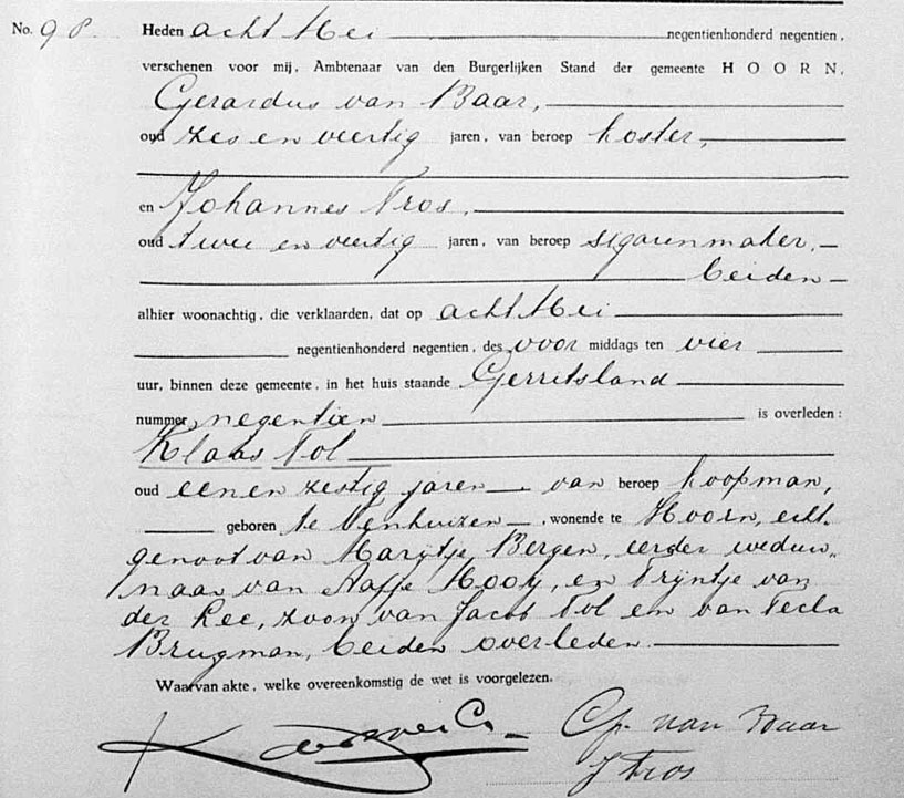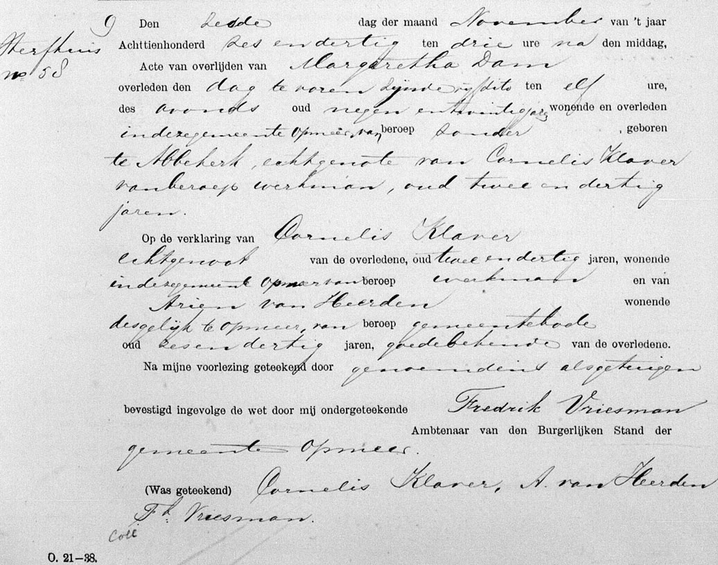 | 1. | m | Willem (Willem) KLAVER [5672]. Geb. op 05-11-1834 te Opmeer (bron: BS Opmeer). Overl. op 30-01-1861 te Hoogwoud op 26-jarige leeftijd (bron: BS Hoogwoud). Woonplaatsen na zijn vertrek uit het huwelijk te _: - Op __-__-____ Opmeer - D 68 (bron: Bevolkingsregister Opmeer 1850-1862 inv nr 4) |