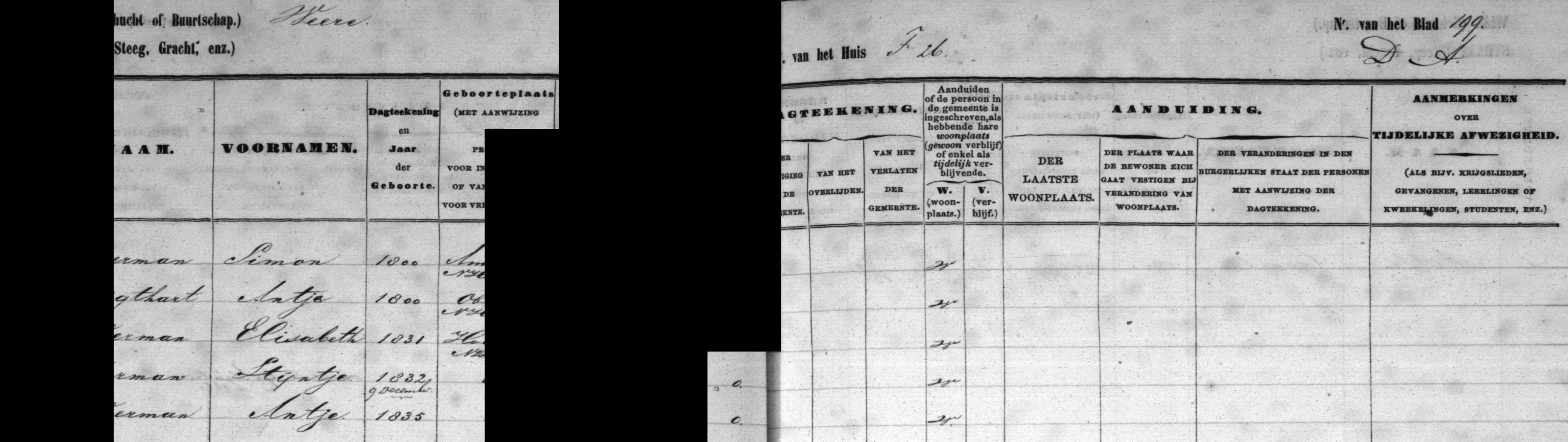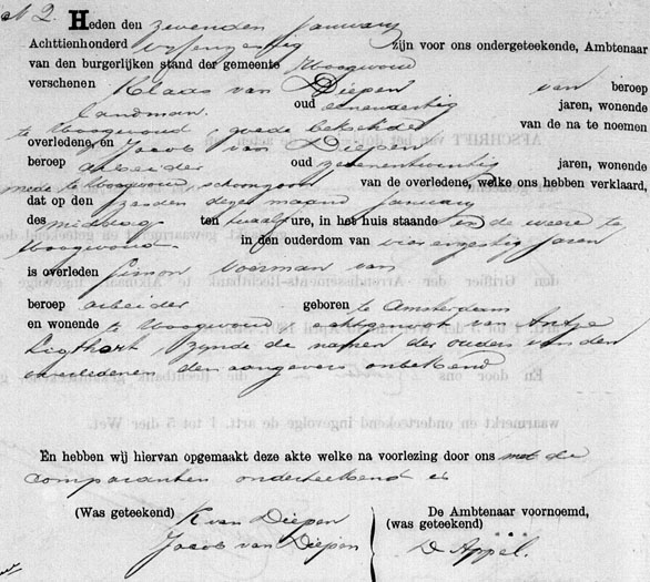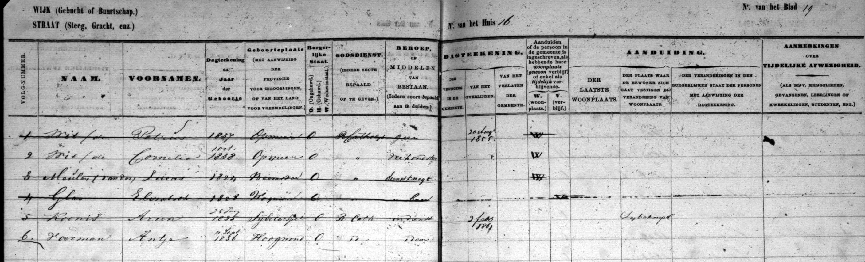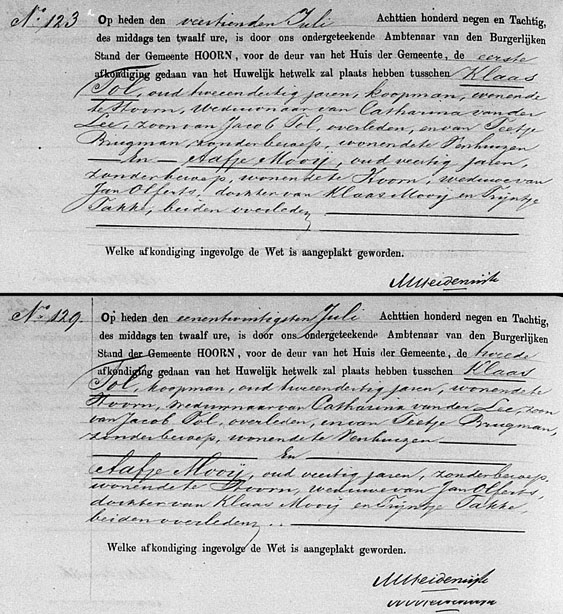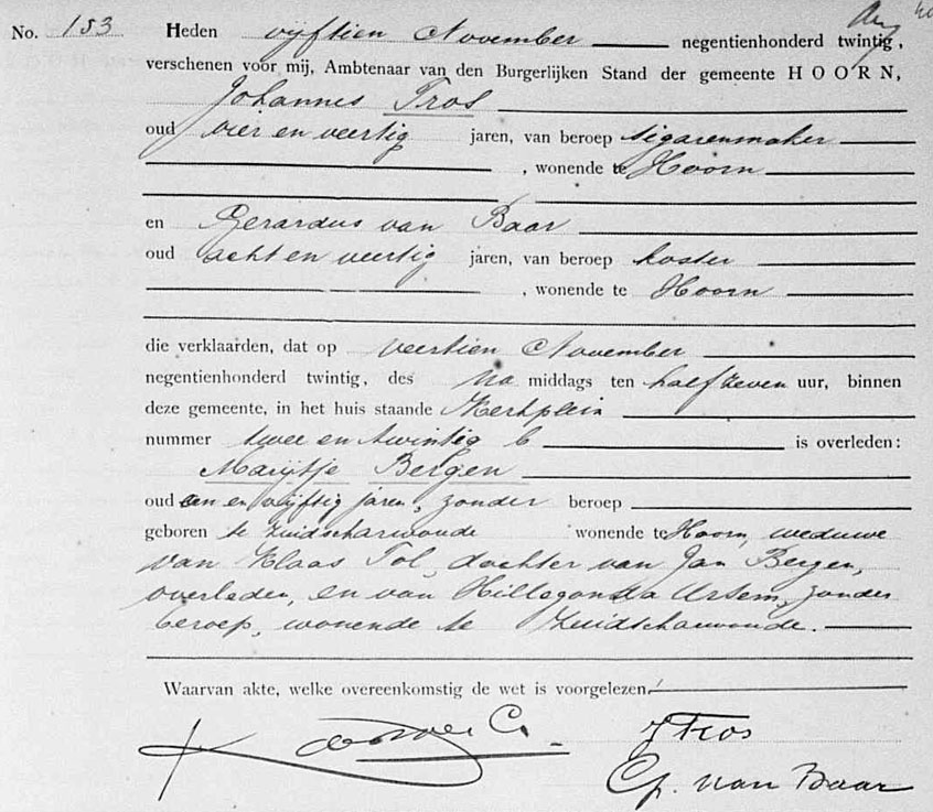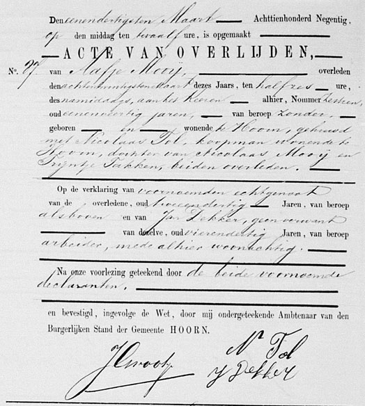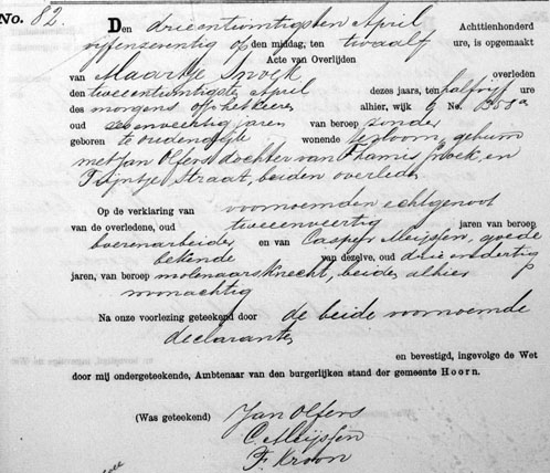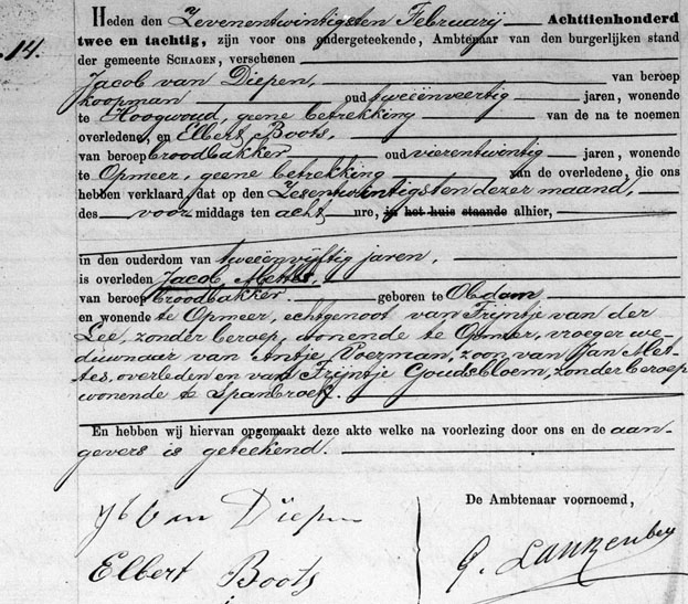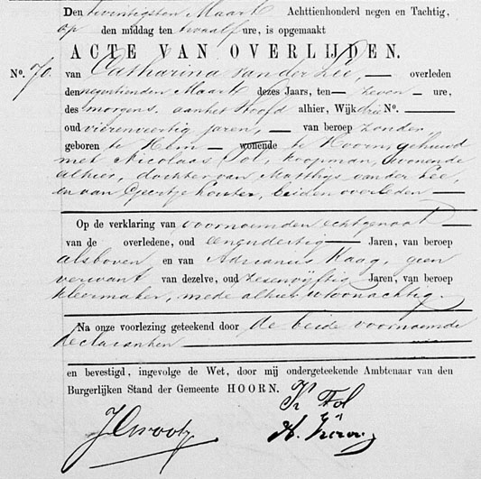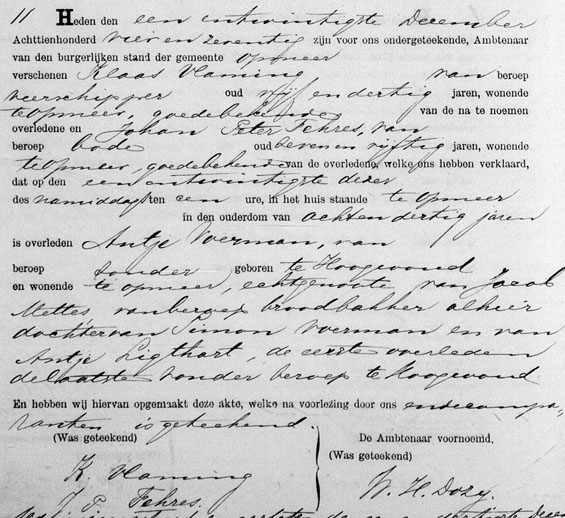 | 4. | v | Antje (Antje) VOERMAN [6440]. Geb. op 11-09-1836 te Hoogwoud (bron: BS Hoogwoud). Overl. op 21-12-1874 te Opmeer op 38-jarige leeftijd (bron: BS Opmeer). Otr. [5990] ? te ? Tr. op 27-jarige leeftijd op 31-12-1863 te Opmeer (bron: BS Opmeer). Echtgenoot is Jacob (Jacob) METTES [19820], 29 jaar oud, broodbakker. Geb. op 23-09-1834 te Spanbroek (bron: BS Spanbroek). Overl. op 26-02-1882 te Schagen op 47-jarige leeftijd (bron: BS Schagen + BS Opmeer). Zn. van Jan (Jan) METTES [19821] en Trijntje (Trijntje) GOUDSBLOEM [19822]. Jacob Mettis hertrouwd: Otr.[6117] op ? te ?, tr. op 18-02-1876 te Opmeer (bron: BS Opmeer) met Trijntje (Trijntje) LEE, VAN DER [20268], geb. op 24-01-1846 te Hem (bron: BS Venhuizen) overl. op 29-03-1889 te Hoorn (bron: BS Hoorn) dr. van Matthijs (Matthijs) LEE, VAN DER [20269] en Geertje (Geertje) Ewouds LAUTER [20270] Trijntje van der Lee is weduwe: Otr.[6120] op ? te ?, tr. op 09-01-1873 te Hoogwoud (bron: BS Hoogwoud) met Johannes (Jan) MEER, VAN DER [20277], geb. op 04-06-1844 te Medemblik (bron: BS Medemblik) overl. op 18-01-1873 te Hoogwoud (BS Hoogwoud) zn. van Sjouke (Sjouke) MEER, VAN DER [20278] en Trijntje (Trijntje) LAKEMAN [20279] Trijntje van der Lee is hertrouwd: Otr.[6121] op ? te ?, tr. op 05-04-1883 te Opmeer (bron: BS Opmeer) met Klaas (Klaas) TOL [20280], geb. op 31-05-1857 te Venhuizen (bron: BS Venhuizen) overl. op 08-05-1919 te Hoorn (bron: BS Hoorn) zn. van Jacob (Jacob) TOL [20281] en Teetje (Teetje) BRUGMAN [20281] Klaas Tol hertrouwd: Otr.[6662] op 12-07-1889 te Hoorn (bron: BS Hoorn) met Aafje (Aafje) MOOIJ [22092], geb. op 09-01-1849 te Hoorn (bron: BS Hoorn) overl. op 28-03-1890 te Hoorn (bron: BS Hoorn) dr. van Klaas (Klaas) NOOIJ [22093] en Trijntje (Trijnje) TAKKE [22094] Aafje Mooij is weduwe: Otr.[6663] op ? te ?, tr. op 27-10-1876 te Hoorn (bron: BS Hoorn) met Jan (Jan) OLFERS [22095], geb. op 24-04-1832 te Hoorn (bron: BS Hoorn) overl. op 28-11-1886 te Hoorn (bron: BS Hoorn) Zn. van Louwerens (Louwerens) OLFERS [22096] en Geertje (Geertje) SNELTEN [22097] Jan Olfers was weduwnaar: Otr.[6664] op ? te ?, tr. op 05-02-1858 te Hoorn (bron: BS Hoorn) met Maartje (Maartje) SNOEK [22098], geb. op 15-11-1828 te Grosthuizen (bron: BS Grosthuizen) overl. op 22-04-1875 te Hoorn (bron: BS Hoorn) dr. van Tamis (Tamis) SNOEK [22099] en Trijntje (Trijnje) STREETS [22100] Klaas Tol hertrouwd: Otr.[6665] op 22-09-1891 te Zuid Scharwoude (bron: BS Zuid Scharwoude) met Marijtje (Marijtje) BERGEN [22101], geb. op 24-01-1869 te Zuid Scharwoude (bron: BS Zuid Scharwoude) overl. op 24-11-1920 te Hoorn (bron: BS Bergen) dr. van Jan (Jan) BERGEN [22102] en Hillegonda (Hillegonda) URSEM [22103] - Op 03-08-1875 en 11-10-1875 boedelinventaris en boedelscheiding door Jacob Mettes weduwnaar van Antje Voerman. Genoemd worden hun kinderen Simon, Trijntje, Antje, Jansje en Johannes Mettes. Jacob van Diepen wordt vermeld als voogd. Ook zijn schoonmoeder Antje Ligthart weduwe van Simon Voerman wordt vermeld (bron: NA Obdam inv nr 1686-18-39 fol 74 + 128) - Op 05-05-1882 boedelscheiding door Trijntje van der Lee weduwe van Jacob Mettes weduwnaar van Antje Voerman. Genoemd worden zijn kinderen met Antje Voerman genaamd Simon, Trijntje, Antje en Jantje met hun voogden Jan Konijn en Jacob van Diepen en uit het huwelijk met Trijntje van der Lee de kinderen Geertje en Jan Mettes met hun voogd Arnoldus van der Lee (bron: NA Obdam inv nr 1686-18-48 fol 149) Woonplaatsen na haar vertrek uit het huwelijk te _: - Op __-__-____ Opmeer - 16 (bron: Bevolkingsregister Opmeer 1850-1862 inv nr 4 + 1861-1880 inv nr 5) Woonplaatsen na hun huwelijk: - Op __-01-1864 Opmeer - C 57 (bron: Bevolkingsregister Opmeer 1861-1880 inv nr 5) |