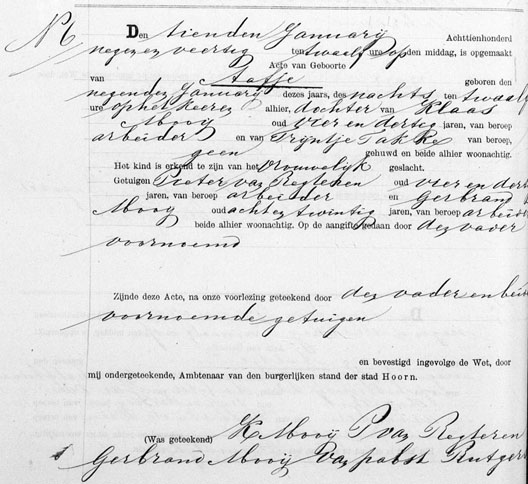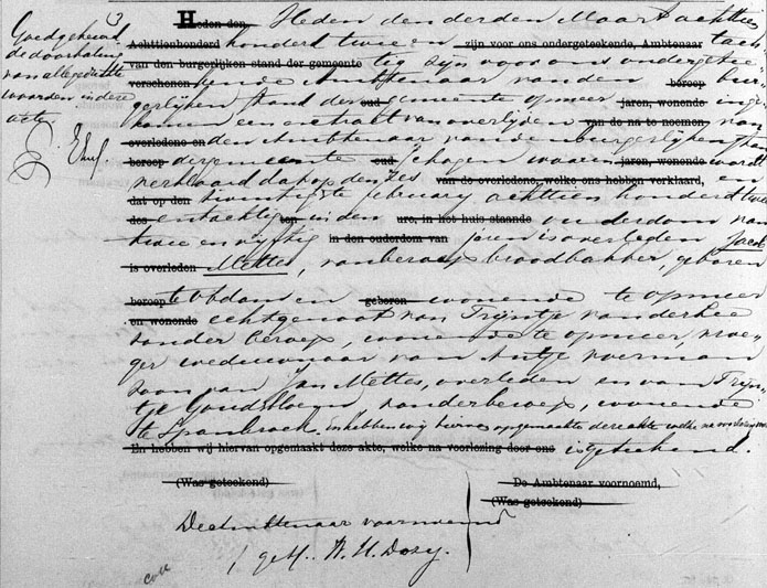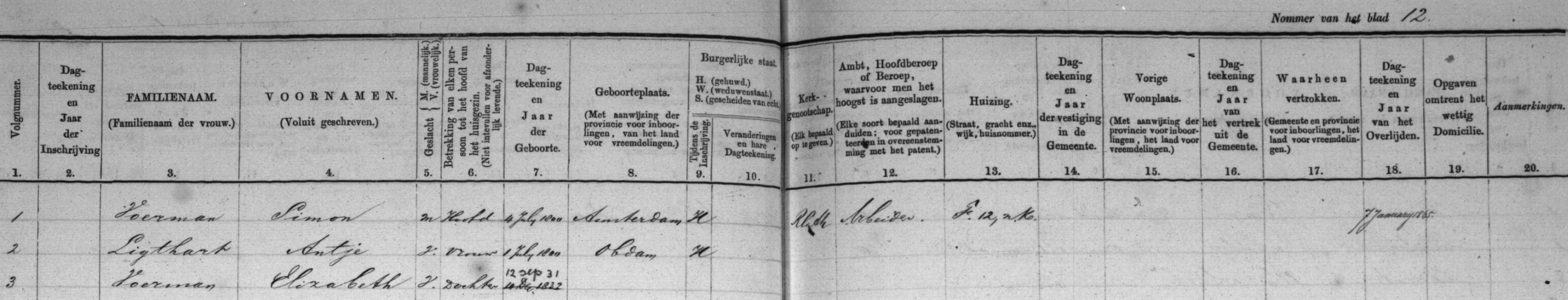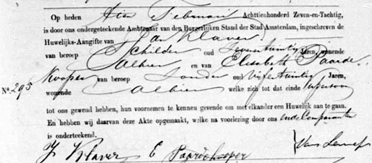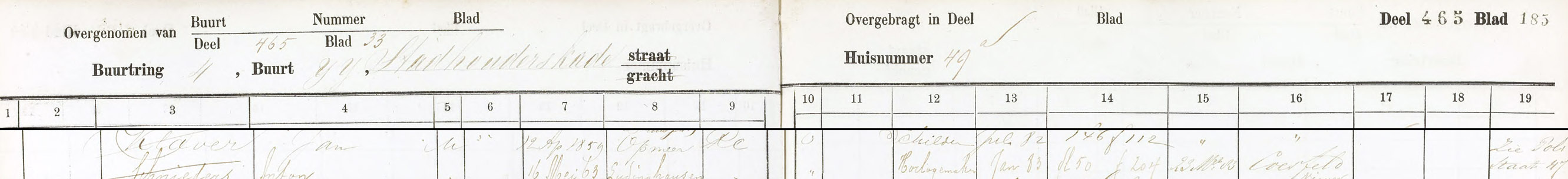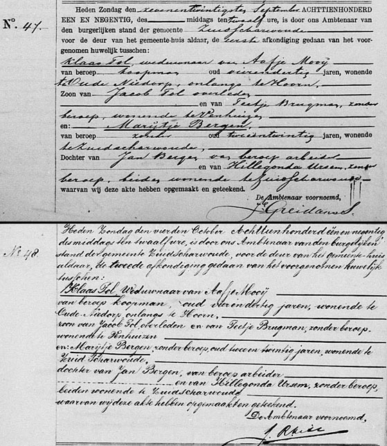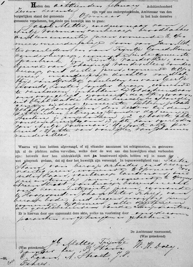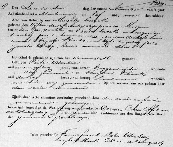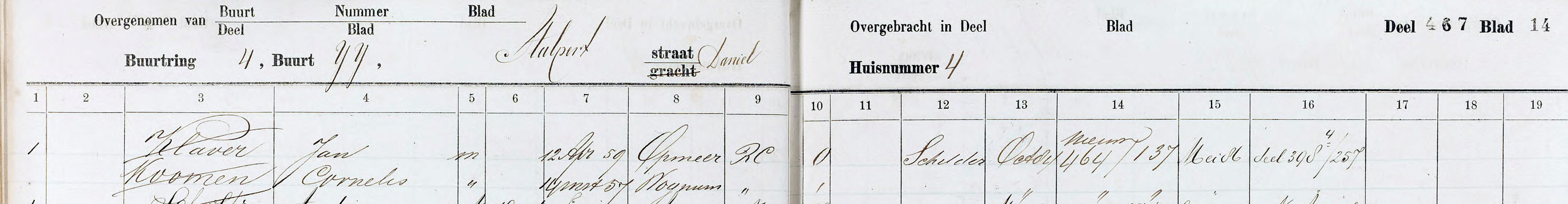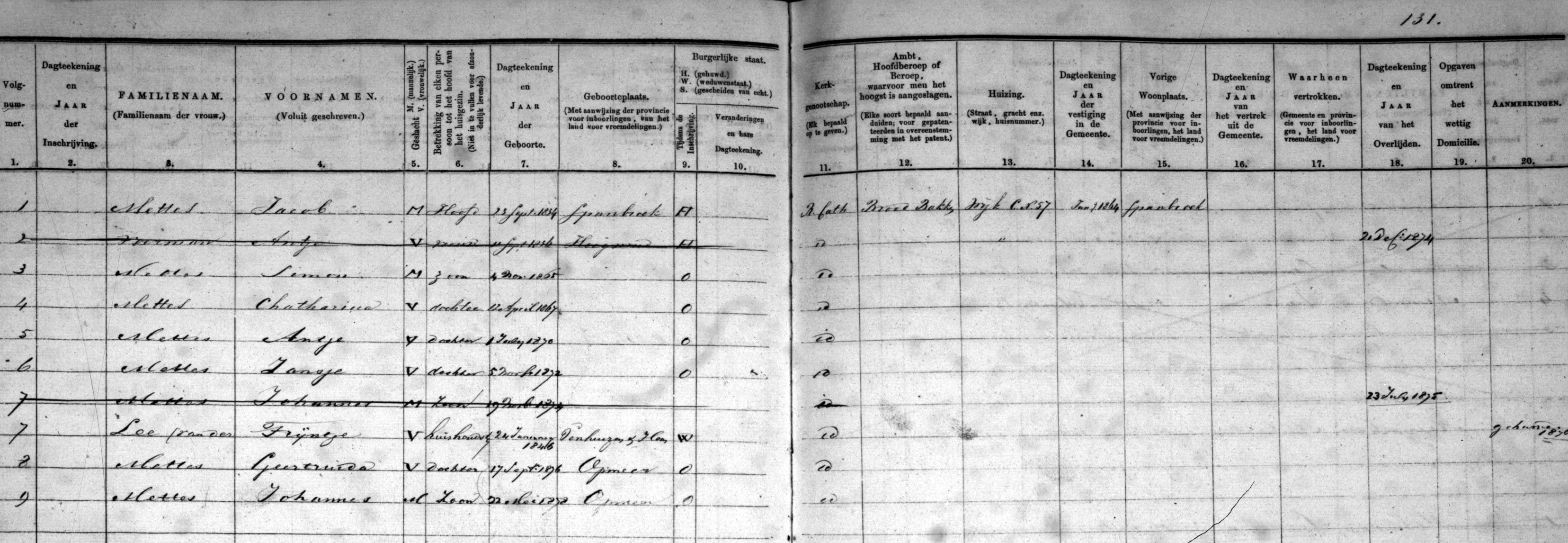 | 4. | v | Antje (Antje) VOERMAN [6440]. Geb. op 11-09-1836 te Hoogwoud (bron: BS Hoogwoud). Overl. op 21-12-1874 te Opmeer op 38-jarige leeftijd (bron: BS Opmeer). Otr. [5990] ? te ? Tr. op 27-jarige leeftijd op 31-12-1863 te Opmeer (bron: BS Opmeer). Echtgenoot is Jacob (Jacob) METTES [19820], 29 jaar oud, broodbakker. Geb. op 23-09-1834 te Spanbroek (bron: BS Spanbroek). Overl. op 26-02-1882 te Schagen op 47-jarige leeftijd (bron: BS Schagen + BS Opmeer). Zn. van Jan (Jan) METTES [19821] en Trijntje (Trijntje) GOUDSBLOEM [19822]. Jacob Mettis hertrouwd: Otr.[6117] op ? te ?, tr. op 18-02-1876 te Opmeer (bron: BS Opmeer) met Trijntje (Trijntje) LEE, VAN DER [20268], geb. op 24-01-1846 te Hem (bron: BS Venhuizen) overl. op 29-03-1889 te Hoorn (bron: BS Hoorn) dr. van Matthijs (Matthijs) LEE, VAN DER [20269] en Geertje (Geertje) Ewouds LAUTER [20270] Trijntje van der Lee is weduwe: Otr.[6120] op ? te ?, tr. op 09-01-1873 te Hoogwoud (bron: BS Hoogwoud) met Johannes (Jan) MEER, VAN DER [20277], geb. op 04-06-1844 te Medemblik (bron: BS Medemblik) overl. op 18-01-1873 te Hoogwoud (BS Hoogwoud) zn. van Sjouke (Sjouke) MEER, VAN DER [20278] en Trijntje (Trijntje) LAKEMAN [20279] Trijntje van der Lee is hertrouwd: Otr.[6121] op ? te ?, tr. op 05-04-1883 te Opmeer (bron: BS Opmeer) met Klaas (Klaas) TOL [20280], geb. op 31-05-1857 te Venhuizen (bron: BS Venhuizen) overl. op 08-05-1919 te Hoorn (bron: BS Hoorn) zn. van Jacob (Jacob) TOL [20281] en Teetje (Teetje) BRUGMAN [20281] Klaas Tol hertrouwd: Otr.[6662] op 12-07-1889 te Hoorn (bron: BS Hoorn) met Aafje (Aafje) MOOIJ [22092], geb. op 09-01-1849 te Hoorn (bron: BS Hoorn) overl. op 28-03-1890 te Hoorn (bron: BS Hoorn) dr. van Klaas (Klaas) NOOIJ [22093] en Trijntje (Trijnje) TAKKE [22094] Aafje Mooij is weduwe: Otr.[6663] op ? te ?, tr. op 27-10-1876 te Hoorn (bron: BS Hoorn) met Jan (Jan) OLFERS [22095], geb. op 24-04-1832 te Hoorn (bron: BS Hoorn) overl. op 28-11-1886 te Hoorn (bron: BS Hoorn) Zn. van Louwerens (Louwerens) OLFERS [22096] en Geertje (Geertje) SNELTEN [22097] Jan Olfers was weduwnaar: Otr.[6664] op ? te ?, tr. op 05-02-1858 te Hoorn (bron: BS Hoorn) met Maartje (Maartje) SNOEK [22098], geb. op 15-11-1828 te Grosthuizen (bron: BS Grosthuizen) overl. op 22-04-1875 te Hoorn (bron: BS Hoorn) dr. van Tamis (Tamis) SNOEK [22099] en Trijntje (Trijnje) STREETS [22100] Klaas Tol hertrouwd: Otr.[6665] op 22-09-1891 te Zuid Scharwoude (bron: BS Zuid Scharwoude) met Marijtje (Marijtje) BERGEN [22101], geb. op 24-01-1869 te Zuid Scharwoude (bron: BS Zuid Scharwoude) overl. op 24-11-1920 te Hoorn (bron: BS Bergen) dr. van Jan (Jan) BERGEN [22102] en Hillegonda (Hillegonda) URSEM [22103] - Op 03-08-1875 en 11-10-1875 boedelinventaris en boedelscheiding door Jacob Mettes weduwnaar van Antje Voerman. Genoemd worden hun kinderen Simon, Trijntje, Antje, Jansje en Johannes Mettes. Jacob van Diepen wordt vermeld als voogd. Ook zijn schoonmoeder Antje Ligthart weduwe van Simon Voerman wordt vermeld (bron: NA Obdam inv nr 1686-18-39 fol 74 + 128) - Op 05-05-1882 boedelscheiding door Trijntje van der Lee weduwe van Jacob Mettes weduwnaar van Antje Voerman. Genoemd worden zijn kinderen met Antje Voerman genaamd Simon, Trijntje, Antje en Jantje met hun voogden Jan Konijn en Jacob van Diepen en uit het huwelijk met Trijntje van der Lee de kinderen Geertje en Jan Mettes met hun voogd Arnoldus van der Lee (bron: NA Obdam inv nr 1686-18-48 fol 149) Woonplaatsen na haar vertrek uit het huwelijk te _: - Op __-__-____ Opmeer - 16 (bron: Bevolkingsregister Opmeer 1850-1862 inv nr 4 + 1861-1880 inv nr 5) Woonplaatsen na hun huwelijk: - Op __-01-1864 Opmeer - C 57 (bron: Bevolkingsregister Opmeer 1861-1880 inv nr 5) |