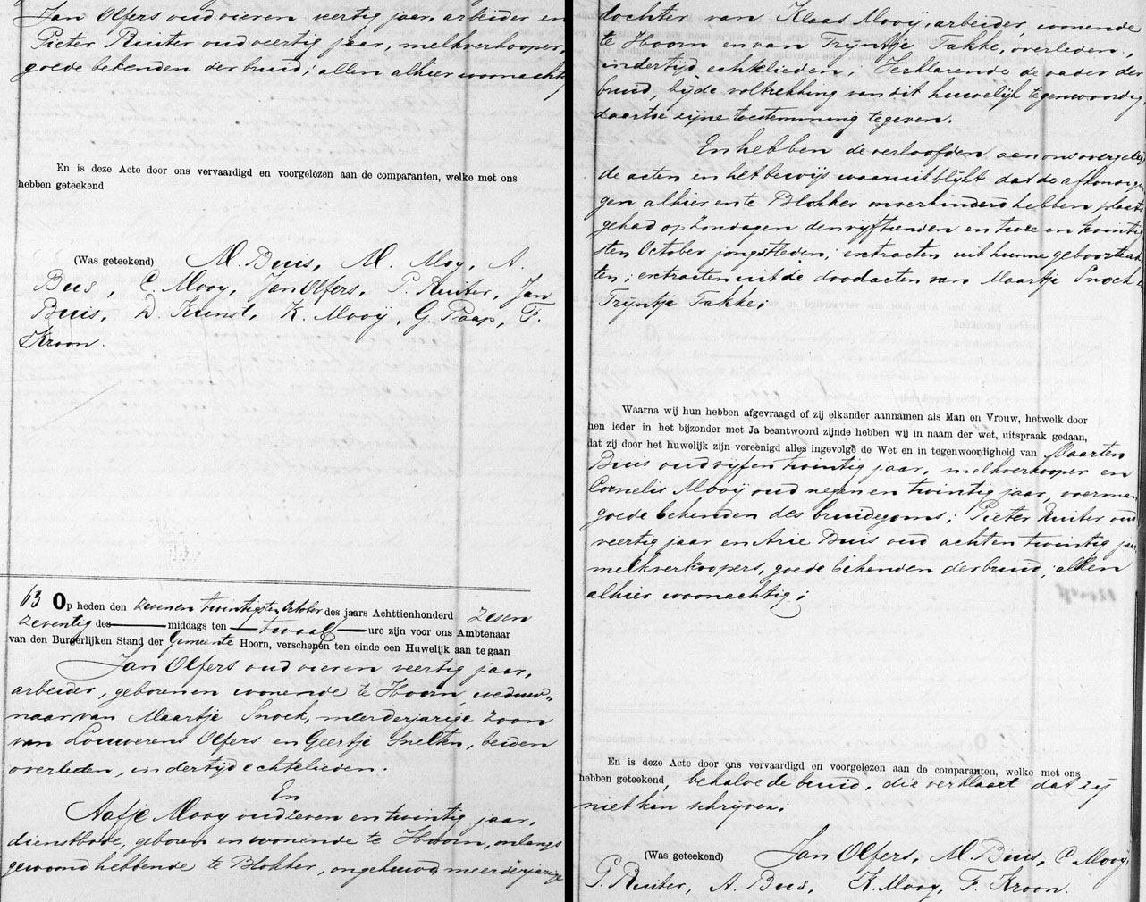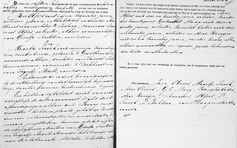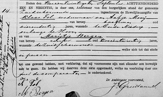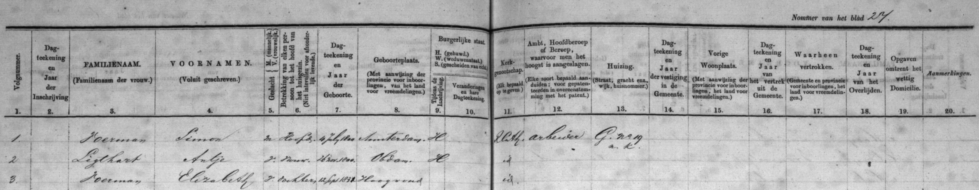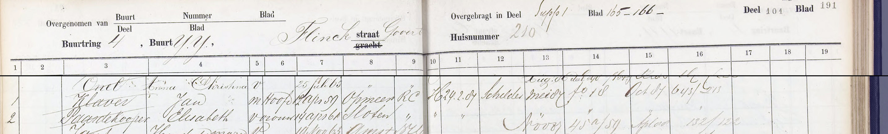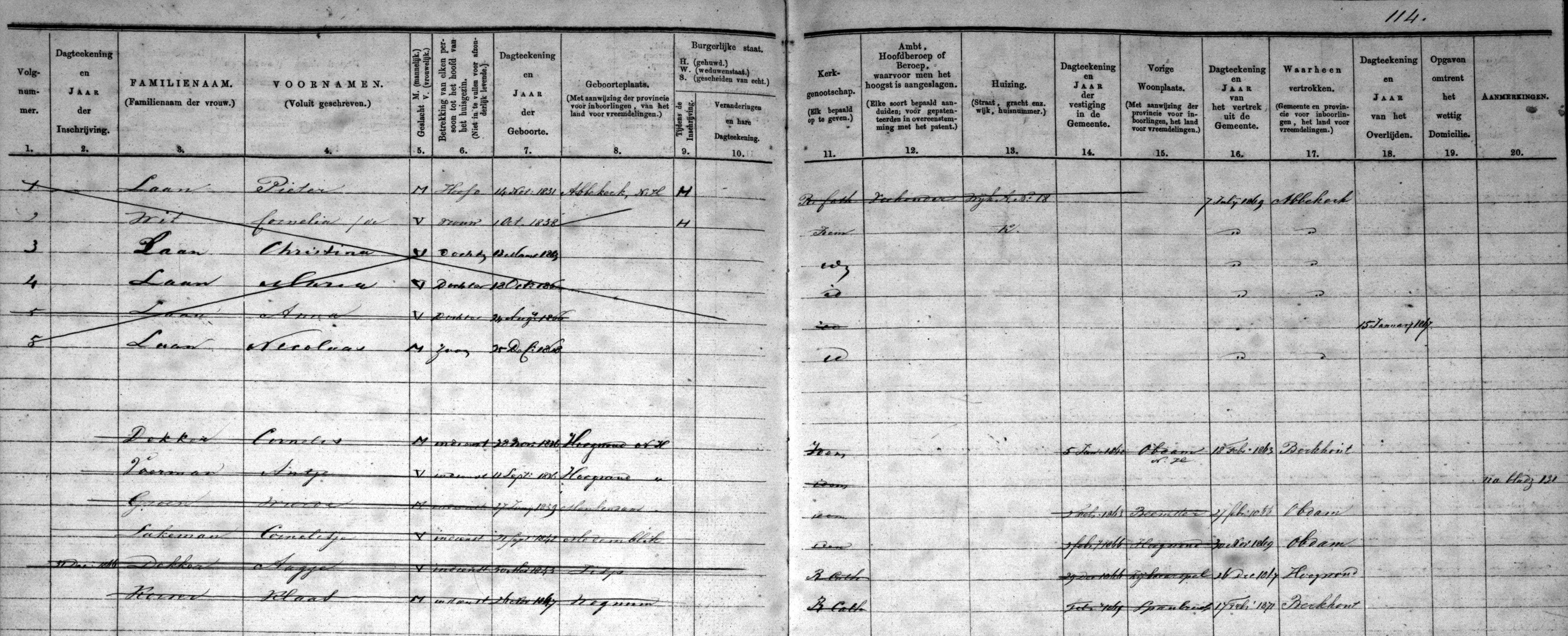 | 4. | v | Antje (Antje) VOERMAN [6440]. Geb. op 11-09-1836 te Hoogwoud (bron: BS Hoogwoud). Overl. op 21-12-1874 te Opmeer op 38-jarige leeftijd (bron: BS Opmeer). Otr. [5990] ? te ? Tr. op 27-jarige leeftijd op 31-12-1863 te Opmeer (bron: BS Opmeer). Echtgenoot is Jacob (Jacob) METTES [19820], 29 jaar oud, broodbakker. Geb. op 23-09-1834 te Spanbroek (bron: BS Spanbroek). Overl. op 26-02-1882 te Schagen op 47-jarige leeftijd (bron: BS Schagen + BS Opmeer). Zn. van Jan (Jan) METTES [19821] en Trijntje (Trijntje) GOUDSBLOEM [19822]. Jacob Mettis hertrouwd: Otr.[6117] op ? te ?, tr. op 18-02-1876 te Opmeer (bron: BS Opmeer) met Trijntje (Trijntje) LEE, VAN DER [20268], geb. op 24-01-1846 te Hem (bron: BS Venhuizen) overl. op 29-03-1889 te Hoorn (bron: BS Hoorn) dr. van Matthijs (Matthijs) LEE, VAN DER [20269] en Geertje (Geertje) Ewouds LAUTER [20270] Trijntje van der Lee is weduwe: Otr.[6120] op ? te ?, tr. op 09-01-1873 te Hoogwoud (bron: BS Hoogwoud) met Johannes (Jan) MEER, VAN DER [20277], geb. op 04-06-1844 te Medemblik (bron: BS Medemblik) overl. op 18-01-1873 te Hoogwoud (BS Hoogwoud) zn. van Sjouke (Sjouke) MEER, VAN DER [20278] en Trijntje (Trijntje) LAKEMAN [20279] Trijntje van der Lee is hertrouwd: Otr.[6121] op ? te ?, tr. op 05-04-1883 te Opmeer (bron: BS Opmeer) met Klaas (Klaas) TOL [20280], geb. op 31-05-1857 te Venhuizen (bron: BS Venhuizen) overl. op 08-05-1919 te Hoorn (bron: BS Hoorn) zn. van Jacob (Jacob) TOL [20281] en Teetje (Teetje) BRUGMAN [20281] Klaas Tol hertrouwd: Otr.[6662] op 12-07-1889 te Hoorn (bron: BS Hoorn) met Aafje (Aafje) MOOIJ [22092], geb. op 09-01-1849 te Hoorn (bron: BS Hoorn) overl. op 28-03-1890 te Hoorn (bron: BS Hoorn) dr. van Klaas (Klaas) NOOIJ [22093] en Trijntje (Trijnje) TAKKE [22094] Aafje Mooij is weduwe: Otr.[6663] op ? te ?, tr. op 27-10-1876 te Hoorn (bron: BS Hoorn) met Jan (Jan) OLFERS [22095], geb. op 24-04-1832 te Hoorn (bron: BS Hoorn) overl. op 28-11-1886 te Hoorn (bron: BS Hoorn) Zn. van Louwerens (Louwerens) OLFERS [22096] en Geertje (Geertje) SNELTEN [22097] Jan Olfers was weduwnaar: Otr.[6664] op ? te ?, tr. op 05-02-1858 te Hoorn (bron: BS Hoorn) met Maartje (Maartje) SNOEK [22098], geb. op 15-11-1828 te Grosthuizen (bron: BS Grosthuizen) overl. op 22-04-1875 te Hoorn (bron: BS Hoorn) dr. van Tamis (Tamis) SNOEK [22099] en Trijntje (Trijnje) STREETS [22100] Klaas Tol hertrouwd: Otr.[6665] op 22-09-1891 te Zuid Scharwoude (bron: BS Zuid Scharwoude) met Marijtje (Marijtje) BERGEN [22101], geb. op 24-01-1869 te Zuid Scharwoude (bron: BS Zuid Scharwoude) overl. op 24-11-1920 te Hoorn (bron: BS Bergen) dr. van Jan (Jan) BERGEN [22102] en Hillegonda (Hillegonda) URSEM [22103] - Op 03-08-1875 en 11-10-1875 boedelinventaris en boedelscheiding door Jacob Mettes weduwnaar van Antje Voerman. Genoemd worden hun kinderen Simon, Trijntje, Antje, Jansje en Johannes Mettes. Jacob van Diepen wordt vermeld als voogd. Ook zijn schoonmoeder Antje Ligthart weduwe van Simon Voerman wordt vermeld (bron: NA Obdam inv nr 1686-18-39 fol 74 + 128) - Op 05-05-1882 boedelscheiding door Trijntje van der Lee weduwe van Jacob Mettes weduwnaar van Antje Voerman. Genoemd worden zijn kinderen met Antje Voerman genaamd Simon, Trijntje, Antje en Jantje met hun voogden Jan Konijn en Jacob van Diepen en uit het huwelijk met Trijntje van der Lee de kinderen Geertje en Jan Mettes met hun voogd Arnoldus van der Lee (bron: NA Obdam inv nr 1686-18-48 fol 149) Woonplaatsen na haar vertrek uit het huwelijk te _: - Op __-__-____ Opmeer - 16 (bron: Bevolkingsregister Opmeer 1850-1862 inv nr 4 + 1861-1880 inv nr 5) Woonplaatsen na hun huwelijk: - Op __-01-1864 Opmeer - C 57 (bron: Bevolkingsregister Opmeer 1861-1880 inv nr 5) |