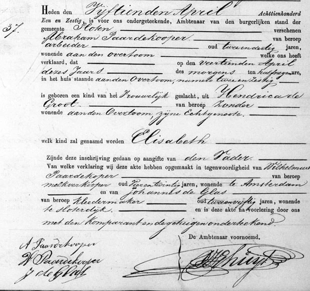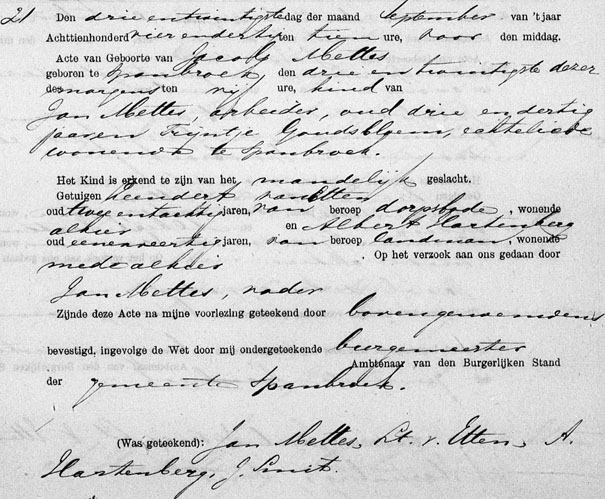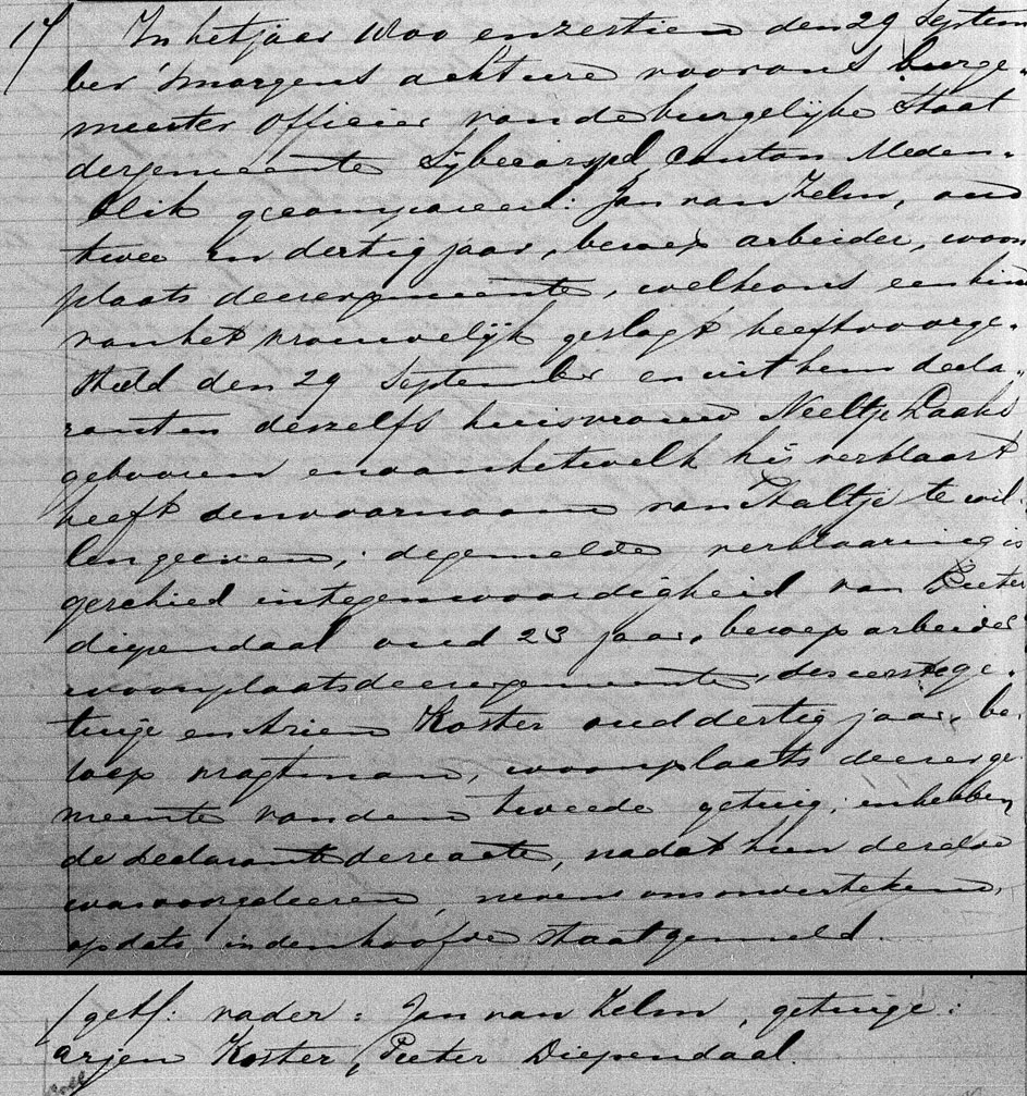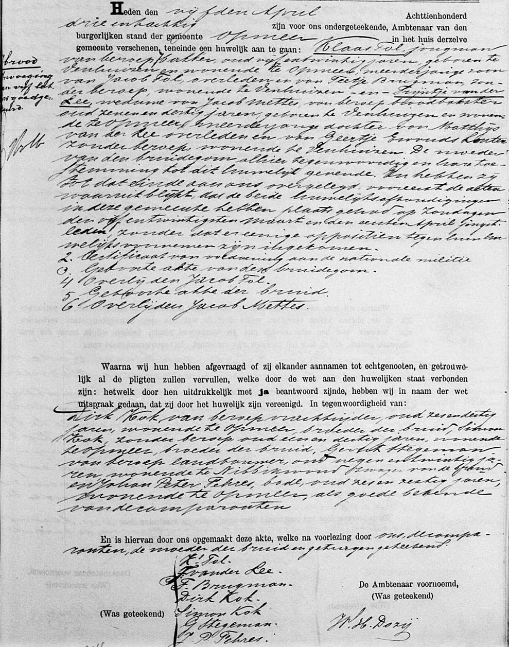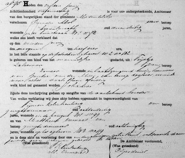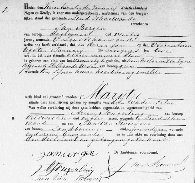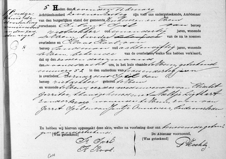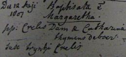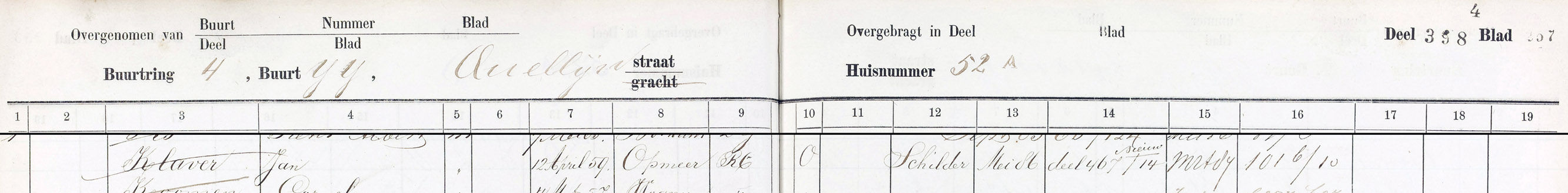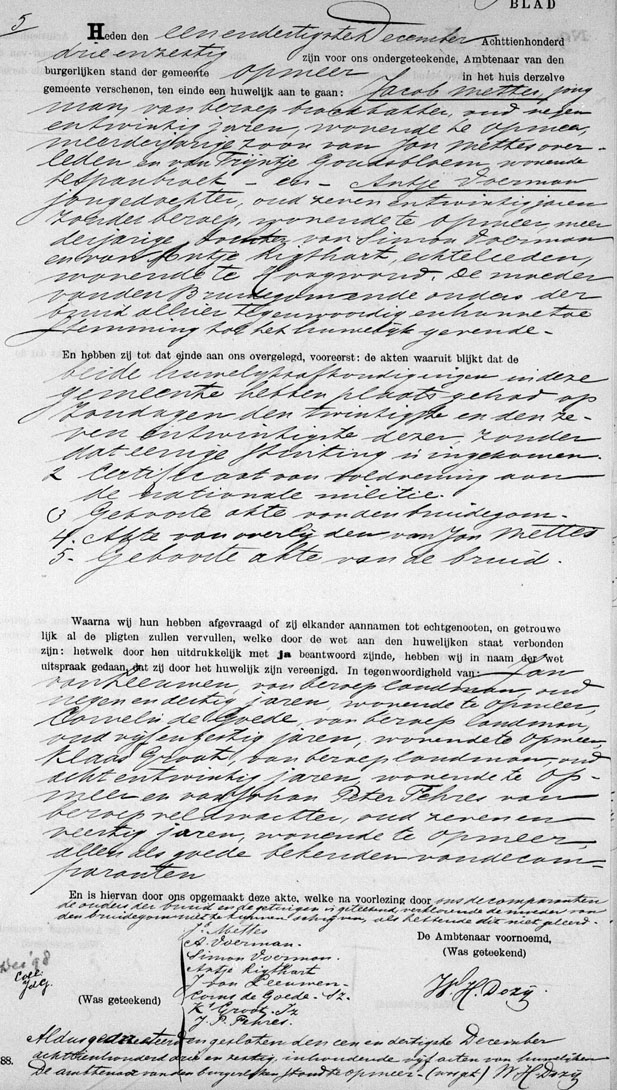 | 4. | v | Antje (Antje) VOERMAN [6440]. Geb. op 11-09-1836 te Hoogwoud (bron: BS Hoogwoud). Overl. op 21-12-1874 te Opmeer op 38-jarige leeftijd (bron: BS Opmeer). Otr. [5990] ? te ? Tr. op 27-jarige leeftijd op 31-12-1863 te Opmeer (bron: BS Opmeer). Echtgenoot is Jacob (Jacob) METTES [19820], 29 jaar oud, broodbakker. Geb. op 23-09-1834 te Spanbroek (bron: BS Spanbroek). Overl. op 26-02-1882 te Schagen op 47-jarige leeftijd (bron: BS Schagen + BS Opmeer). Zn. van Jan (Jan) METTES [19821] en Trijntje (Trijntje) GOUDSBLOEM [19822]. Jacob Mettis hertrouwd: Otr.[6117] op ? te ?, tr. op 18-02-1876 te Opmeer (bron: BS Opmeer) met Trijntje (Trijntje) LEE, VAN DER [20268], geb. op 24-01-1846 te Hem (bron: BS Venhuizen) overl. op 29-03-1889 te Hoorn (bron: BS Hoorn) dr. van Matthijs (Matthijs) LEE, VAN DER [20269] en Geertje (Geertje) Ewouds LAUTER [20270] Trijntje van der Lee is weduwe: Otr.[6120] op ? te ?, tr. op 09-01-1873 te Hoogwoud (bron: BS Hoogwoud) met Johannes (Jan) MEER, VAN DER [20277], geb. op 04-06-1844 te Medemblik (bron: BS Medemblik) overl. op 18-01-1873 te Hoogwoud (BS Hoogwoud) zn. van Sjouke (Sjouke) MEER, VAN DER [20278] en Trijntje (Trijntje) LAKEMAN [20279] Trijntje van der Lee is hertrouwd: Otr.[6121] op ? te ?, tr. op 05-04-1883 te Opmeer (bron: BS Opmeer) met Klaas (Klaas) TOL [20280], geb. op 31-05-1857 te Venhuizen (bron: BS Venhuizen) overl. op 08-05-1919 te Hoorn (bron: BS Hoorn) zn. van Jacob (Jacob) TOL [20281] en Teetje (Teetje) BRUGMAN [20281] Klaas Tol hertrouwd: Otr.[6662] op 12-07-1889 te Hoorn (bron: BS Hoorn) met Aafje (Aafje) MOOIJ [22092], geb. op 09-01-1849 te Hoorn (bron: BS Hoorn) overl. op 28-03-1890 te Hoorn (bron: BS Hoorn) dr. van Klaas (Klaas) NOOIJ [22093] en Trijntje (Trijnje) TAKKE [22094] Aafje Mooij is weduwe: Otr.[6663] op ? te ?, tr. op 27-10-1876 te Hoorn (bron: BS Hoorn) met Jan (Jan) OLFERS [22095], geb. op 24-04-1832 te Hoorn (bron: BS Hoorn) overl. op 28-11-1886 te Hoorn (bron: BS Hoorn) Zn. van Louwerens (Louwerens) OLFERS [22096] en Geertje (Geertje) SNELTEN [22097] Jan Olfers was weduwnaar: Otr.[6664] op ? te ?, tr. op 05-02-1858 te Hoorn (bron: BS Hoorn) met Maartje (Maartje) SNOEK [22098], geb. op 15-11-1828 te Grosthuizen (bron: BS Grosthuizen) overl. op 22-04-1875 te Hoorn (bron: BS Hoorn) dr. van Tamis (Tamis) SNOEK [22099] en Trijntje (Trijnje) STREETS [22100] Klaas Tol hertrouwd: Otr.[6665] op 22-09-1891 te Zuid Scharwoude (bron: BS Zuid Scharwoude) met Marijtje (Marijtje) BERGEN [22101], geb. op 24-01-1869 te Zuid Scharwoude (bron: BS Zuid Scharwoude) overl. op 24-11-1920 te Hoorn (bron: BS Bergen) dr. van Jan (Jan) BERGEN [22102] en Hillegonda (Hillegonda) URSEM [22103] - Op 03-08-1875 en 11-10-1875 boedelinventaris en boedelscheiding door Jacob Mettes weduwnaar van Antje Voerman. Genoemd worden hun kinderen Simon, Trijntje, Antje, Jansje en Johannes Mettes. Jacob van Diepen wordt vermeld als voogd. Ook zijn schoonmoeder Antje Ligthart weduwe van Simon Voerman wordt vermeld (bron: NA Obdam inv nr 1686-18-39 fol 74 + 128) - Op 05-05-1882 boedelscheiding door Trijntje van der Lee weduwe van Jacob Mettes weduwnaar van Antje Voerman. Genoemd worden zijn kinderen met Antje Voerman genaamd Simon, Trijntje, Antje en Jantje met hun voogden Jan Konijn en Jacob van Diepen en uit het huwelijk met Trijntje van der Lee de kinderen Geertje en Jan Mettes met hun voogd Arnoldus van der Lee (bron: NA Obdam inv nr 1686-18-48 fol 149) Woonplaatsen na haar vertrek uit het huwelijk te _: - Op __-__-____ Opmeer - 16 (bron: Bevolkingsregister Opmeer 1850-1862 inv nr 4 + 1861-1880 inv nr 5) Woonplaatsen na hun huwelijk: - Op __-01-1864 Opmeer - C 57 (bron: Bevolkingsregister Opmeer 1861-1880 inv nr 5) |
