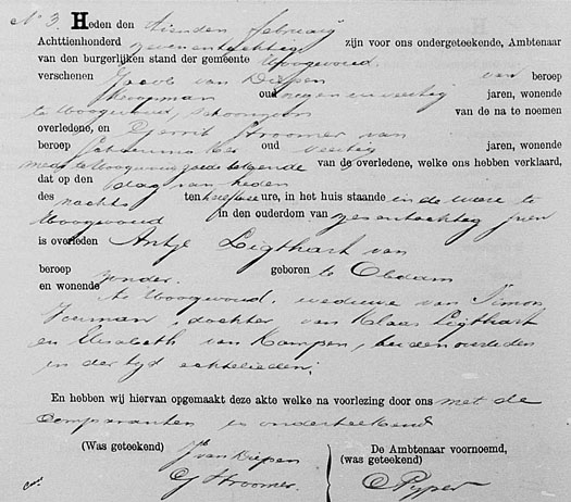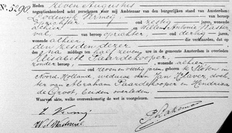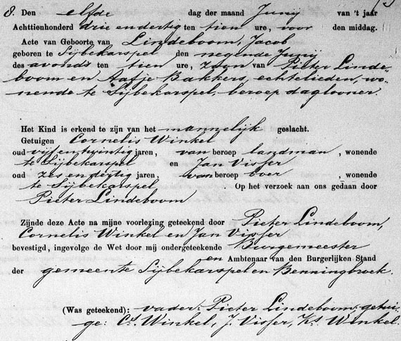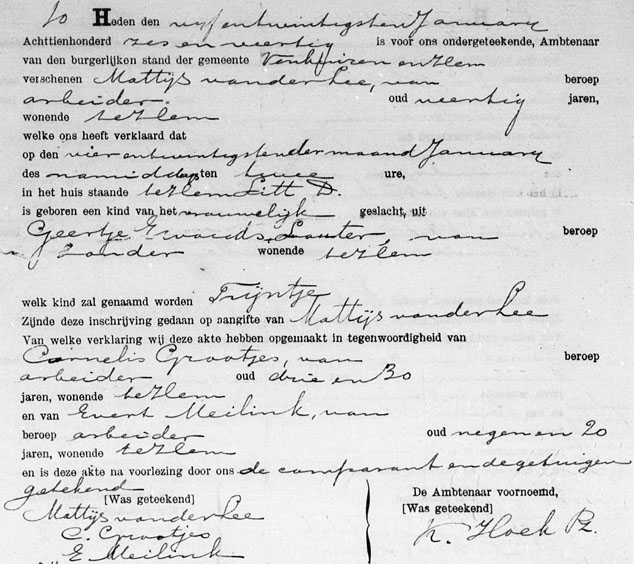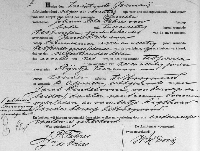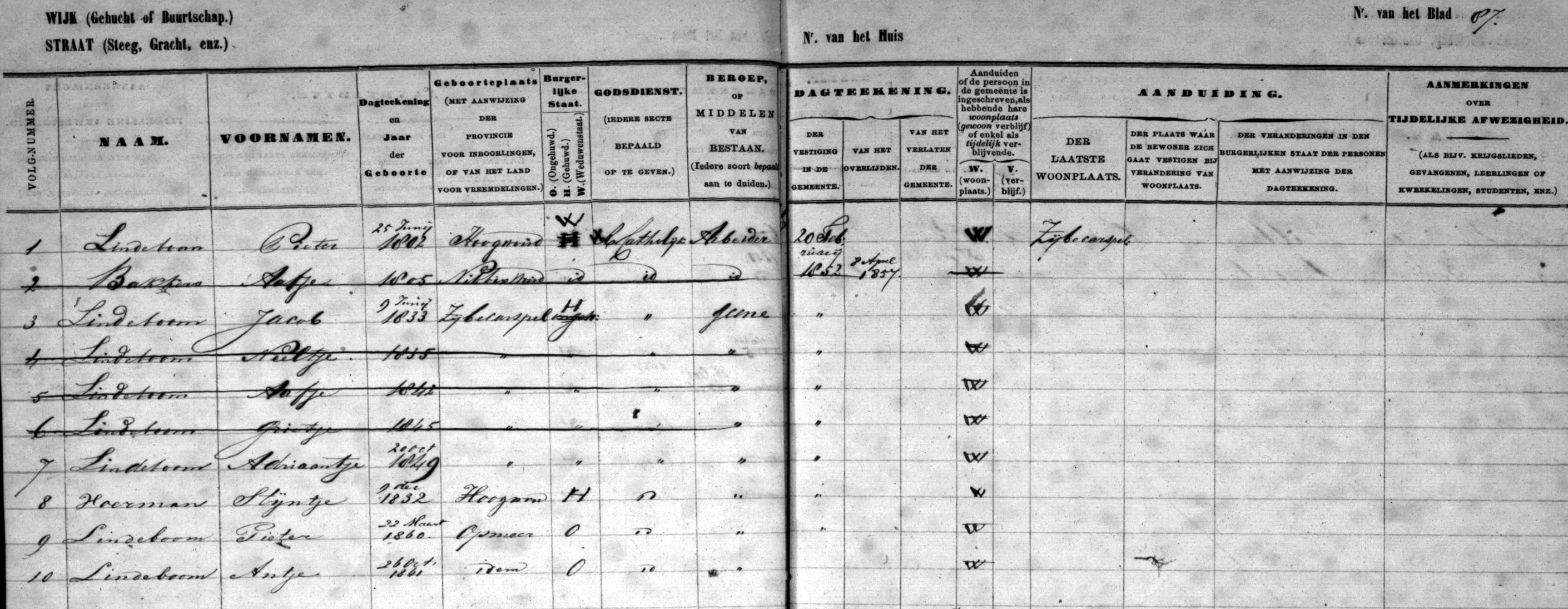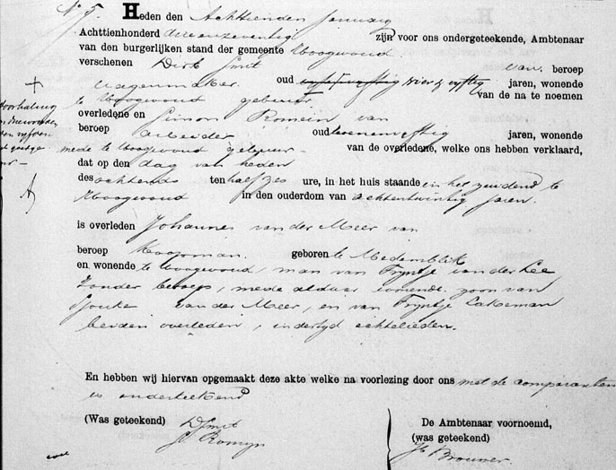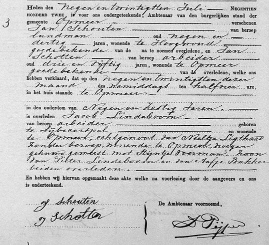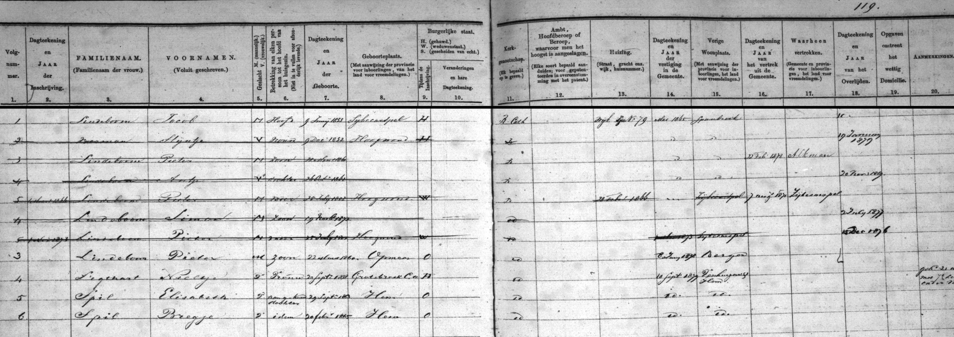 | 3. | v | Steintje (Steintje) VOERMAN [6439]. Geb. op 09-12-1832 te de Weere (bron: BS Hoogwoud). Overl. op 19-01-1879 te Opmeer op 46-jarige leeftijd (bron: BS Opmeer). Otr. [5991] ? te ? Tr. op 26-jarige leeftijd op 19-05-1859 te Opmeer (bron: BS Opmeer). Echtgenoot is Jacob (Jacob) LINDEBOOM [19823], 25 jaar oud, dagloner. Geb. op 09-06-1833 te Sijbekarspel (bron: BS Sijbekarspel). Overl. op 29-07-1902 te Opmeer op 69-jarige leeftijd (bron: BS Opmeer). Zn. van Pieter (Pieter) LINDEBOOM [19824] en Aafje (Aafje) BAKKER [19825]. Jacob Lindeboom hertrouwd: Otr.[6116] op ? te ?, tr. op 21-08-1879 te Opmeer (bron: BS Opmeer) met Neeltje (Neeltje) LIGTHARD [20265], geb. op 20-09-1838 te Grootebroek (bron: BS Grootebroek) overl. op 05-12-1903 te Opmeer (bron: BS Opmeer) dr. van Dirk (Dirk) Simonsz LIGTHARD [20266] en Bregje (Bregje) ROOD [20267] Neeltje Ligthard is weduwe: Otr.[6118] op ? te ?, tr. op 08-01-1863 te Venhuizen (bron: BS Venhuizen) met Bernardus (Bernardus) SPIL [20271], geb. op 26-12-1834 te Venhuizen (bron: BS Venhuizen) overl. op 06-02-1867 te Hem (bron: BS Venhuizen) zn. van Gerrit (Gerrit) SPIL [20272] en Jannetje (Jantje) Onneweer [20273] Bernardus Spil is weduwnaar: Otr.[6119] op ? te ?, tr. op 19-02-1860 te Venhuizen (bron: BS Venhuizen) met Elisabet (Elisabet) GERRITSE [20274], geb. op 28-10-1833 te Hoogkarspel (bron: BS Hoogkarspel) overl. op 01-11-1860 te Hem (bron: BS Venhhuizen) dr. van Gerrit (Gerrit) GERRITSE [20275] en Anje (Antje) VERTELMAN [20276] - Op 11-03-1879 en 11-06-1879 boedelscheiding door Jacob Lindeboom weduwnaar van Stijntje Voerman en hun zoon Pieter Lindeboom. Jacob Mettes wordt vermeld als voogd. (bron: NA Obdam inv nr 1686-18-43 fol 17 + 108) Woonplaatsen na hun huwelijk: - Op __-__-____ Opmeer - (bron: Bevolkingsregister Opmeer 1850-1860 inv nr 4 + 1861-1880 inv nr 5) |