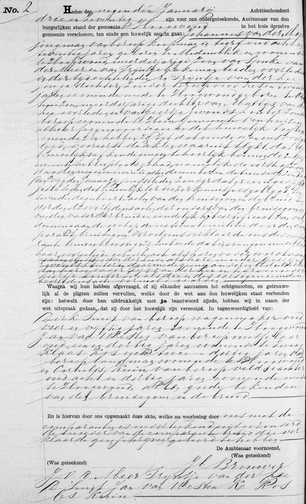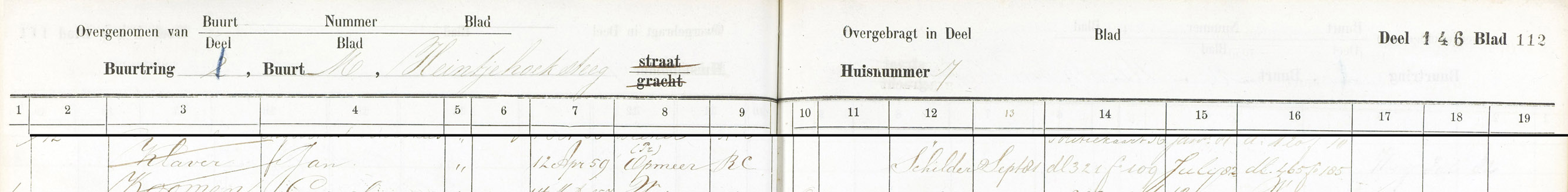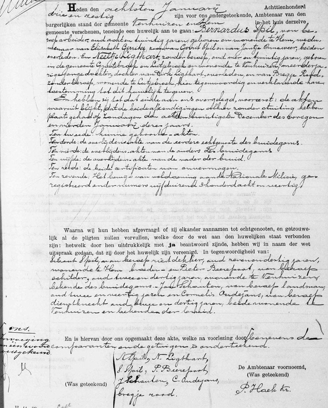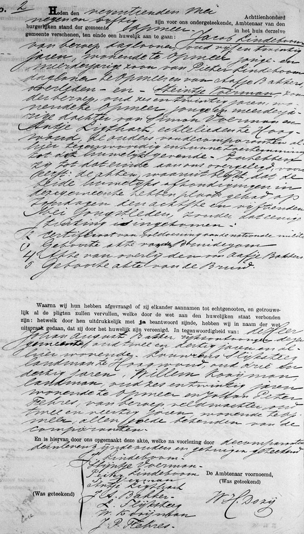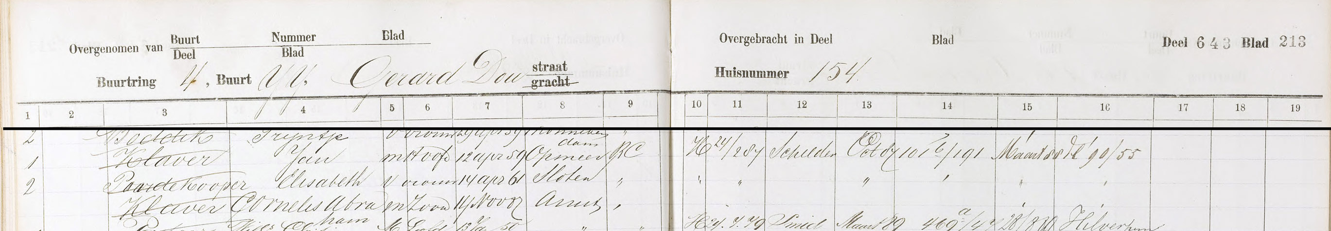 | 3. | v | Steintje (Steintje) VOERMAN [6439]. Geb. op 09-12-1832 te de Weere (bron: BS Hoogwoud). Overl. op 19-01-1879 te Opmeer op 46-jarige leeftijd (bron: BS Opmeer). Otr. [5991] ? te ? Tr. op 26-jarige leeftijd op 19-05-1859 te Opmeer (bron: BS Opmeer). Echtgenoot is Jacob (Jacob) LINDEBOOM [19823], 25 jaar oud, dagloner. Geb. op 09-06-1833 te Sijbekarspel (bron: BS Sijbekarspel). Overl. op 29-07-1902 te Opmeer op 69-jarige leeftijd (bron: BS Opmeer). Zn. van Pieter (Pieter) LINDEBOOM [19824] en Aafje (Aafje) BAKKER [19825]. Jacob Lindeboom hertrouwd: Otr.[6116] op ? te ?, tr. op 21-08-1879 te Opmeer (bron: BS Opmeer) met Neeltje (Neeltje) LIGTHARD [20265], geb. op 20-09-1838 te Grootebroek (bron: BS Grootebroek) overl. op 05-12-1903 te Opmeer (bron: BS Opmeer) dr. van Dirk (Dirk) Simonsz LIGTHARD [20266] en Bregje (Bregje) ROOD [20267] Neeltje Ligthard is weduwe: Otr.[6118] op ? te ?, tr. op 08-01-1863 te Venhuizen (bron: BS Venhuizen) met Bernardus (Bernardus) SPIL [20271], geb. op 26-12-1834 te Venhuizen (bron: BS Venhuizen) overl. op 06-02-1867 te Hem (bron: BS Venhuizen) zn. van Gerrit (Gerrit) SPIL [20272] en Jannetje (Jantje) Onneweer [20273] Bernardus Spil is weduwnaar: Otr.[6119] op ? te ?, tr. op 19-02-1860 te Venhuizen (bron: BS Venhuizen) met Elisabet (Elisabet) GERRITSE [20274], geb. op 28-10-1833 te Hoogkarspel (bron: BS Hoogkarspel) overl. op 01-11-1860 te Hem (bron: BS Venhhuizen) dr. van Gerrit (Gerrit) GERRITSE [20275] en Anje (Antje) VERTELMAN [20276] - Op 11-03-1879 en 11-06-1879 boedelscheiding door Jacob Lindeboom weduwnaar van Stijntje Voerman en hun zoon Pieter Lindeboom. Jacob Mettes wordt vermeld als voogd. (bron: NA Obdam inv nr 1686-18-43 fol 17 + 108) Woonplaatsen na hun huwelijk: - Op __-__-____ Opmeer - (bron: Bevolkingsregister Opmeer 1850-1860 inv nr 4 + 1861-1880 inv nr 5) |