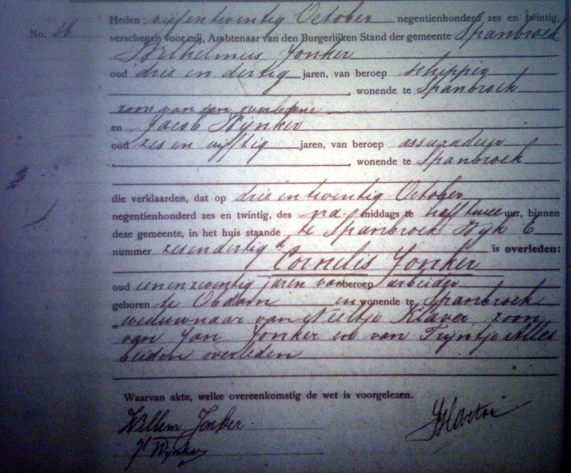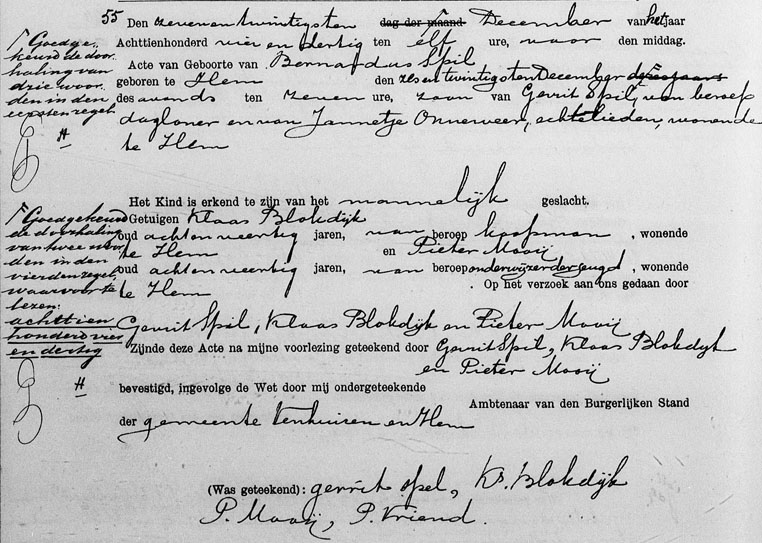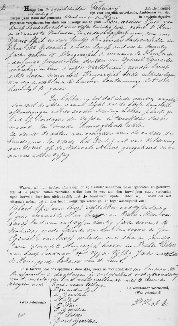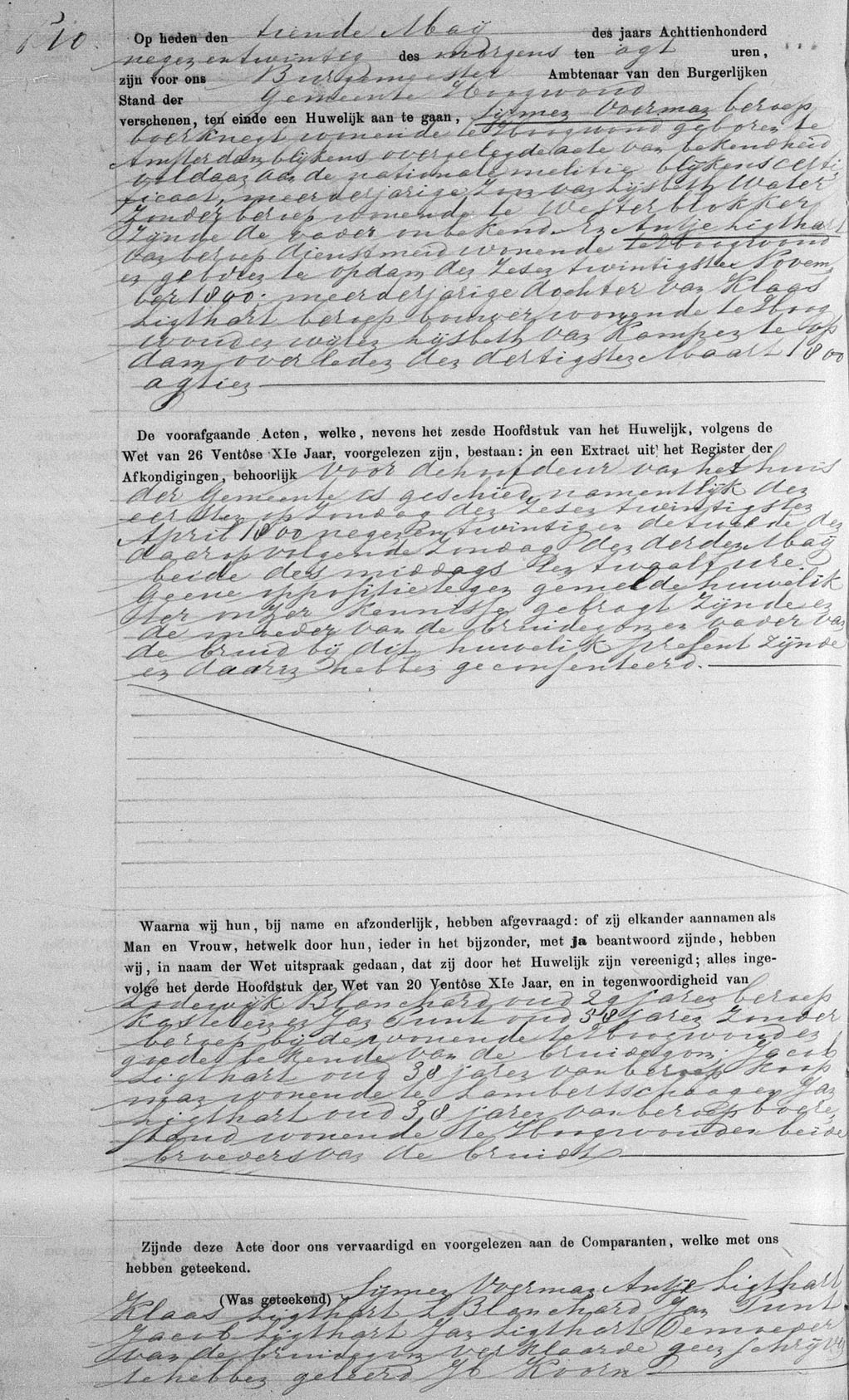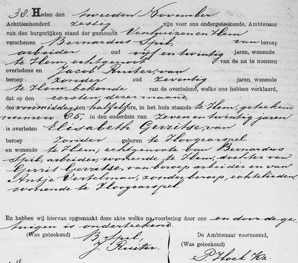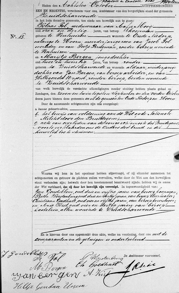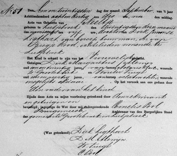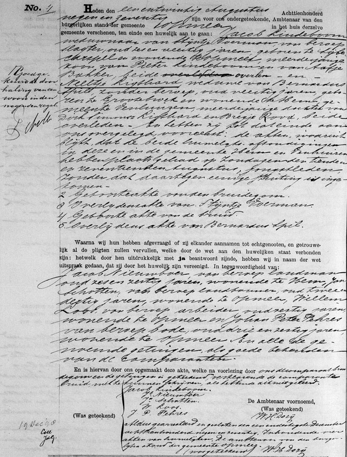 | 3. | v | Steintje (Steintje) VOERMAN [6439]. Geb. op 09-12-1832 te de Weere (bron: BS Hoogwoud). Overl. op 19-01-1879 te Opmeer op 46-jarige leeftijd (bron: BS Opmeer). Otr. [5991] ? te ? Tr. op 26-jarige leeftijd op 19-05-1859 te Opmeer (bron: BS Opmeer). Echtgenoot is Jacob (Jacob) LINDEBOOM [19823], 25 jaar oud, dagloner. Geb. op 09-06-1833 te Sijbekarspel (bron: BS Sijbekarspel). Overl. op 29-07-1902 te Opmeer op 69-jarige leeftijd (bron: BS Opmeer). Zn. van Pieter (Pieter) LINDEBOOM [19824] en Aafje (Aafje) BAKKER [19825]. Jacob Lindeboom hertrouwd: Otr.[6116] op ? te ?, tr. op 21-08-1879 te Opmeer (bron: BS Opmeer) met Neeltje (Neeltje) LIGTHARD [20265], geb. op 20-09-1838 te Grootebroek (bron: BS Grootebroek) overl. op 05-12-1903 te Opmeer (bron: BS Opmeer) dr. van Dirk (Dirk) Simonsz LIGTHARD [20266] en Bregje (Bregje) ROOD [20267] Neeltje Ligthard is weduwe: Otr.[6118] op ? te ?, tr. op 08-01-1863 te Venhuizen (bron: BS Venhuizen) met Bernardus (Bernardus) SPIL [20271], geb. op 26-12-1834 te Venhuizen (bron: BS Venhuizen) overl. op 06-02-1867 te Hem (bron: BS Venhuizen) zn. van Gerrit (Gerrit) SPIL [20272] en Jannetje (Jantje) Onneweer [20273] Bernardus Spil is weduwnaar: Otr.[6119] op ? te ?, tr. op 19-02-1860 te Venhuizen (bron: BS Venhuizen) met Elisabet (Elisabet) GERRITSE [20274], geb. op 28-10-1833 te Hoogkarspel (bron: BS Hoogkarspel) overl. op 01-11-1860 te Hem (bron: BS Venhhuizen) dr. van Gerrit (Gerrit) GERRITSE [20275] en Anje (Antje) VERTELMAN [20276] - Op 11-03-1879 en 11-06-1879 boedelscheiding door Jacob Lindeboom weduwnaar van Stijntje Voerman en hun zoon Pieter Lindeboom. Jacob Mettes wordt vermeld als voogd. (bron: NA Obdam inv nr 1686-18-43 fol 17 + 108) Woonplaatsen na hun huwelijk: - Op __-__-____ Opmeer - (bron: Bevolkingsregister Opmeer 1850-1860 inv nr 4 + 1861-1880 inv nr 5) |