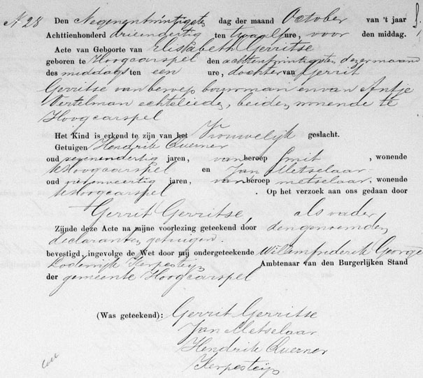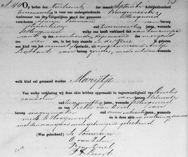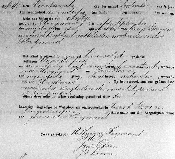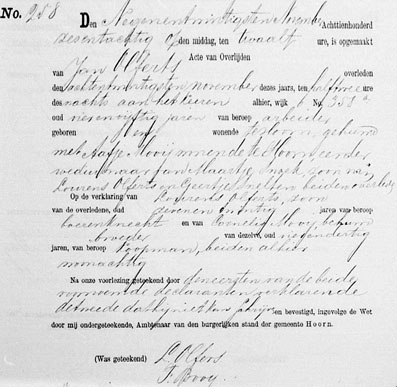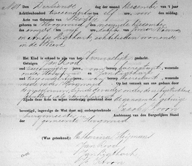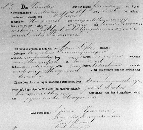 | 6. | v | Marijtje (Marijtje) VOERMAN [6442]. Geb. op 14-09-1842 te Hoogwoud (bron: BS Hoogwoud). Overl. op 02-10-1842 te Hoogwoud, 18 dagen oud (bron: BS Hoogwoud). |
