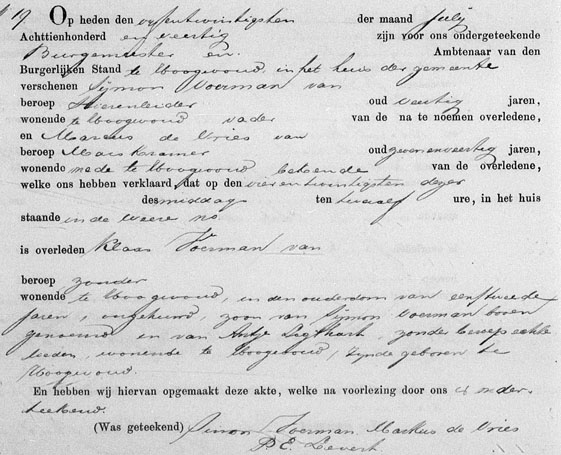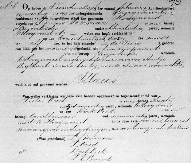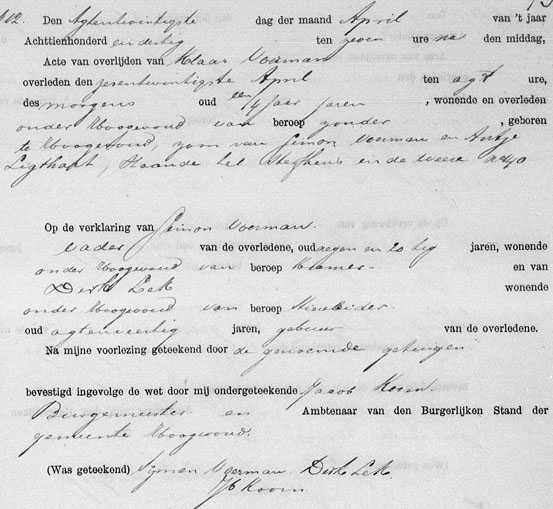| 5. | m | Klaas (Klaas) VOERMAN [6441]. Geb. op 22-02-1840 te Hoogwoud (bron: BS Hoogwoud). Overl. op 24-07-1840 te Hoogwoud, 153 dagen oud (bron: BS Hoogwoud). |