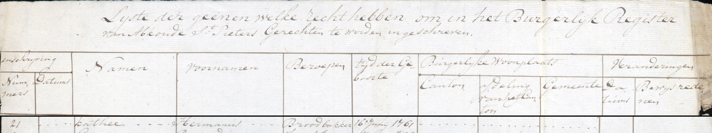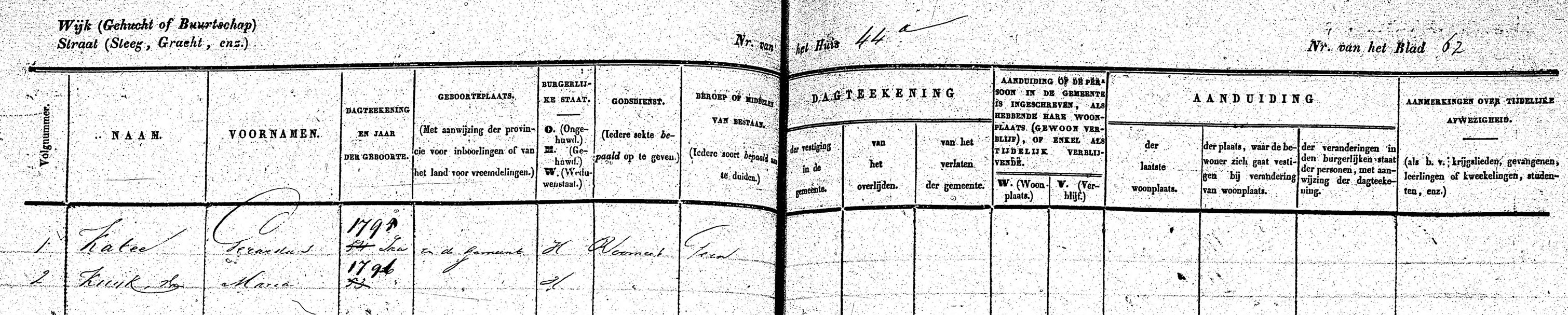 | 3. | m | Gerardus (Gerardus) Hermanusz KAATEE [1061]. Geb. ±03-1795 te Abcoude-Proostdij (bron: ?), ged. (RK) op 01-03-1795 te Abcoude (get.: Giel Kaatee en Maria Kaatee) (bron: DTB Abcoude inv nr 2). Overl. op 11-06-1870 te Abcoude Baambrugge (bron: BS Abcoude). In kadaster wordt Gerardus Kaatee, timmerman vermeld als eigenaar van kavel 372 en 373 te Abcoude broekzijder polder huis en erf. Otr. [384] op 19-07-1818 te Abcoude-Proostdij (bron: BS Abcoude-Proosdij). Echtgenote is Maria (Maria) Jacobs van KUIJK [1064]. Geb. ±03-1796 te Abcoude Baambrugge (bron: ?), ged. (RK) op 24-03-1796 te Abcoude (get.: Willem Koekebier en Aaltje van der Kroon) (bron: DTB Abcoude inv nr 2). Overl. op 10-06-1866 te Abcoude-Proostdij (bron: BS Abcoude). Dr. van Jacobus (Jacobus) van KUIJK [1068] en Dievertje (Divera) KOOPS [1069]. Woonplaatsen na verlaten ouderlijkhuis te _: - Op __-__-18__ Abcoude Proostdij - 44a (bron: bevolkingsregister Abcoude Proostdij 1849-1859 inv nr 585) |