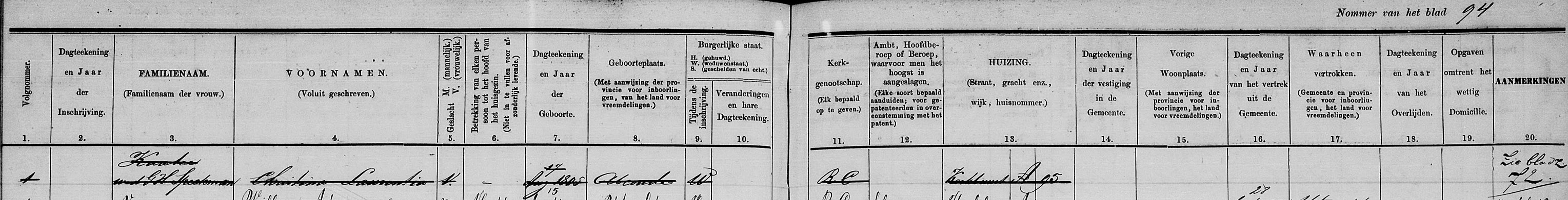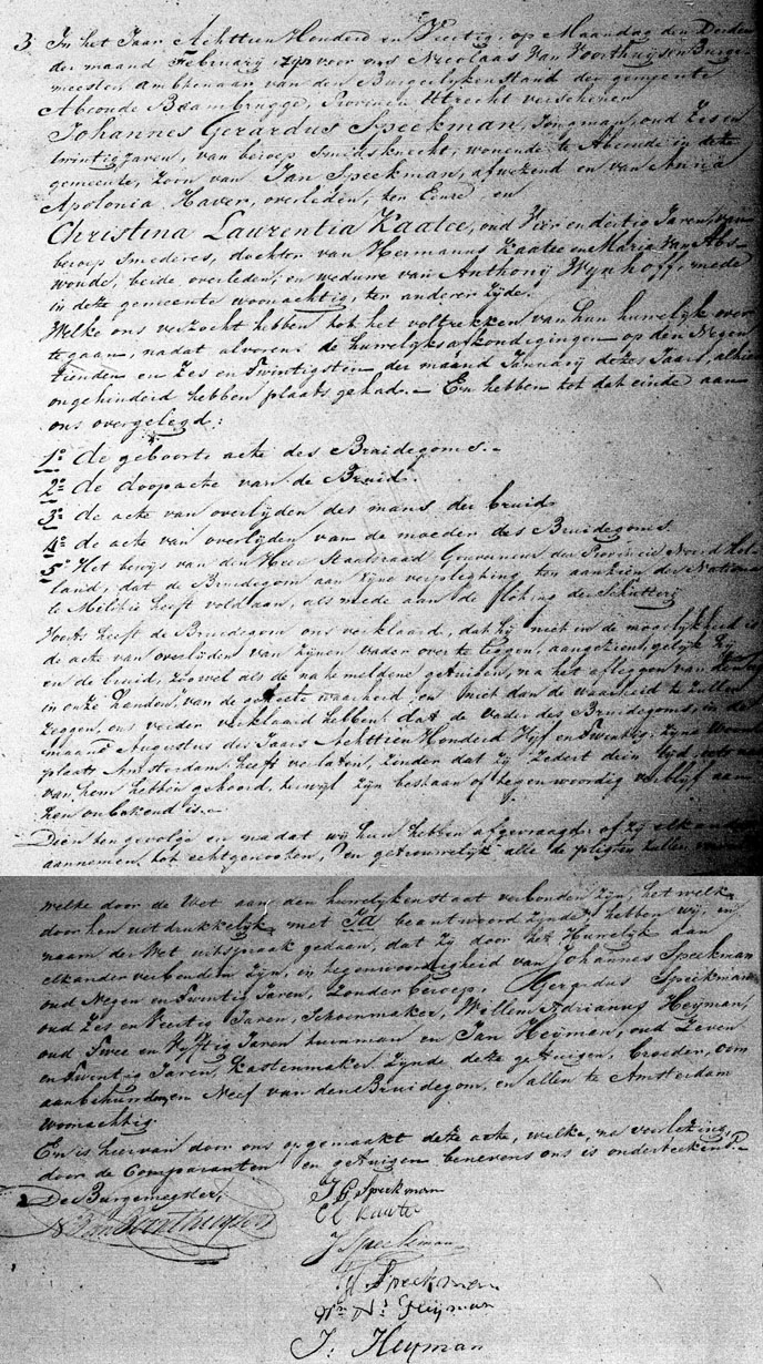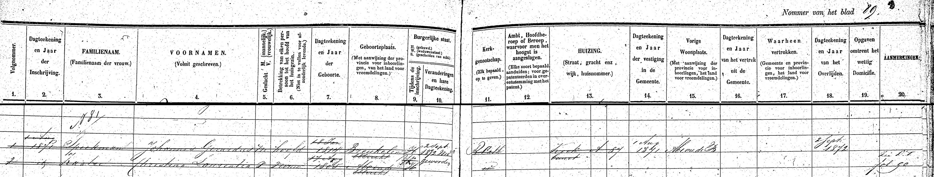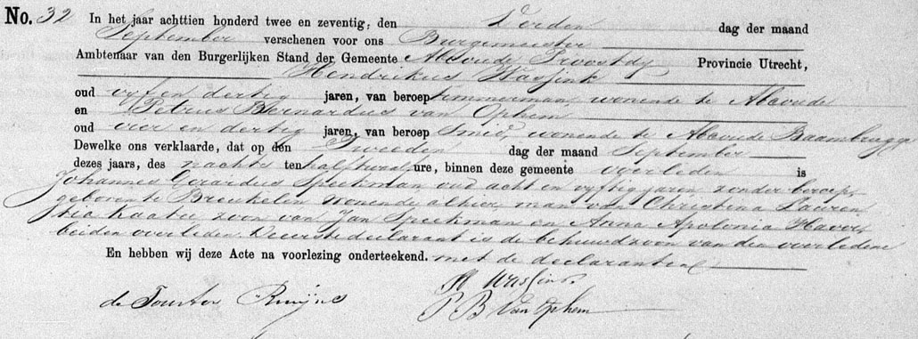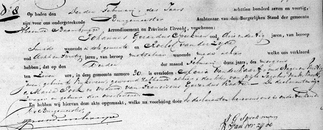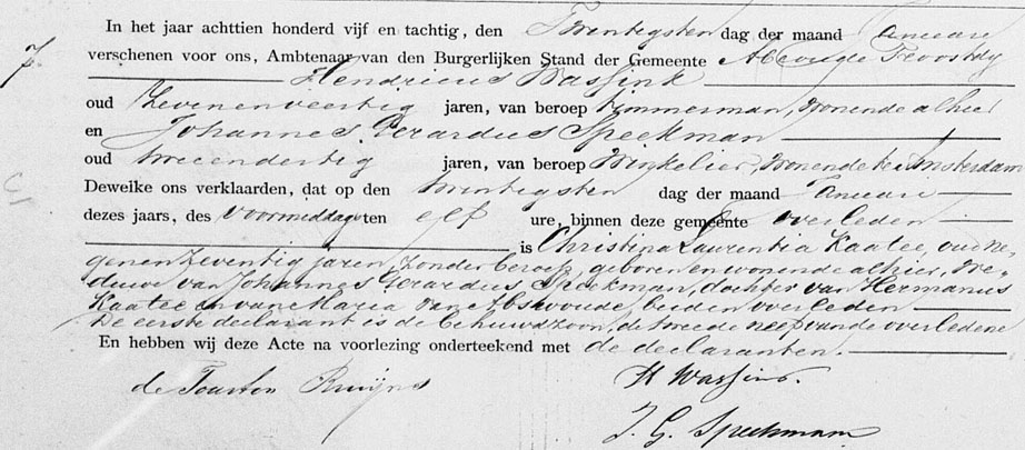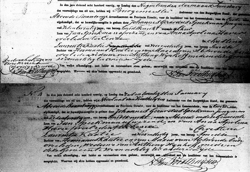 | 10. | v | Christina Laurentia (Christina Laurentia) Hermanus KAATEE [1054]. Geb. ±08-1805 te Abcoude-Proostdij (bron: ?), ged. (RK) op 17-08-1805 te Abcoude (get.: Jan van Abswoude en Klaasje van der Klos) (bron: DTB Abcoude inv nr 2). Overl. op 20-01-1885 te Abcoude-Proostdij (bron: BS Abcoude-Proostdij). Otr. (1) [375] op 01-11-1835 te Abcoude Baambrugge (bron: BS Abcoude Baambrugge). Echtgenoot is Anthonij (Anthonius) Hendriksz WIJNHOFF [1055]. Geb. ±10-1800 te Nijkerk (bron: ?), ged. (RK) op 02-10-1800 te Nijkerk (bron: ?). Overl. op 13-02-1839 te Abcoude Baambrugge (aang.: Franciscus Gerardus Kaatee (45) timmerman zwager van de overledene) (bron: BS Abcoude Baambrugge). Zn. van Hendrikus (Hendrikus) Teunisz WIJNHOFF [1056] en Isabella (Isabella) SCHEUNING [1057]. Anthonij Hendriksz Wijnhoff is weduwnaar: Otr. [376] op 10-08-1834 te Nederhorst den Berg (bron: BS Nederhorst den Berg) met Maria (Maria) Stevens VERNOOIJ [1058] geb. op ±09-1799 te Nederhorst den Berg (bron: ?), ged. op 19-09-1799 te Ankeveen (RK) (get: Jacob Neef) (bron: DTB Ankeveen inv nr 38a) dv: Steven (Steven) VERNOOIJ [1059] en Cornelia (Cornelia) NEEF [1060]. Otr. (2) [2469] op 19-01-1840 te Abcoude Baambrugge (bron: BS Abcoude Baambrugge). Echtgenoot is Johannes Gerardus (Johannes Gerardus) SPEEKMAN [7500], 26 jaar oud, Smid. Geb. op 18-01-1814 te Breukelen Nijenrode (bron: ? (GENLIAS)). Overl. op 02-09-1872 te Abcoude-Proostdij op 58-jarige leeftijd (bron: BS Abcoude-Proostdij). Zn. van Jan (Jan) SPEEKMAN [7501] en Anna Apolonia (Anna Apolonia) HAVER [7502]. Woonplaatsen na hun huwelijk: - Op __-__-____ Abcoude Baambrugge - Op 01-08-1871 Abcoude Proostdij - Kerkbuurt 87 (bron: bevolkingsregister Abcoude Proostdij 1859-1879 inv nr 587) - Op 07-08-1876 Abcoude Proostdij - Kerkbuurt 43 (bron: bevolkingsregister Abcoude Proostdij 1859-1879 inv nr 587) - Op __-__-18___ Abcoude Proostdij - Kerkbuurt A95 (bron: bevolkingsregister Abcoude Proostdij 1880-1889 inv nr 590) - Op 22-12-1884 Abcoude Proostdij - Kerkbuurt A75, 81 (bij haar dochter Anna Maria Speekman) (bron: bevolkingsregister Abcoude Proostdij 1880-1889 inv nr 590) |