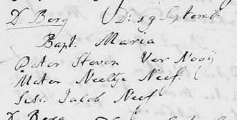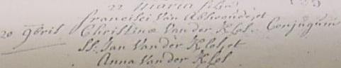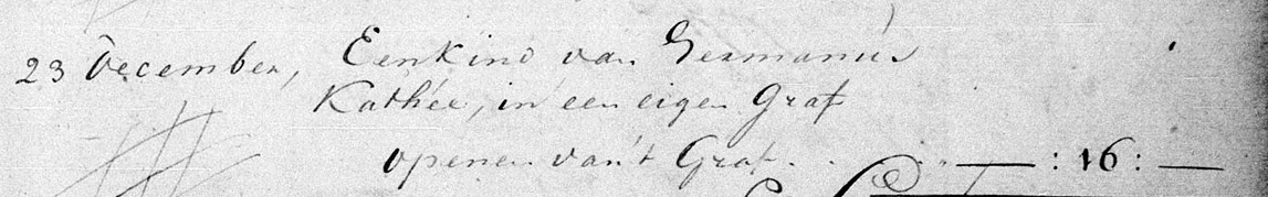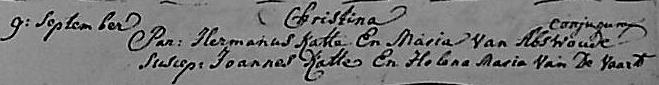 | 4. | v | Christina (Christina) Hermanus KAATEE [7503]. Geb. ±09-1796 te ? (bron: ?), ged. (RK) op 09-09-1796 te Abcoude (get.: Johannes Kaatee en Helena Maria van de Vaart) (bron: DTB Abcoude inv nr 2). Overl. ±12-1796 te Abcoude (bron: ?), begr. op 23-12-1796 te Abcoude (bron: DTB Abcoude inv nr 20). |