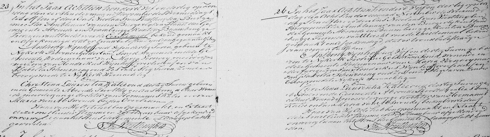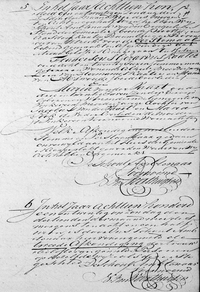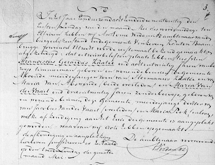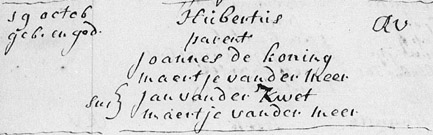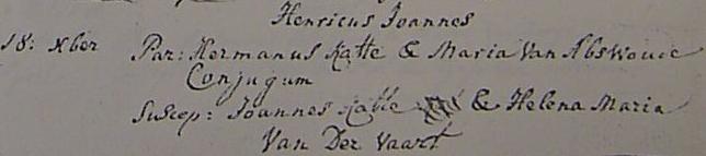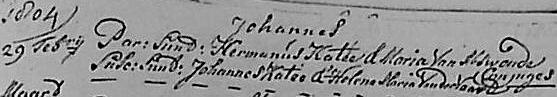 | 9. | m | Johannes (Johannes) Hermanusz KAATEE [8318]. Geb. ±02-1804 te ? (bron: ?), ged. (RK) op 29-02-1804 te Abcoude (get.: Johannes Kaatee en Helena Maria van der Vaart) (bron: DTB Abcoude inv nr 2). Overl. ? te ? Begr. ? te ? |