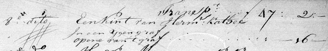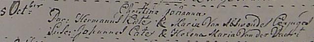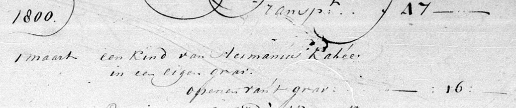 | 6. | v | Christina Johanna (Christina Johanna) Hermanus KAATEE [8315]. Geb. ±10-1799 te ? (bron: ?), ged. (RK) op 05-10-1799 te Abcoude (get.: Johannes Kaatee en Helena Maria van de Vaart) (bron: DTB Abcoude inv nr 2). Overl. ±03-1800 te Abcoude (bron: ?), begr. op 01-03-1800 te Abcoude (bron: DTB Abcoude inv nr 20). |