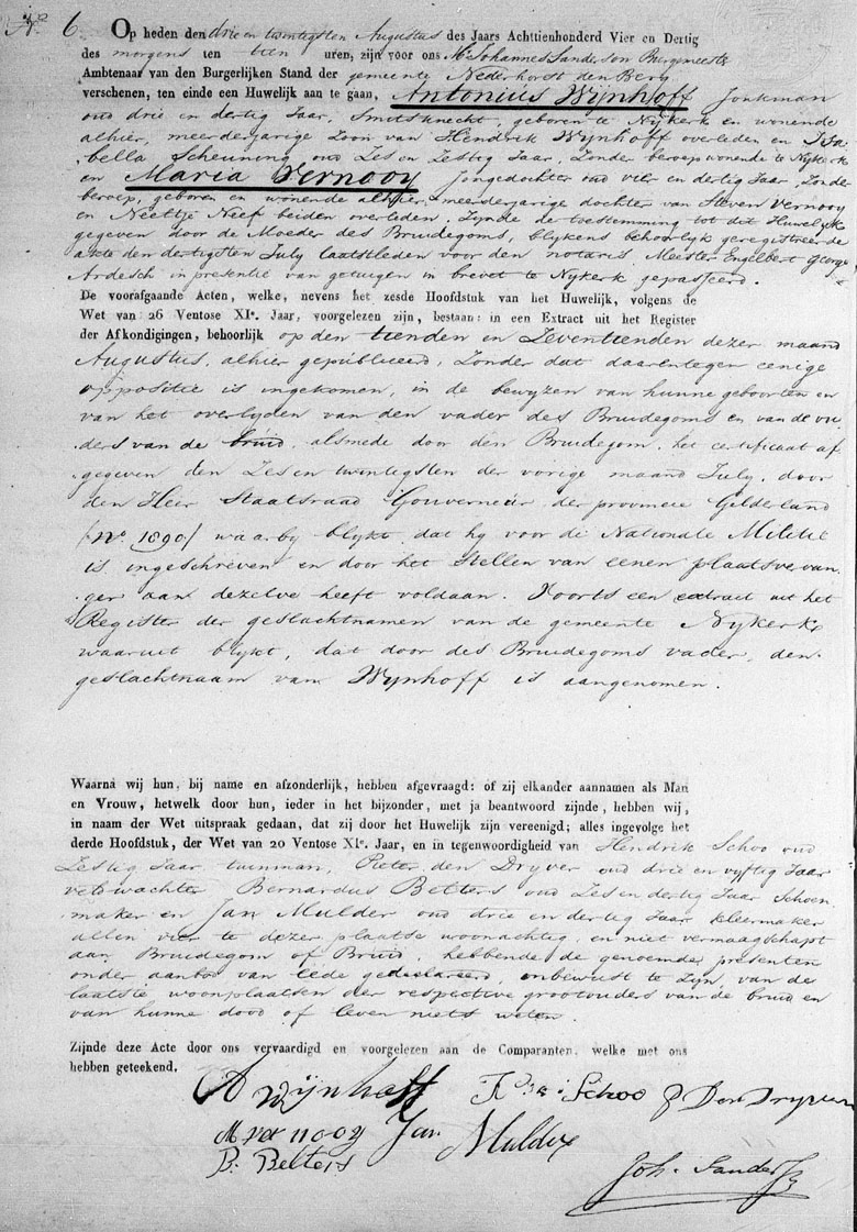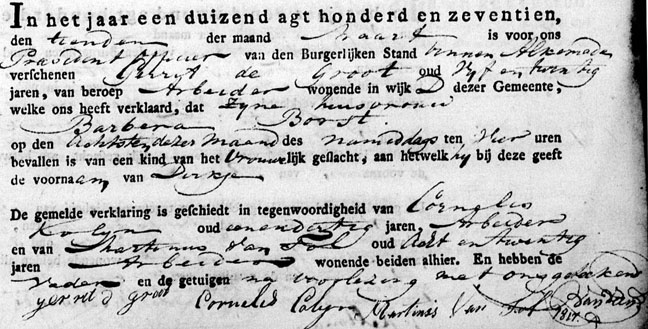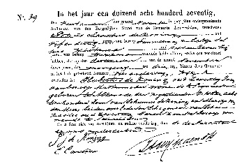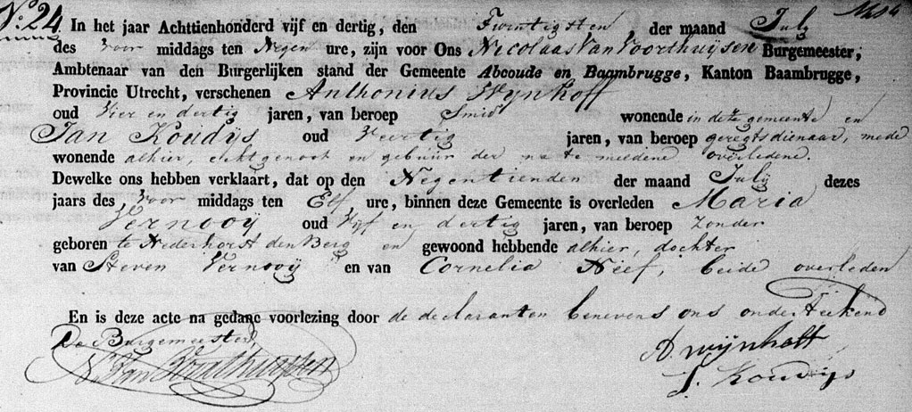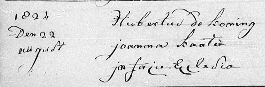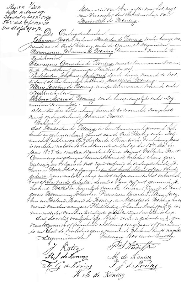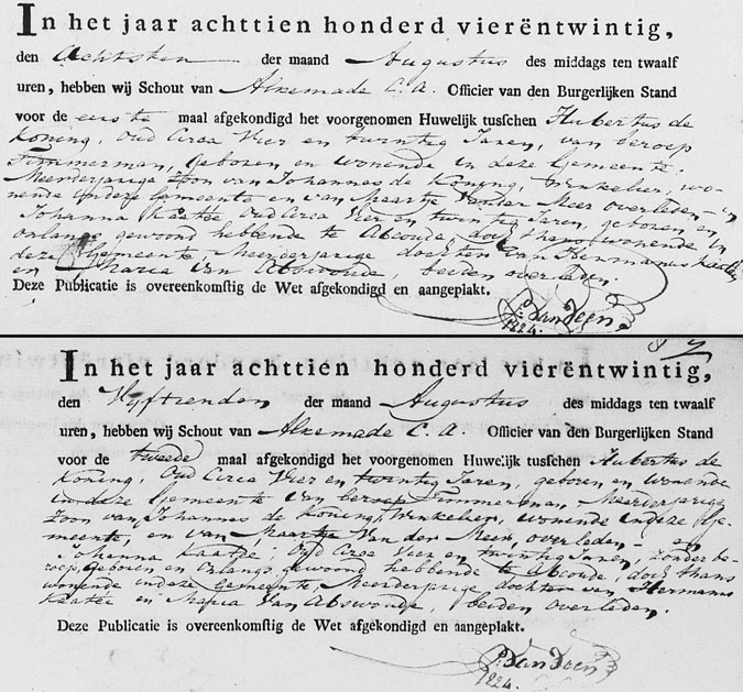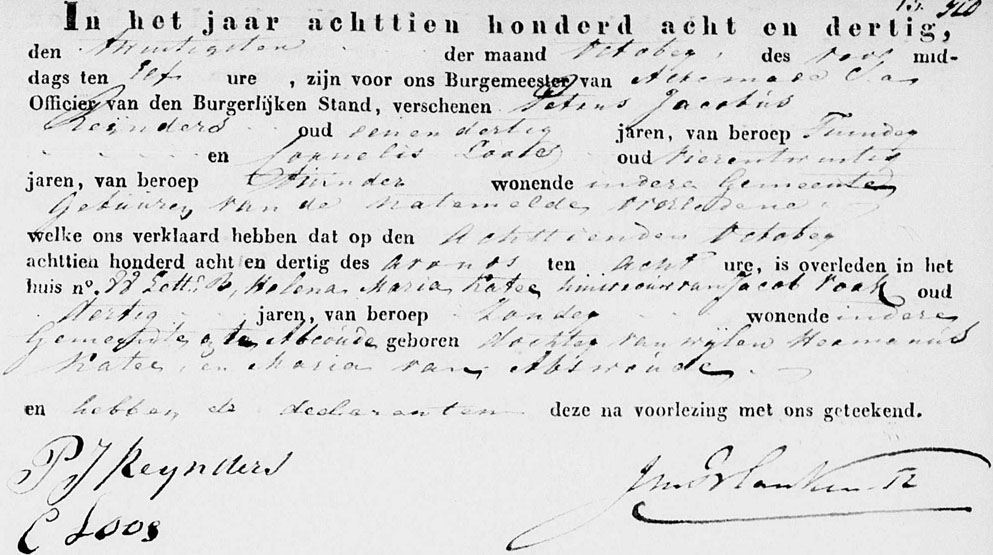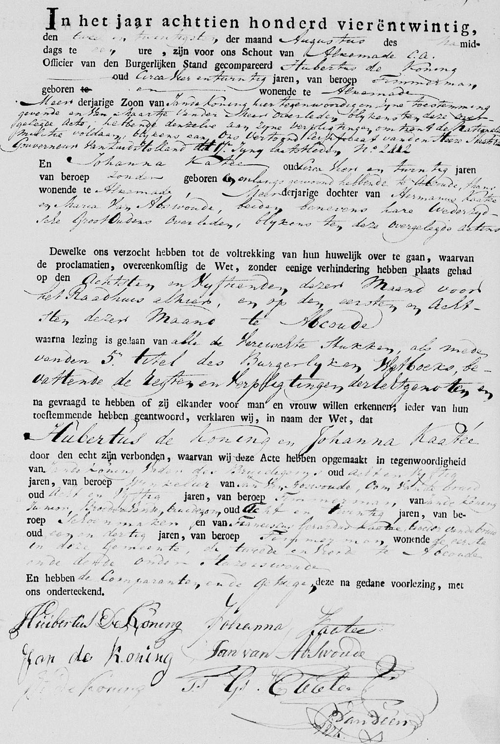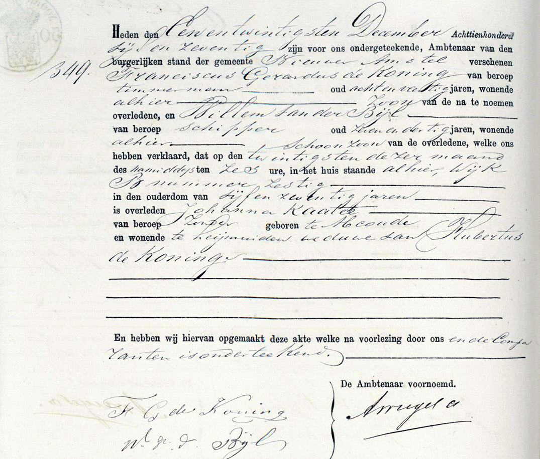 | 7. | v | Johanna (Johanna) Hermanus KAATEE [8316]. Geb. op 14-11-1800 te Abcoude (bron: ?), ged. (RK) op 14-11-1800 te Abcoude (get.: Hendrik Kaatee en Johanna van Beekom) (bron: DTB Abcoude inv nr 2). Overl. op 20-12-1875 te Nieuwer Amstel op 75-jarige leeftijd (aang.: oa Franciscus Gerardus de Koning zoon en Willem van der Bijl schoonzoon van de overledene) (bron: BS Nieuwer Amstel, Leimuiden). Otr. [5386] op 08-08-1824 te Alkemade / Abcoude-Baambrugge (bron: BS Alkmade + Abcoude Baambrugge). Echtgenoot is Hubertus (Hubertus) Jansz de KONING [17448], 23 jaar oud, timmerman, mastenmaker. Geb. op 19-10-1800 te Roelof Arendsveen (aang.: ?). Overl. op 13-11-1870 te Leimuiden op 70-jarige leeftijd (bron: BS Leimuiden, memorie van succesie). Zn. van Johannes (Jan) Pietersz de KONING [17449] en Maria (Maartje) Huiberts van der MEER [17450]. . |