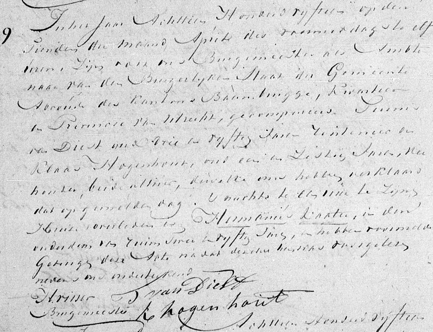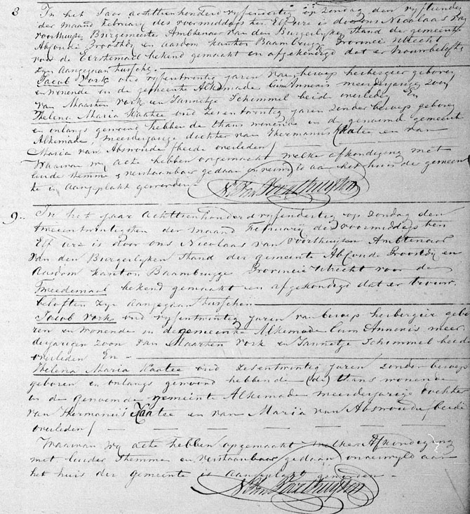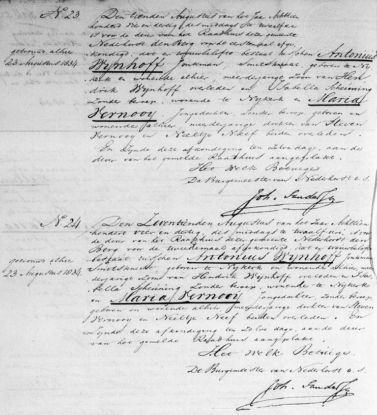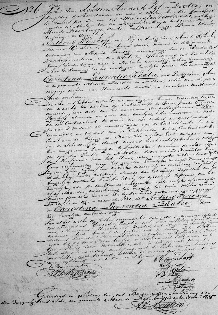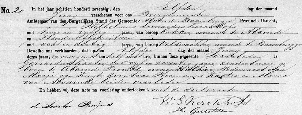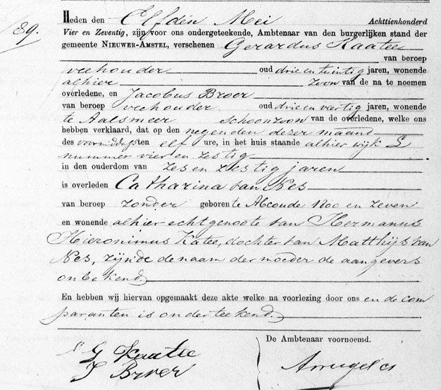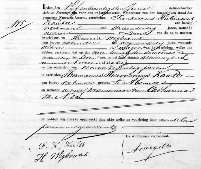 | 11. | m | Hermanus Hieronimus (Hermanus Hieronimus) Hermanusz KAATEE [1062], veehouder. Geb. ±09-1806 te Abcoude-Proostdij (bron: ?), ged. (RK) op 30-09-1806 te Abcoude (get.: Henricus Kaatee en Johanna van der Dooren) (bron: DTB Abcoude inv nr 2). Overl. op 24-06-1878 te Nieuwer Amstel (bron: BS Nieuwer Amstel). Otr. [388] op 11-04-1830 te Abcoude-Proostdij (bron: Abcoude-Proostdij). Echtgenote is Catharina (Catharina) Tijs van NES (van Es) [1070]. Geb. ±1808 te Abcoude-Proostdij (bron: ?), ged. (RK) op 22-01-1808 te Abcoude (get.: Jan Bon en Catharina van Rhijn) (bron: DTB Abcoude inv nr 2). Overl. op 09-05-1874 te Nieuwer Amstel (bron: BS Nieuwer Amstel). Dr. van Matthias (Matthias) Hannisz van NES (van Es) [1071] en Elisabeth (Elisabeth) Dirks van RHIJN [1072]. Woonplaatsen na vertrek ouderlijkhuis te _: - Op 31-12-1859 Nieuwer Amstel - L62, 17 (bron: bevolkingsregister Nieuwer Amstel 1860-1870 inv nr 21 + 1869-1876 inv nr 65) |