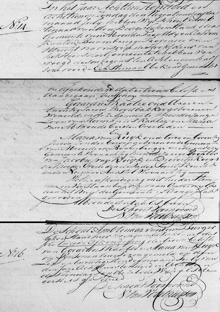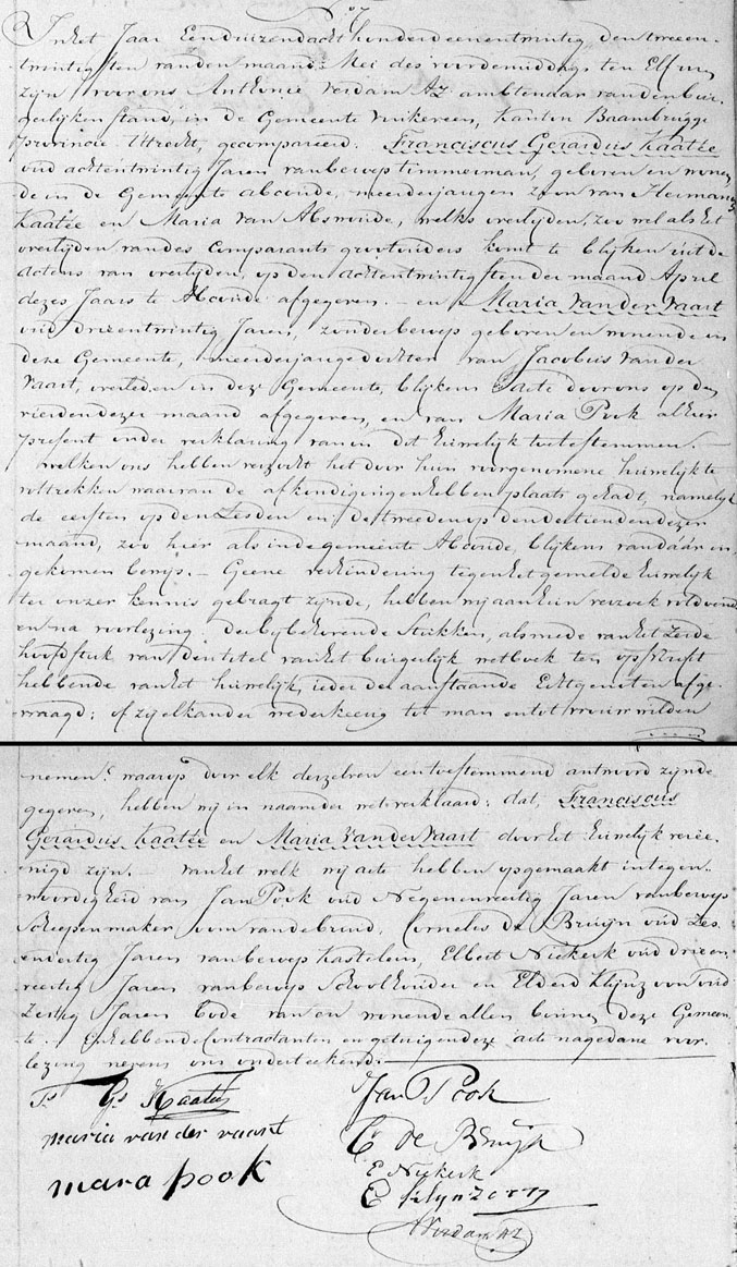 | 2. | m | Fransiscus Gerardus (Fransiscus Gerardus) Hermanusz KAATEE [1063], timmerman. Geb. ±07-1793 te Abcoude (bron: ?), ged. (RK) op 27-07-1793 te Abcoude (get.: Gerrit Kaatee en Christina van der Klos) (bron: DTB Abcoude inv nr 2). Overl. op 11-10-1843 te Abcoude Baambrugge (aang.: o.a. Johannes Gerardus Speekman (29) zwager van de overledene) (bron: BS Abcoude Baambrugge). In kadaster wordt Fransiscus Gerardus Kaatee, timmerman vermeld als eigenaar van kavel 370 en 371 te Abcoude broekzijder polder huis en erf Otr. [386] op 06-05-1821 te Vinkeveen en Waverveen / Abcoude Proostdij (bron: BS Vinkeveen en Waverveen / BS Abcoude Proostdij). Echtgenote is Maria (Maria) Jacobs van der VAART [1065]. Geb. ±11-1797 te Vinkeveen (bron: ?), ged. (RK) op 17-11-1797 te Vinkeveen (bron: ?). Overl. op 03-02-1847 te Abcoude Baambrugge (aang.: Johannes Gerardus Speekman (43) smid zwager van de overledene) (bron: BS Abcoude Baambrugge). Dr. van Jacobus (Jacobus) van der VAART [1066] en Maria (Maria) POOK [1067]. |
