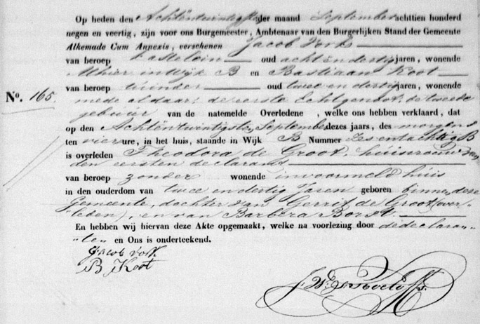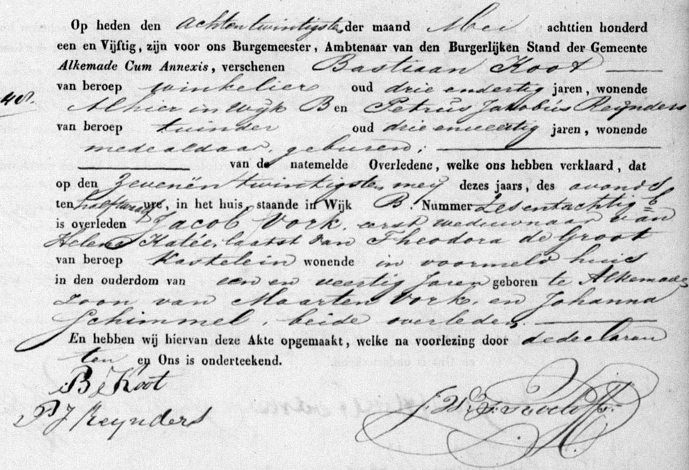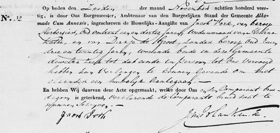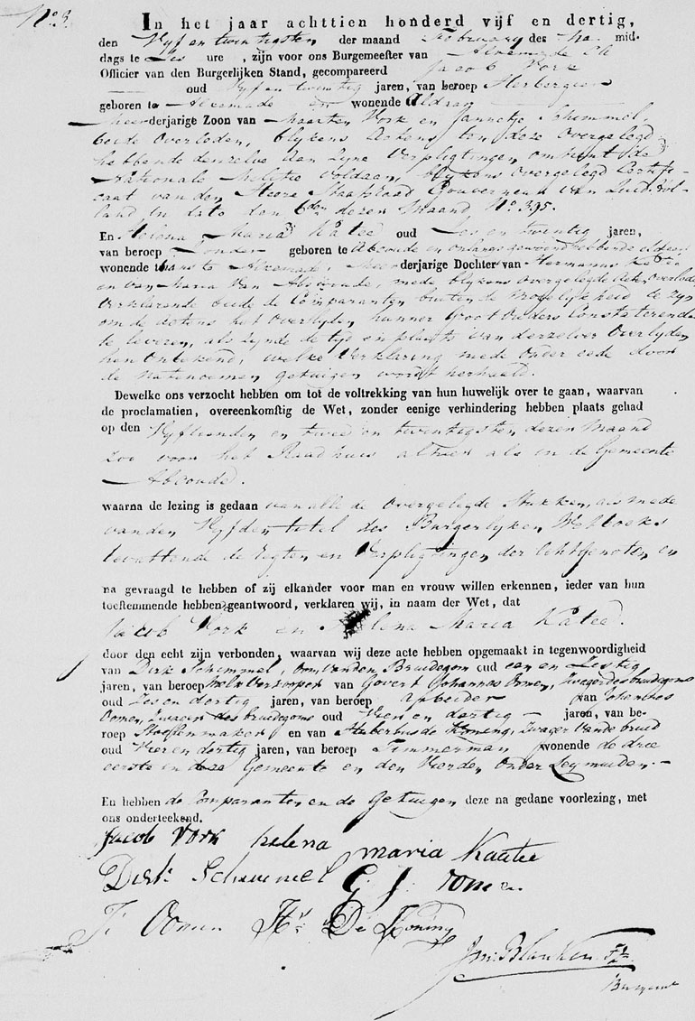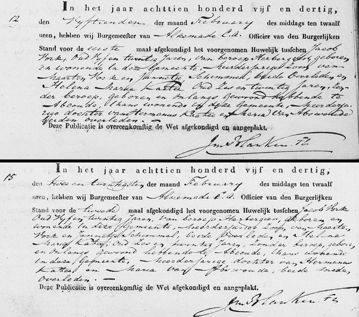 | 12. | v | Helena Maria (Helena Maria) Hermans KAATEE (Kater) [6629]. Geb. op 19-04-1808 te Abcoude (bron: ?), ged. (RK) op 19-04-1808 te Abcoude (get.: Johannes Kaatee en Maria van der Vaart) (bron: DTB Abcoude inv nr 2). Overl. op 18-10-1838 te Alkemade op 30-jarige leeftijd (bron: BS Alkemande). Otr. [2237] op 15-02-1835 te Alkemade / Abcoude (bron: BS Alkemade + Abcoude). Echtgenoot is Jacob (Jacob) Maartensz VORK [6630], 25 jaar oud, herbergier. Geb. op 15-12-1809 te Alkemade (bron: ?), ged. (?) op 15-12-1809 te Roelofarendsveen (bron: ?). Overl. op 27-05-1851 te Alkemade op 41-jarige leeftijd (bron: BS Alkemade). Zn. van Martinus (Maarten) VORK [6631] en Jannitje (Jannetje) SCHIMMEL [6632]. Jacob Vork hertrouwd: Otr.[4750] op 06-11-1840 te Alkemade (bron: BS Alkemade) met Theodora (Theodora) GROOT, DE [15162], geb. op 08-03-1817 te Alkemada (bron: BS Alkemade) overl. op 28-09-1849 te Alkmade (bron: BS Alkemade) dr. van Gerrit (Gerrit) GROOT, DE [15163] en Barbara (Barbara) BORST [15164]. |