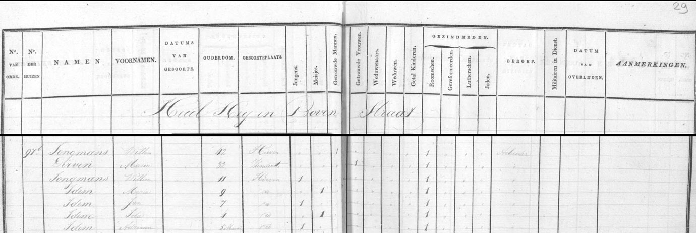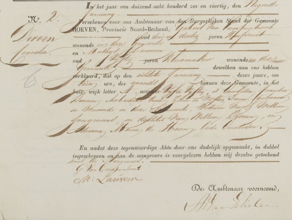 | 8. | m | Wilhelmus (Wilhelmus) Willebrordusz JONGMANS [7563], arbeider. Geb. ±09-1780 te ? (bron: ?), ged. (RK) op 10-09-1780 te Hoeven (get.: Christoffel Mol en Johanna Jonghmans voor Petronella Jonghmans) (bron: DTB Hoeven RK dopen inv nr 5). Overl. op 07-01-1836 te Hoeven (bron: BS Hoeven). Otr. [2718] ? te ? Tr. op 15-12-1811 te Hoeven (bron: BS Hoeven), tr. kerk ? te ? Echtgenote is Cornelia (Cornelia) Wilhelmus DIRVEN [8363], arbeidster. Geb. ±1790 te Zundert (bron: ?), ged. ? te ? Overl. op 08-01-1846 te Hoeven (bron: BS Hoeven). Dr. van Wilhelmus (Wilhelmus) Adriaansz DIRVEN [8364] en Anna Maria (Anna Maria) de HOON [8365]. Woonplaatsen na hun huwelijk: - Op __-__-____ Hoeven - Huil heij en bovenstraat 97b (bron: bevolkingsregister Hoeven 1821-1825 inv nr 1195) |