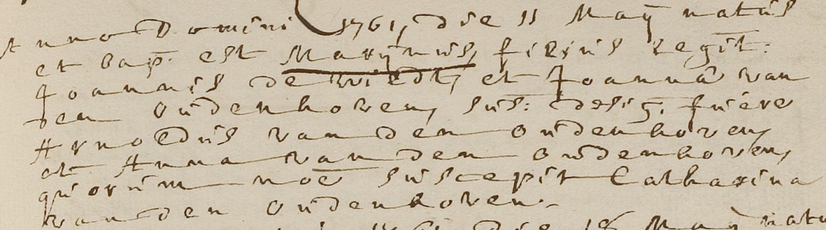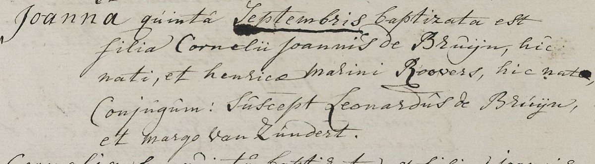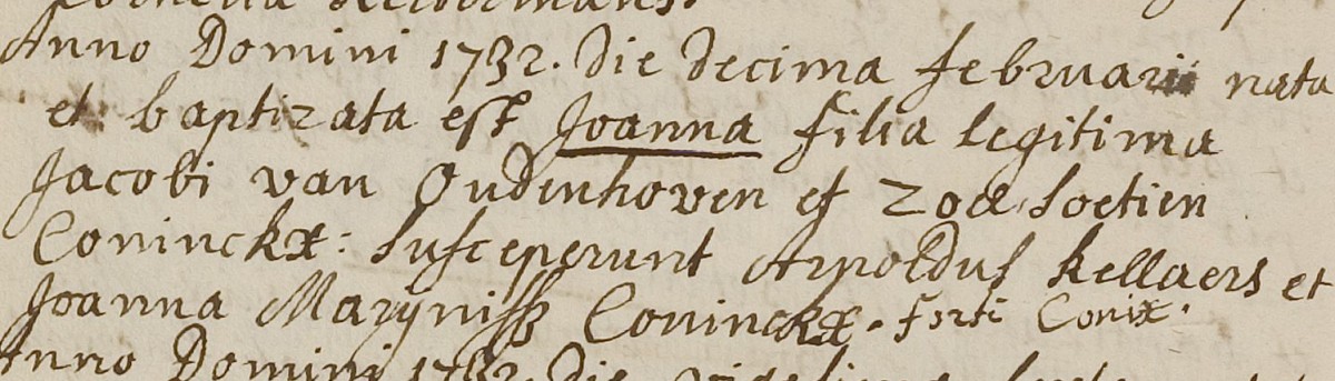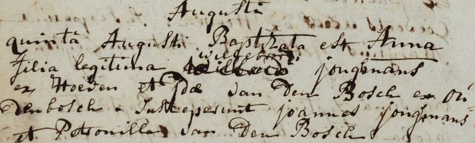 | 1. | v | Maria (Maria) Willebrordus JONGMANS [7557]. Geb. ±08-1765 te ? (bron: ?), ged. (RK) op 12-08-1765 te Etten (get.: Marinus Jongmans en Maria Schouwers) (bron: DTB Etten Leur RK dopen Etten inv nr 7). Overl. op 05-08-1778 te Hoeven (bron: ?), begr. op 07-08-1778 te Hoeven (bron: DTB Hoeven NH Begraven inv nr 15). |