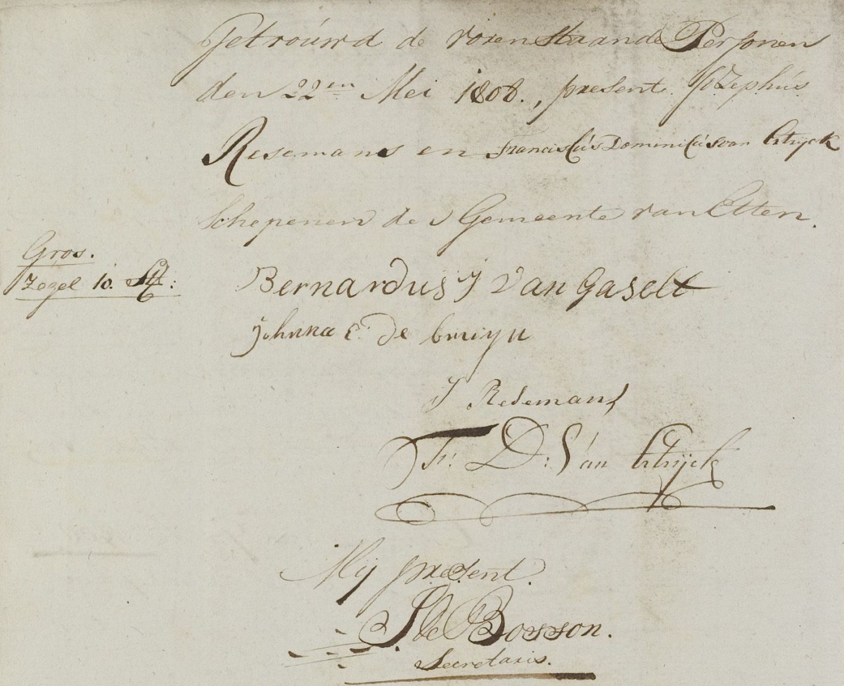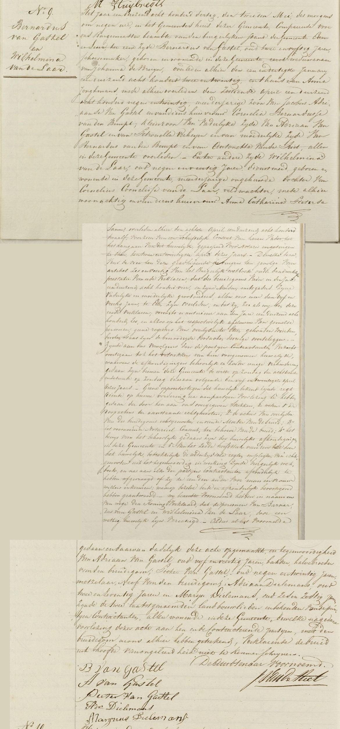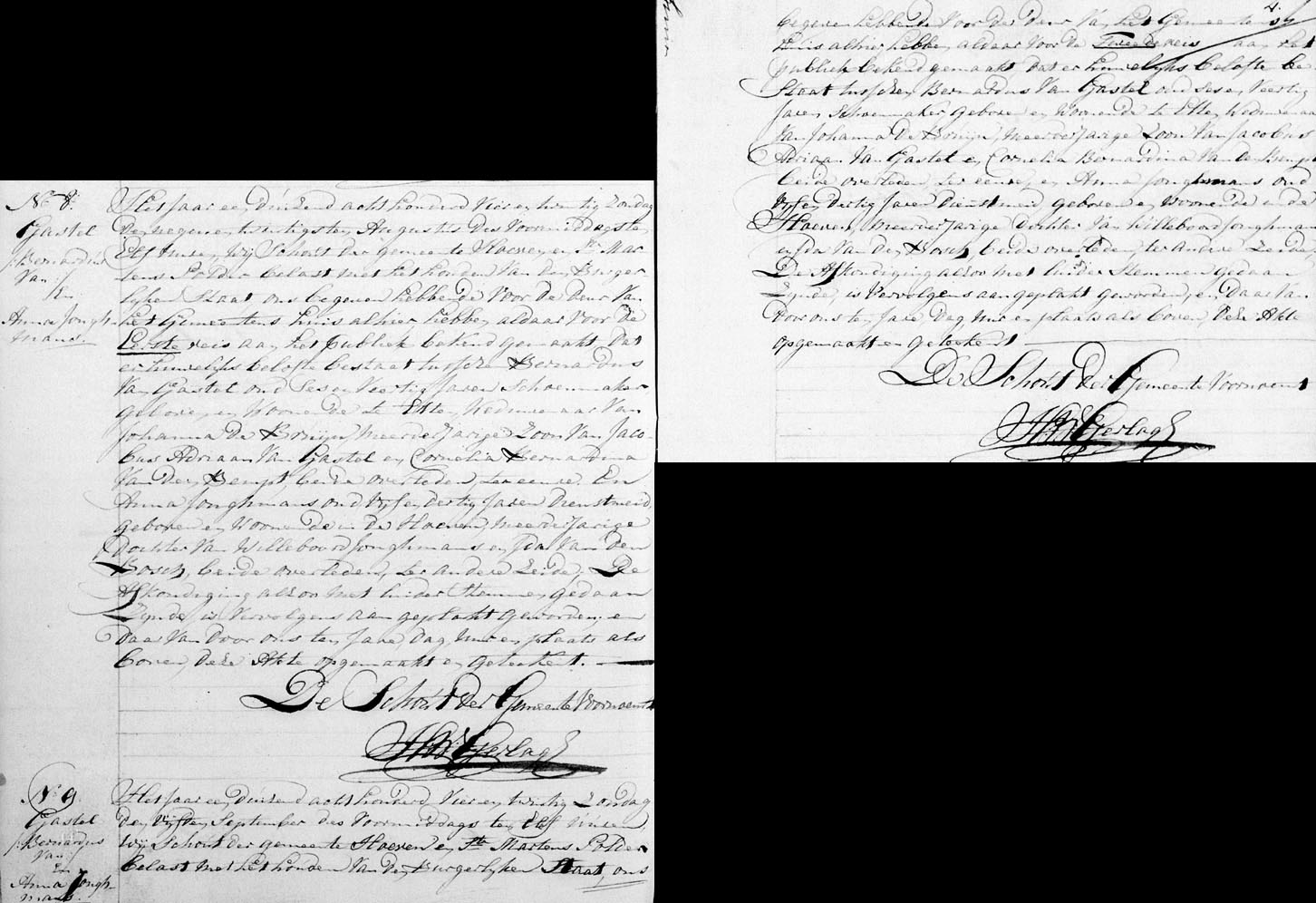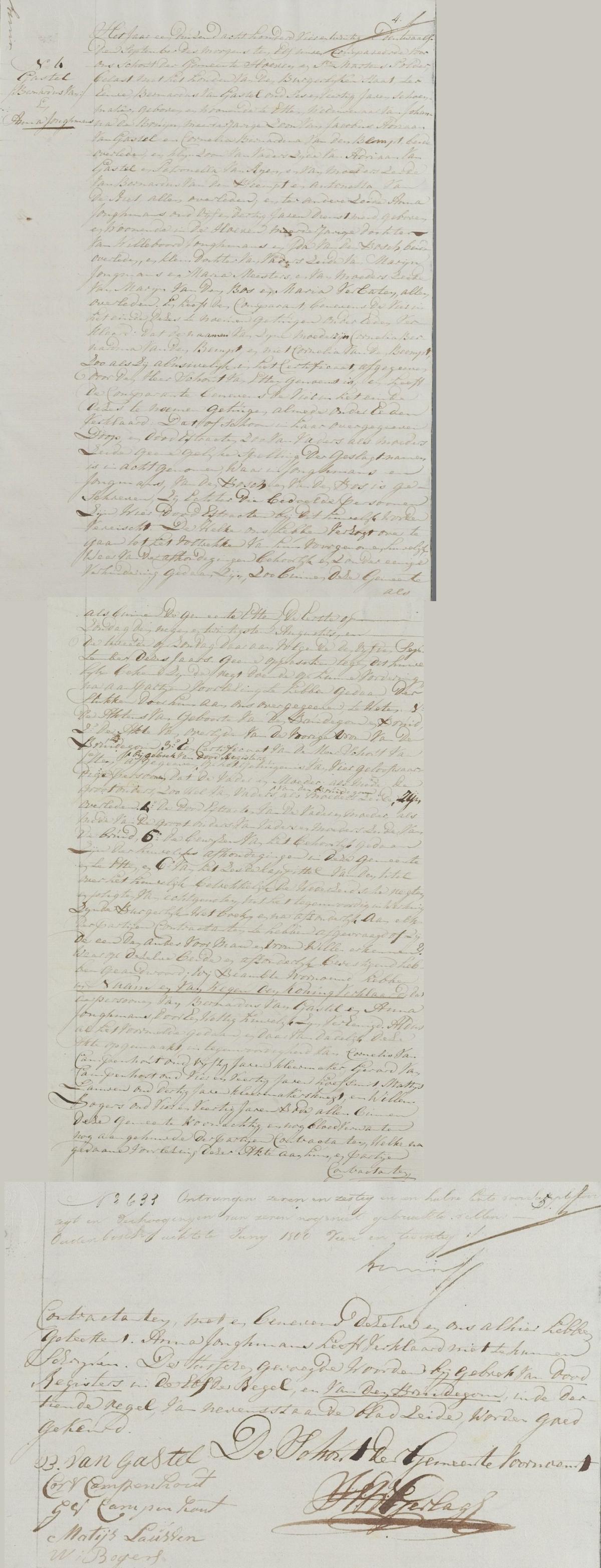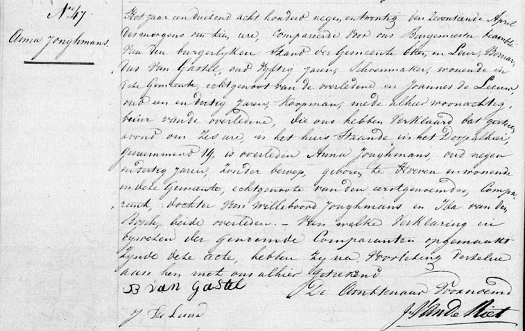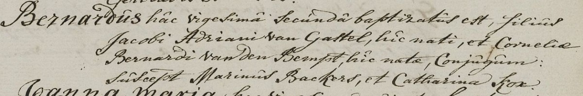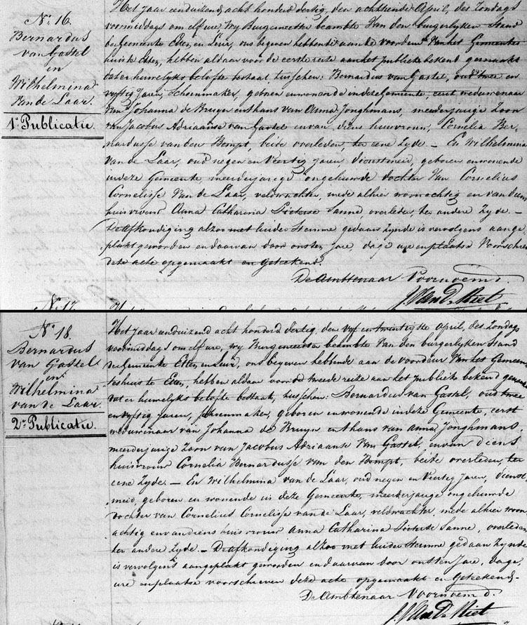 | 12. | v | Anna (Anna) Willebrordus JONGMANS [7567] (code: RK). Geb. ±08-1789 te Hoeven (bron: ?), ged. (RK) op 05-08-1789 te Hoeven (get.: Johannes Jonghmans en Petronella van den Bosch) (bron: DTB Hoeven RK dopen inv nr 6). Overl. op 16-04-1829 te Etten Leur (bron: BS Etten Leur). Otr. [2720] ? te ? Echtgenoot is Bernardus (Bernardus) Jacobsz van GASTEL [8369], schoenmaker. Geb. ±03-1778 te Etten (bron: ?), ged. (RK) op 22-03-1778 te Etten (get.: Marinus Backers en Catharina Kox) (bron: DTB Etten Leur RK dopen Etten inv nr 8). Overl. op 11-06-1840 te Etten Leur (bron: BS Etten Leur). Zn. van Jacob (Jacob) Adriaansz van GASTEL [8370] en Cornelia (Cornelia) Bernardus van den BEMPT (van den Beempt) [8371]. Bernardus Jacobsz van Gastel was weduwnaar: Otr.[3477] op 07-05-1808 te Etten (bron: DTB Etten Leur Schepenbank inv nr 27) met Johanna (Johanna) Cornelis BRUIJN de [10897] geb. op ? te ?, ged. op 05-09-1777 te Etten (get.: Leonardus de Bruijn en Margo van Zundert)(bron: DTB Etten Leur RK dopen Etten inv nr 8) overl. op 31-01-1822 te Etten Leur (bron: DTB Etten Leur) dr. van Cornelis (Cornelis) Johannesz BRUIJN de [10898] en Henrica (Henrica) Marinus ROOVERS [10899] Bernardus Jacobsz van Gastel hertrouwd: Otr.[3539] op 18-04-1830 te Etten Leur (bron: BS Etten Leur) met Wilhelmina (Wilhelmina) LAAR, van de[11107] geb. op ? te ?, ged. op 13-11-1780 te Etten (get.: Jacobus van de Weijgerde en Digna Cornelis van de Laar)(bron: DTB Etten Leur RK dopen Etten inv nr 8) overl. op 06-05-1843 te Etten Leur (bron: BS Etten Leur) dr. van Cornelis (Cornelis) Cornelis LAAR, van de [11108] en Anna Catharina (Catharina) Pieters SANNE [11109] (alias: van de Zande). |