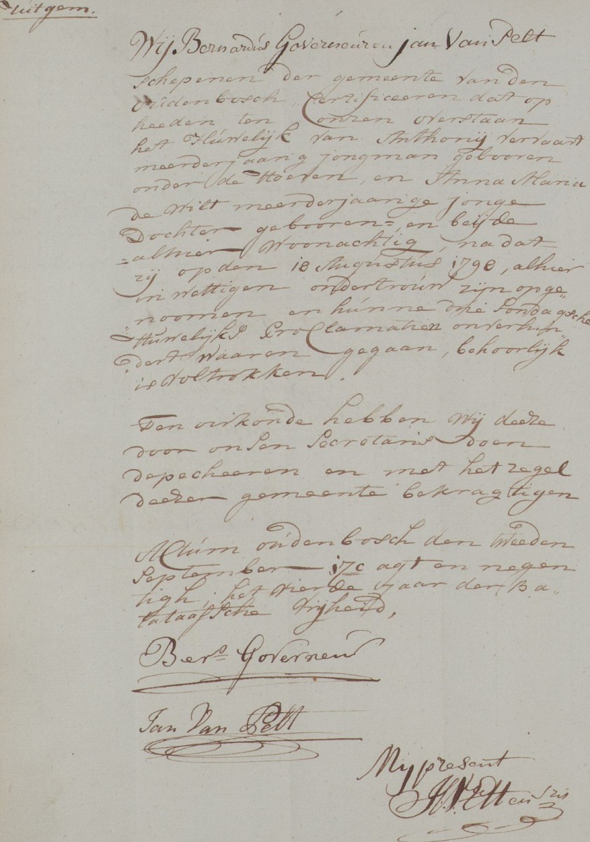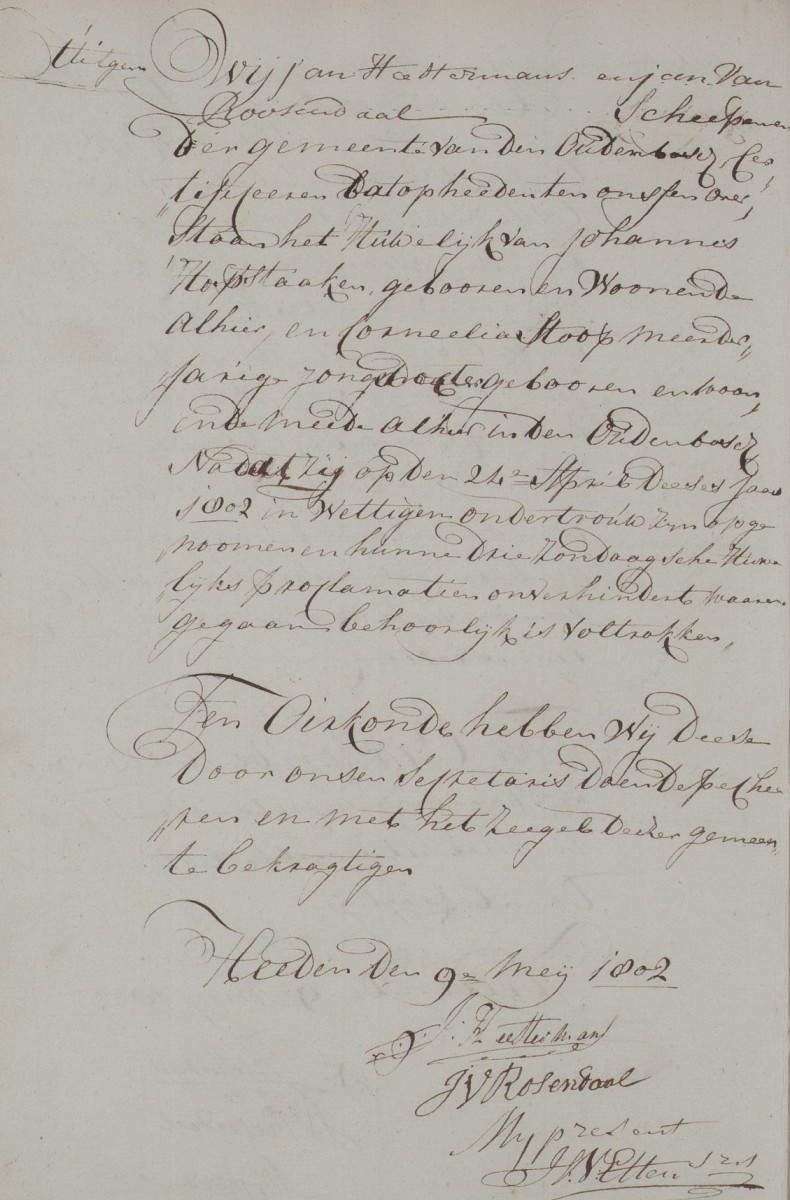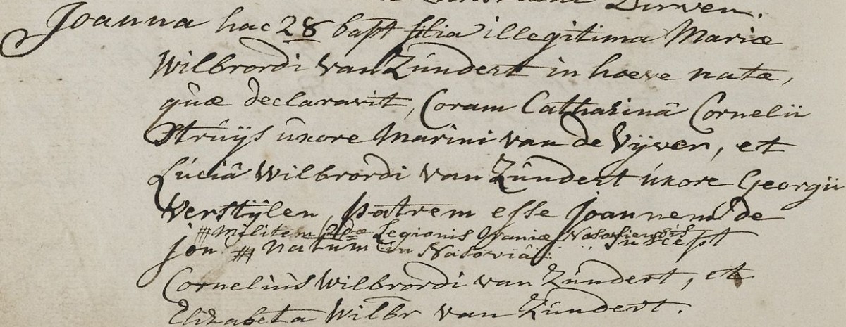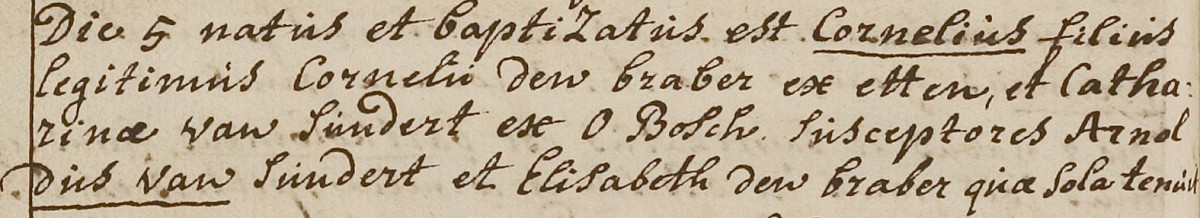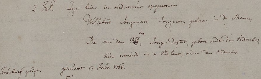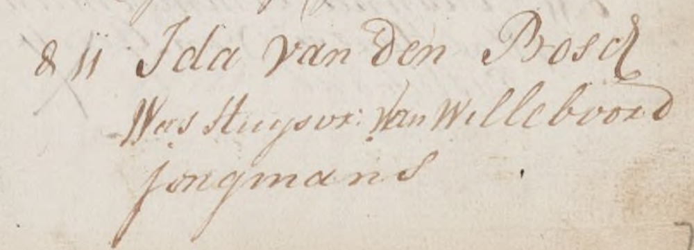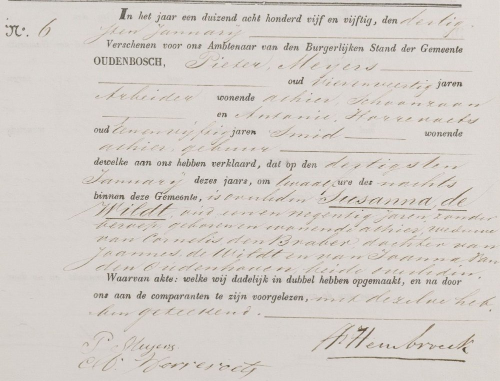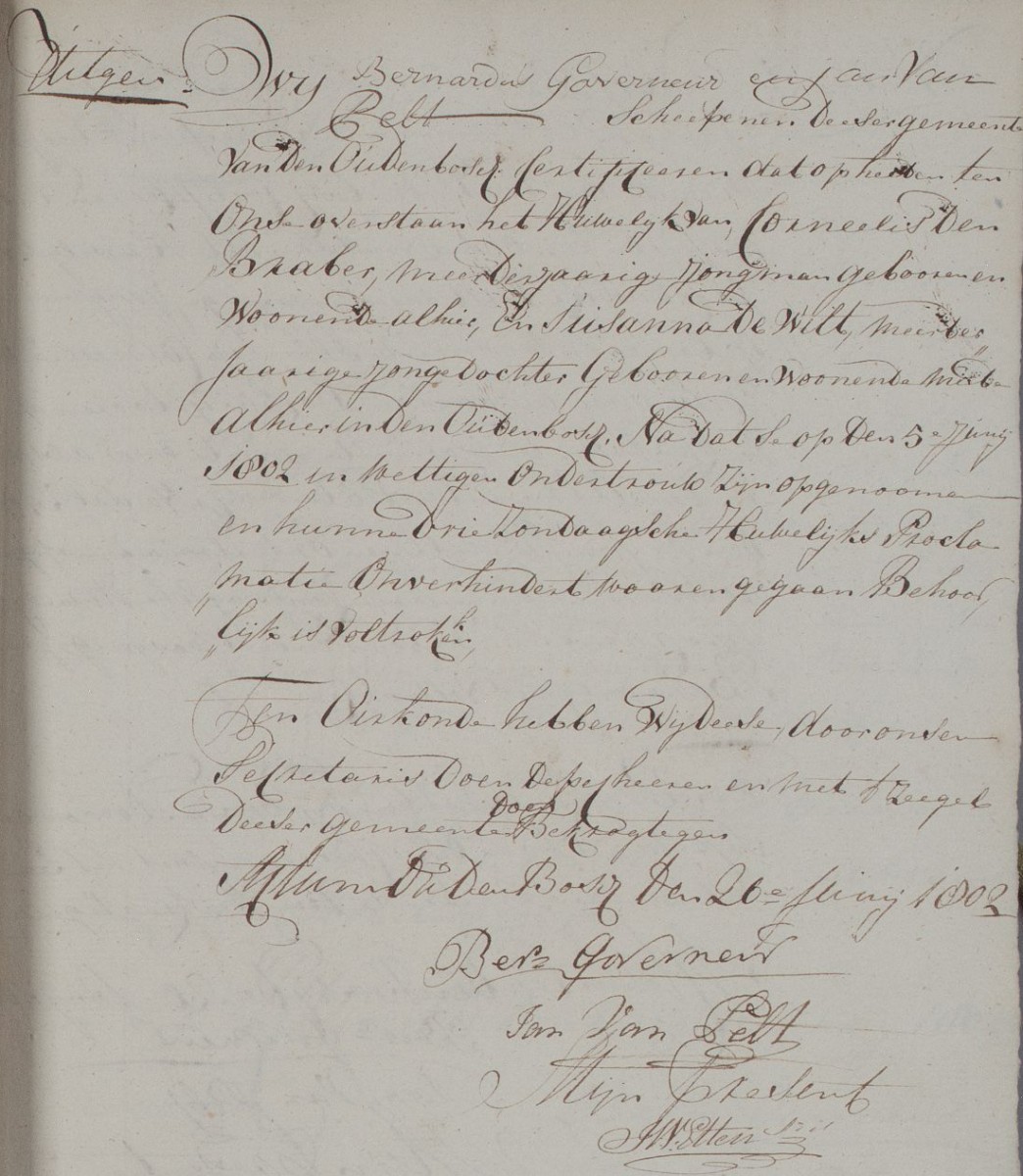 | 2. | v | Suzanna (Suzanna) Johannes de WILD [9546]. Geb. op 05-02-1764 te Oudenbosch (bron: DTB Oudenbosch RK dopen inv nr 5). Overl. op 30-01-1855 te Oudenbosch op 90-jarige leeftijd (bron: BS Oudenbosch). Otr. [3097] op 05-06-1802 te Oudenbosch (bron: DTB Oudenbosch schepenbank trouwen inv nr 19). Echtgenoot is Cornelis (Cornelis) Cornelisz den BRABER [9550], 29 jaar oud, werkman, eigenaar aannemersbedrijfje. Geb. op 05-08-1772 te Oudenbosch (bron: DTB Oudenbosch RK dopen inv nr 5). Overl. op 14-12-1828 te Oudenbosch op 56-jarige leeftijd (bron: BS Oudenbosch). Zn. van Cornelis (Cornelis) den BRABER [9551] en Catharina (Catharina) van SUNDERT [9552]. |