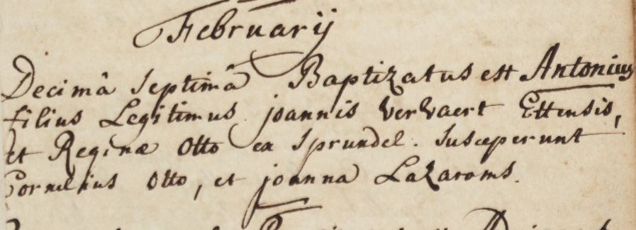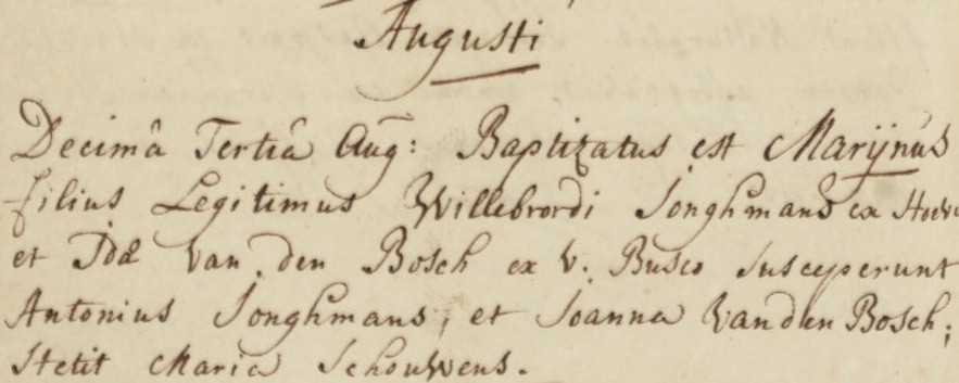 | 9. | m | Antonius (Antonius) Willebrordusz JONGMANS [7564]. Geb. ±10-1782 te ? (bron: ?), ged. (RK) op 13-10-1782 te Hoeven (get.: Johannes Struijs en Agatha de Rooij voor Anna Jonghmans) (bron: DTB Hoeven RK dopen inv nr 5). Overl. ? te ? Begr. ? te ? |