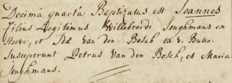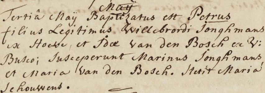 | 7. | m | Petrus (Petrus) Willebrordusz JONGMANS [7562]. Geb. ±07-1778 te ? (bron: ?), ged. (RK) op 24-07-1778 te Hoeven (get.: Wilhelmus Lauwe en Maria Schouwens voor Petronella Jonghmans) (bron: DTB Hoeven RK dopen inv nr 5). Overl. voor 1785 te ? (bron: ?), begr. ? te ? |