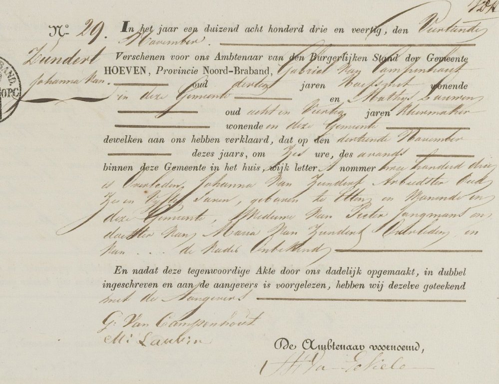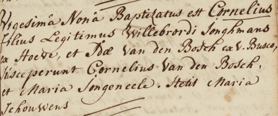 | 4. | m | Cornelius (Cornelis) Willebrordusz JONGMANS [7560], arbeider. Geb. ±01-1772 te Hoeven (bron: ?), ged. (RK) op 29-01-1772 te Hoeven (get.: COrnelis van den Bosch en Maria Schouwens voor Maria Jongeneele) (bron: DTB Hoeven RK dopen inv nr 5). Overl. op 30-03-1835 te Hoeven (aang.: o.a. Willem Jongmans (54) arbeider broer van de overledene) (bron: BS Hoeven). |