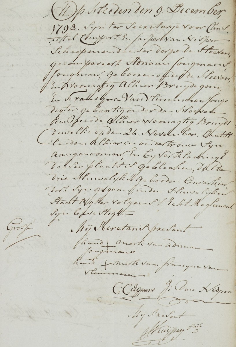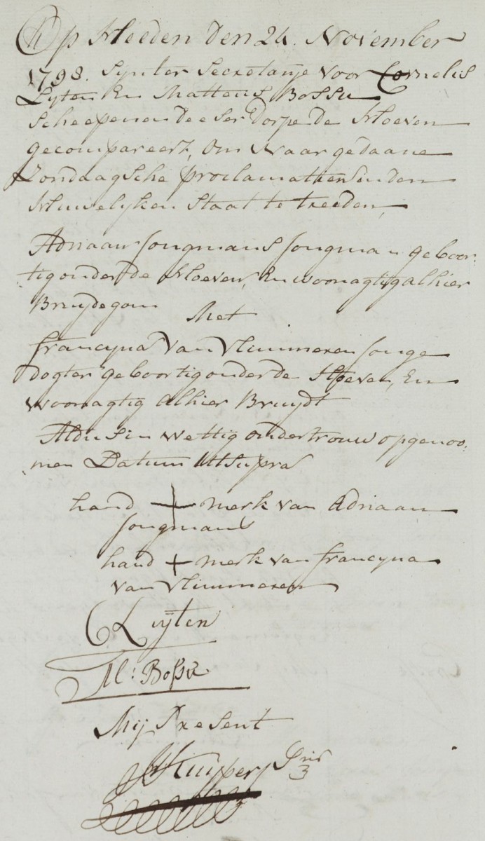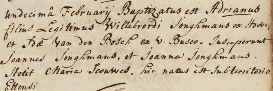 | 5. | m | Adrianus (Adriaan) Willebrordusz JONGMANS [7561]. Geb. ±02-1774 te Etten (bron: ?), ged. (RK) op 11-02-1774 te Hoeven (get.: Johannes Jonghmans en Maria Scouwens voor Johanna Jonghmans) (bron: DTB Hoeven RK dopen inv nr 5). Overl. op 18-02-1818 te Hoeven (bron: BS Hoeven). Otr. [3478] op 24-11-1798 te Hoeven (bron: DTB Hoeven Schepenbank inv nr 21). Echtgenote is Francisca (Francina) van VLIMMEREN [10900]. Geb. ±03-1778 te Hoeven (bron: ?), ged. (RK) op 18-03-1778 te Hoeven (get.: Joannes van Ekelen en Guillielma van Vlimmeren) (bron: DTB Hoeven inv nr 5). Overl. op 01-02-1860 te Etten (bron: ?), begr. ? te ? Dr. van Wijnand (Wijnand) van VLIMMEREN [10901] en Eva (Eva) Jans ? [10902]. |