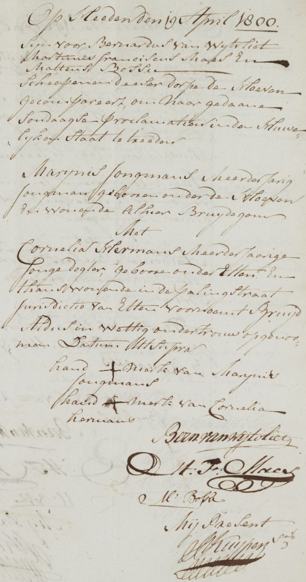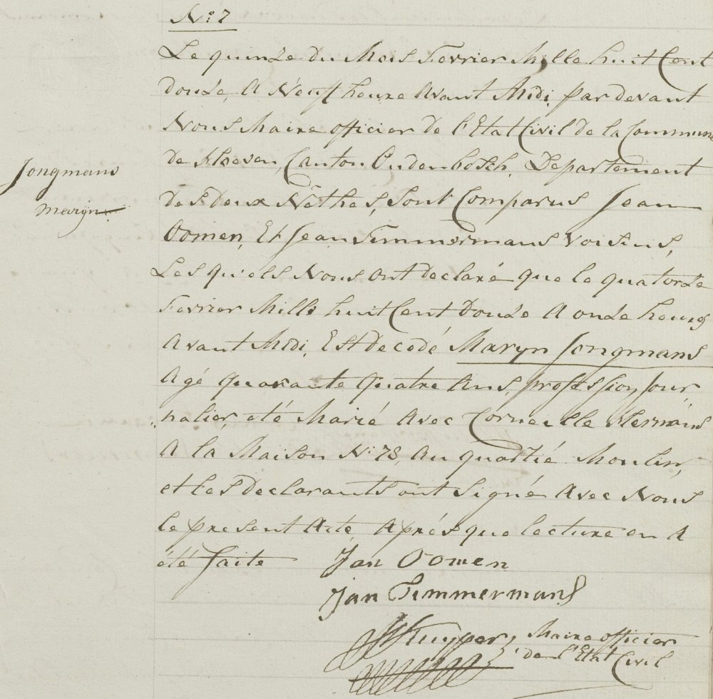 | 2. | m | Marijnis (Marijnis) Willebrordusz JONGMANS [7558]. Geb. ±08-1768 te ? (bron: ?), ged. (RK) op 13-08-1768 te Hoeven (get.: Anthonius Jongmans en Johanna van den Bosch) (bron: DTB Hoeven RK dopen inv nr 5). Overl. op 14-02-1812 te Hoeven (bron: BS Hoeven). Otr. [3479] op 19-04-1800 te Hoeven (bron: DTB Hoeven Schepenbank inv nr 21). Echtgenote is Cornelia (Cornelia) Hermans ? [10903]. Geb. ? te Etten (bron: ?), ged. ? te ? Overl. ? te ? Begr. ? te ? Dr. van Herman (Herman) ? [10904] en ? (?) ? [10905]. |