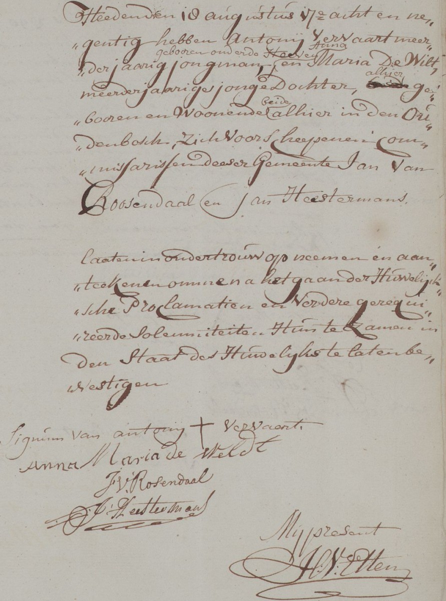 | 5. | v | Anna Maria (Maria) Johannes de WILD [9548]. Geb. op 08-10-1772 te Oudenbosch (bron: DTB Oudenbosch RK dopen inv nr 5). Overl. op 20-07-1817 te Oudenbosch op 44-jarige leeftijd (bron: BS Oudenbosch). Otr. [3098] op 18-08-1798 te Oudenbosch (bron: DTB Oudenbosch schepenbank trouwen inv nr 19). Echtgenoot is Antonie (Antonie) VERVAART [9553]. Geb. ±02-1770 te Hoeven, ged. (RK) op 17-02-1770 te Hoeven (get.: Cornelis Otto en Johanna Lazaroms) (bron: DTB Hoeven RK dopen inv nr 5). Overl. ? te ? Begr. ? te ? Zn. van Johannes (Johannes) VERVAART [11207] en Regina (Regina) Ottes ? [11206]. |
