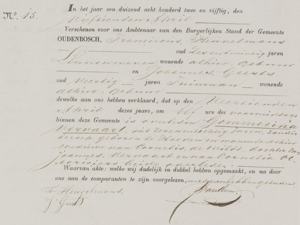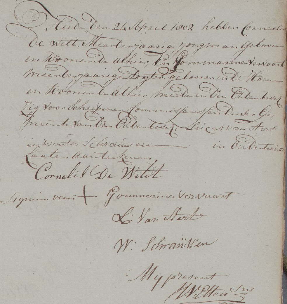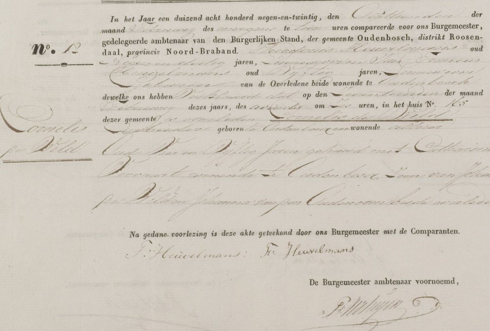 | 6. | m | Cornelis (Cornelis) Johannesz de WILD [9549]. Geb. op 01-02-1775 te Oudenbosch (bron: DTB Oudenbosch RK dopen inv nr 5). Overl. op 17-02-1829 te Oudenbosch op 54-jarige leeftijd (bron: BS Oudenbosch). Otr. [3099] op 24-04-1802 te Oudenbosch (bron: DTB Oudenbosch schepenbank trouwen inv nr 19). Echtgenote is Gommardina (Gomardina) Johannes VERVAART [9556]. Geb. ±09-1764 te Hoeven (bron: ?), ged. (RK) op 17-09-1764 te Hoeven (get.: Petrus Vervaart en Maria Adriana Cortsmit) (bron: DTB Hoeven RK dopen inv nr 5). Overl. op 14-04-1852 te Oudenbosch (bron: BS Oudenbosch). Dr. van Johannes (Johannes) VERVAART [9557] en Cornelia (Cornelia) Otto RESIERS [9558]. |