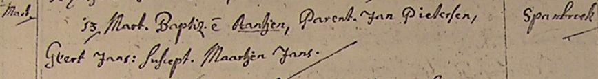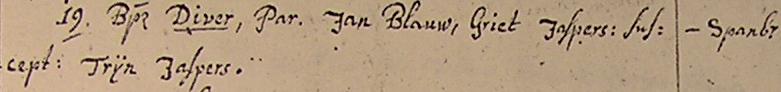 | 10. | v | Dieuwer (Dieuwer) Jans BLAAUW [7478]. Geb. ±02-1727 te Spanbroek (bron: ?), ged. (RK) op 19-02-1727 te Spanbroek (get.: Trijn Jaspers) (bron: DTB Opmeer inv nr 17). Overl. ? te ? Begr. ? te ? |