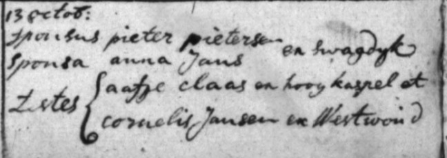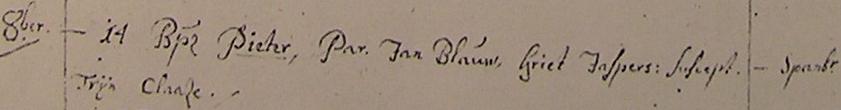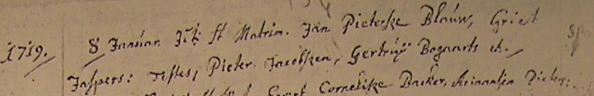 | 8. | m | Pieter (Pieter) Jansz BLAAUW [7477]. Geb. ±10-1723 te Spanbroek (bron: ?), ged. (RK) op 14-10-1723 te Spanbroek (get.: Trijn Klaas) (bron: DTB Opmeer inv nr 17). Overl. voor 1733 te ? (bron: ?), begr. ? te ? |