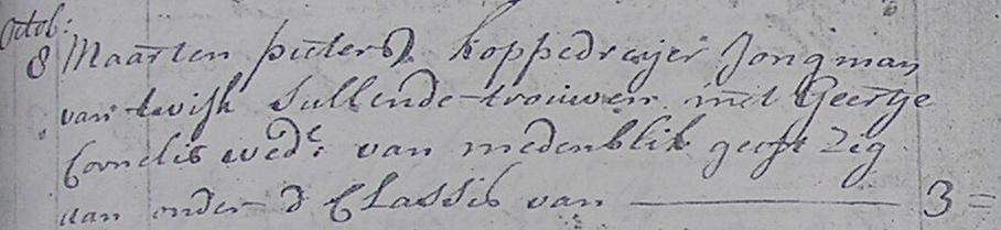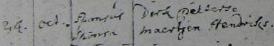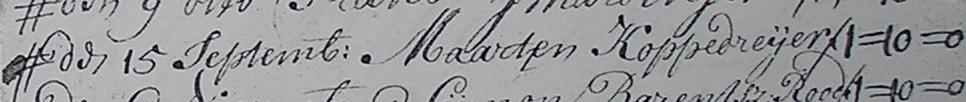 | 3. | m | Dirk (Dirk) Pietersz KOPPEDRAIJER [19422]. Geb. ±1710 te ? (bron: ?), ged. ? te ? Overl. ? te ? Begr. ? te ? Otr. [5874] op 08-10-1734 te Abbekerk (bron: DTB Abbekerk inv nr 13). Echtgenote is Maartje (Maartje) Hendriks ? [19423]. Geb. ? te ? Ged. ? te ? Overl. ? te ? Begr. ? te ? Dr. van Hendrik (Hendrik) ? [19424] en ? (?) ? [19425]. |