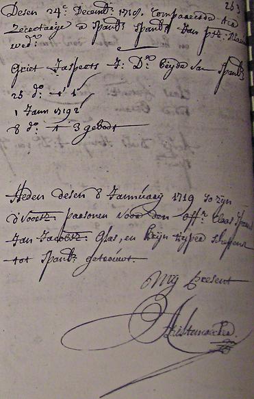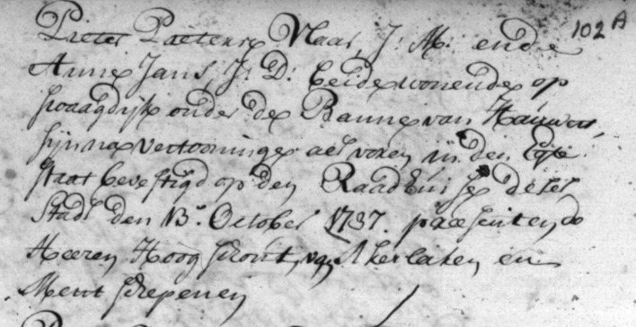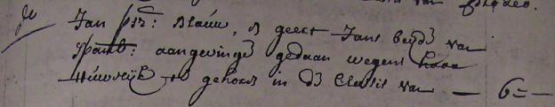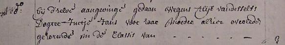 | 7. | v | Geertje (Geertje) Jans BLAAUW [29580]. Geb. ±08-1721 te ? (bron: ?), ged. (RK) op 26-08-1721 te Hoogwoud (bron: DTB Hoogwoud inv nr 7). Overl. ±10-1781 te Bangert (bron: DTB Hoorn inv nr 99), aangifte 30-10-1781 Otr. (1) [9803] ? te ? Tr. voor 1753 te ? (bron: ?), tr. kerk ? te ? Echtgenoot is ? (?) ? [32697]. Geb. ? te ? Ged. ? te ? Overl. ? te ? Begr. ? te ? Zn. van ? (?) ? [32698] en ? (?) ? [32699]. Otr. (2) [9802] op 31-08-1753 te Westwoud (bron: DTB Westwoud inv nr 14). Echtgenoot is Gerbrand (Gerbrand) Cornelisz SCHAGEN [32692]. Geb. ? te ? Ged. ? te ? Overl. ? te ? Begr. ? te ? Zn. van Cornelis (Cornelis) Gerbrandsz SCHAGEN [32693] en Geertje (Geertje) Klaas OUD [32694]. - Op 11-10-1722 testament van Reinoutje Tijs weduwe van Gerbrand Remmentsz Schagen. Vermeld worden Cornelis Gerbrandsz Schagen en diens vrouw Geertje Klaas Oud met kinderen Gerbrand Cornelisz Schagen en Pieter Cornelisz Schagen, Remment Gerbrandsz Schagen vader van Pieter Remmentsz Schagen en diens dochter Aafje Pieters, Aagje Gerbrandsz (Schagen) en Niesje Gerbrands (schagen) vrouw van Jan Pieters (bron: ONA Oosterblokker inv nr 373 fol 34) - Op 06-04-1758 boedelscheiding tussen de erfgenamen van Cornelis Gerbrandsz Schagen en Grietje Klaas Oud. Genoemd worden hun kinderen Gerbrand Cornelisz Schagen, Jan Cornelisz Schagen, Remment [Cornelisz] Schagen, Trijntje [Cornelis] Schagen met voogd Dirk Mooij de weudewe van Pieter Cornelisz Schagen genaamd Antje Alders. Daarnaast worden vermeld wijlen Pieter Elderts Biersteker met zijn vrouw Maartje Klaas OUdt en hun dochter Dieuwertje Pieters Biersteker (bron: ONA Oosterblokker inv nr 382 fol 51) |