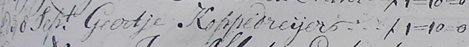 | 1. | v | Grietje (Grietje) Pieters KOPPEDRAIJER [6045] (code: 2^09+011), geb. ±1706 te Twisk (zie 523). |