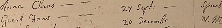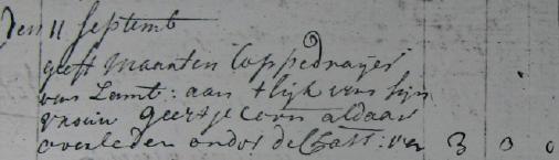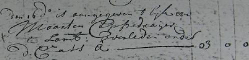 | 2. | m | Maarten (Maarten) Pietersz KOPPEDRAIJER [19415]. Geb. ±1709 te ? (bron: ?), ged. ? te ? Overl. ±09-1752 te Lambertschaag (bron: DTB Abbekerk inv nr 7), aangegeven op 16-09-1752 Otr. [5872] op 08-10-1734 te Abbekerk (bron: DTB Abbekerk inv nr 13). Echtgenote is Geertje (Geertje) Cornelis ? [19416]. Geb. ? te ? Ged. ? te ? Overl. ±09-1749 te Lambertschaag (aang.: Maarten Koppedraier te Lambertschaag echtgenoot van de overledene) (bron: DTB Abbekerk inv nr 7), aangegeven op 11-09-1749 Dr. van Cornelis (Cornelis) ? [19417] en ? (?) ? [19418]. Geertje Cornelis is weduwe: Otr.[5873] op ? te ?, tr. op ? te ?, tr.kerk op ? te ?, met ? (?) ? [19419], geb. op ? te ?, ged. op ?, te ?, overl. op ? te ?, begr. op ? te ?, zn. van ? (?) ? [19420] en ? (?) ? [19421]. |