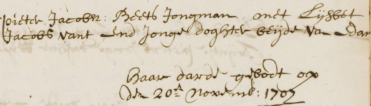 | 2. | m | Jacob (Jacob) Pietersz BEETS (Doets) [21495]. Geb. ±1682 te ? (bron: ?), ged. ? te ? Overl. op 24-08-1728 te ? (bron: ?), begr. ? te ? - Op 27-05-1710 vermeld in ORA inv nr 4057 (bron: ?) - Op 23-11-1723 wordt Pieter Pietersz Eijs nagelaten zoon vermeld in het weeskamerarchief van Edam. Voogden zijn Jacob Pietersz Beets en Jan Groenhart (bron: ?) - Op 06-04-1743 genoemd in ONA inv nr 658. (bron: ?). Otr. [6494] op 27-11-1707 te Edam (bron: DTB Edam inv nr 35), 3de gebod Echtgenote is Grietje (Grietje) Jacobs ? [21537]. Geb. ? te ? Ged. ? te ? Overl. ? te ? Begr. ? te ? Dr. van Jacob (Jacob) ? [21538] en ? (?) ? [21539]. |