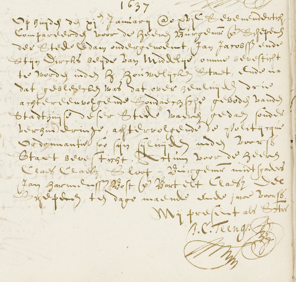 | 3. | v | Neeltje (Neeltje) Jans HARTOG [29850]. Geb. ±1647 te ? (bron: ?), ged. ? te ? Overl. ? te ? Begr. ? te ? Otr. [1089] ? Tr. op 25-01-1671 te Edam (bron: DTB Edam inv nr 38). Echtgenoot is Klaas (Klaas) Jacobsz HARTOG [29843]. Geb. ±1646 te ? (bron: ?), ged. ? te ? Overl. ? te ? Begr. ? te ? Zn. van Jacob (Jacob) Gerritsz HARTOG [29884] en Trijntje (Trijntje) Jans HENS [29883]. - Op 28-11-1692 verklaring van Dirk en Jacob Jansz Hartog voor hunzelf als erfgenamen van hun vader Jan Jacobsz Hartog en Cornelis Dirksz als voogd over de kinderen van wijlen Klaes Jacobsz Hartogh [man van Neeltje Jans Hartog] mede erfgenaam van Jan Jacobsz Hartog. Alle woonende tot Middelie. Zij hebben een losrentebrief van 500 gld verkocht aan Dirk Maartensz Bark tot Middelie. Get.: Cornelis Jansz Doets en Pouwels Klaasz Plas. (bron: ? (ONA Edam inv nr 591)). - Op 22-01-1671 huwelijkse voorwaarden Klaas Jacobsz Hartog geassisteerd door zijn oom Jacob Klaasz Baan en Reijer Jansz van middelie en Neeltje Jansz geassisteerd door haar vader Jan Jacobs Hartog (bron: ? (ONA Edam inv nr 531) - In 1673 wordt ene Neeltje Hartog vermeld te Middelie in het register van de 200ste penning (bron: ? (OA Edam inv nr 274)) [Jacob Klaasz Baan was gehuwd met Grietje Gerritsz]. |