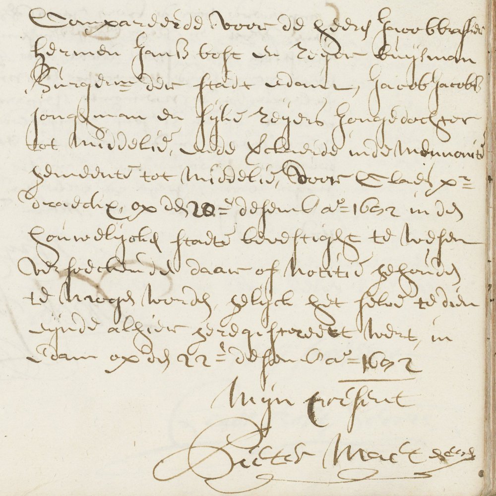 | 3. | v | Neeltje (Neeltje) Reijers ? [29870]. Geb. ±1670 te Middelie (bron: ?), ged. ? te ? Overl. ? te ? Begr. ? te ? - Op 30-01-1680 bewijs van vaders erfenis. Dit voor de kinderen van wijlen Reijer Jan en Griet Jans. Genoemd worden Jan, Sijke, Jan Willem, Neeltje en Trijntje vrouw van Jacob Jansz Hartog. Als voogden worden genoemd Maarten Pietersz Broek en Klaas Jacobsz Hartog (bron: ? (ORA Edam inv nr 3988)). Otr. [8972] ? te ? Tr. op 05-12-1694 te Edam (bron: DTB Edam inv nr 38). Echtgenoot is Bouwe (Bouwe) Pietersz ? [29872]. Geb. ±1669 te Middelie (bron: ?), ged. ? te ? Overl. ? te ? Begr. ? te ? Zn. van Pieter (Pieter) Remmitsz ? [29873] en Trijn (Trijn) Bouwe ? [29874]. - Op 31-05-1681 registratie van de nalatenschap van wijlen Pieter Remmitsz en Trijntje Bouwensz voor hun nagelaten kinderen Jongejan, Remmet en Bouwe. Als voogden worden vermeld Jan Remmetsz Edel en Jan Cornelisz Hartogh. Het betreft o.a. een huis op het noordeind van Middelie belend met Trijn Klaas ten zuiden en Klaas Jansz Doets ten noorden, f 150.- in een obligatie van f 600.- in dato 01-06-1648 die onder Remmit Maartensz tot Middelie is berustende en f 100.- in een obligatie van f 300.- waarvan de andere f200.- toekomt aan de de weduwe van Pieter Jacobsz Melis, welke brief bij de weduwe is berustende. (bron: ? (ORA Edam inv nr 3989)? |