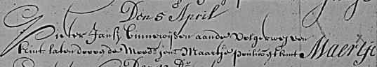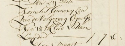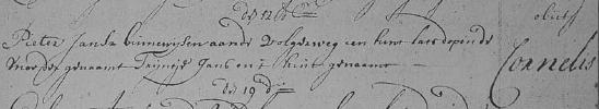 | 8. | v | Maartje (Maartje) Pieters BINNEWIJZEND [13911]. Geb. ±04-1713 te ? (bron: ?), ged. (NG) op 12-04-1713 te Beemster (bron: DTB Beemster inv nr 2a). Overl. voor 1717 te ? (bron: ?), begr. ? te ? |