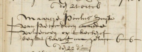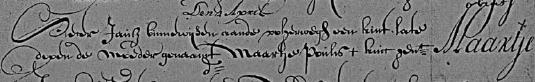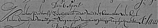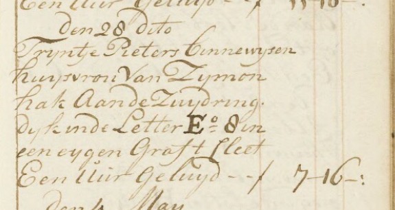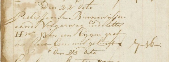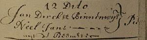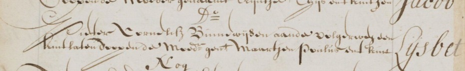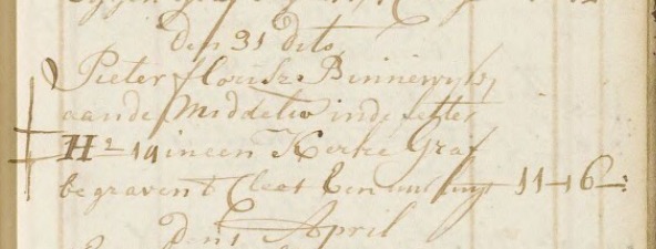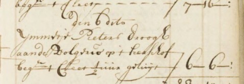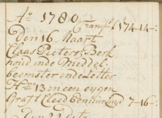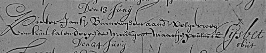 | 5. | v | Lijsbeth (Lijsbeth) Pieters BINNEWIJZEND [13907]. Geb. ±06-1708 te ? (bron: ?), ged. (NG) op 13-06-1708 te Beemster (bron: DTB Beemster inv nr 2a). Overl. ±06-1708 te ? (bron: ?), begr. ? te ? - Op 22-05-1737 ontvangt Lijsbet Pieters Droog vrouw van Klaas Berkhout f500,- uit de erfenis van haar moeder. Dit volgens ORA Beemster inv nr 4082 fol 355 (bron: ?). |