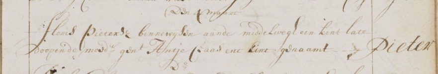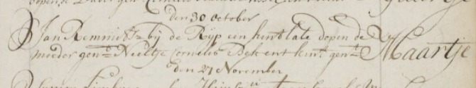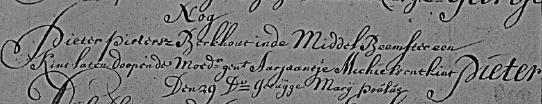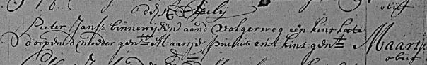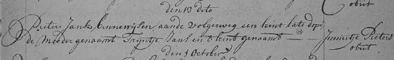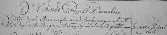 | 9. | v | Maartje (Maartje) Pieters BINNEWIJZEND [13912]. Geb. ±07-1717 te ? (bron: ?), ged. (NG) op 04-07-1717 te Beemster (bron: DTB Beemster inv nr 2a). Overl. ±07-1717 te ? (bron: ?), begr. ? te ? |